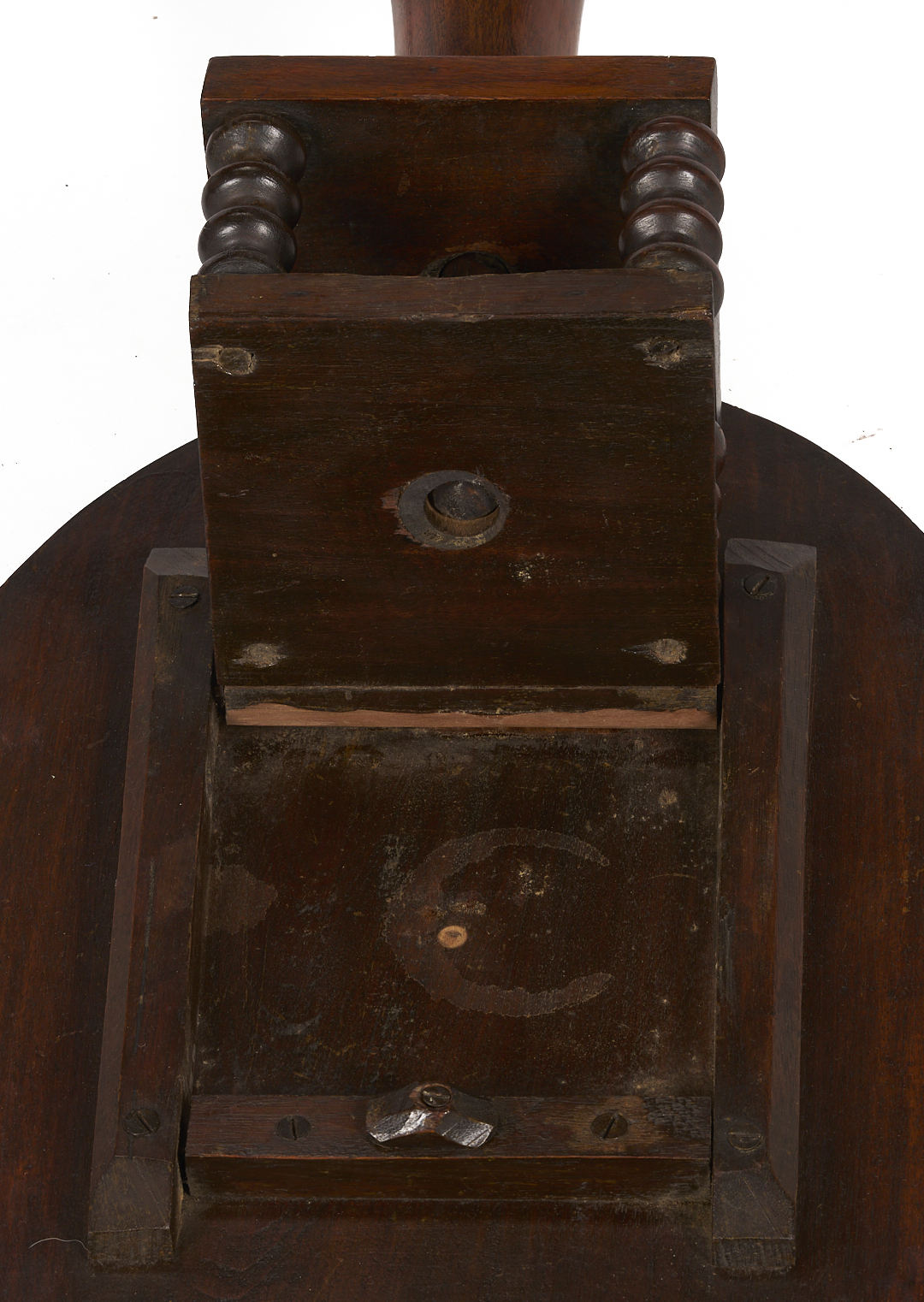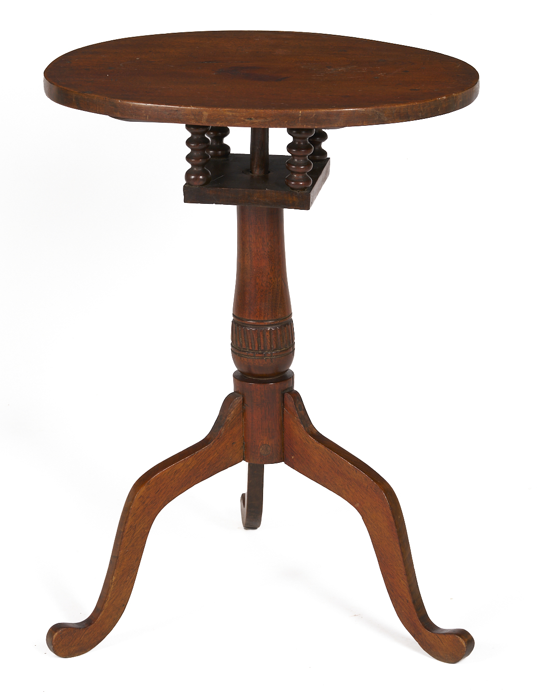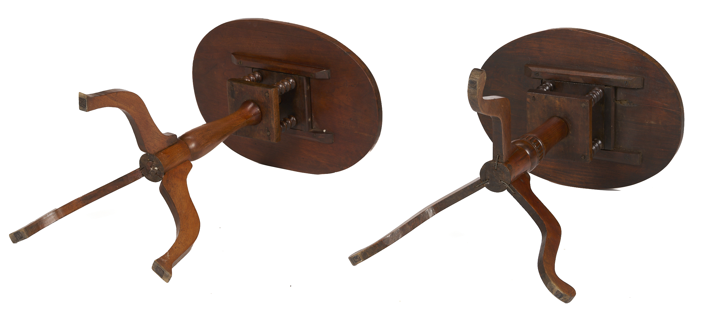 Pair of East Tennessee, Blount County, walnut bird cage candle stands. Both with oval tops above disc turned birdcage supports, over baluster standards transitioning to a tripod base with curved or slipper-style feet. One stand with additional carving to the circumference of the lower standard. Larger stand feet attached by dovetails. Both stands possibly made by the same hand. 29 in. H x 14 1/2 in. W x 21 7/8 in. D and 26 7/8 in. H x 14 7/8 in. W x 19 7/8 in. D. Third quarter of the 19th century.