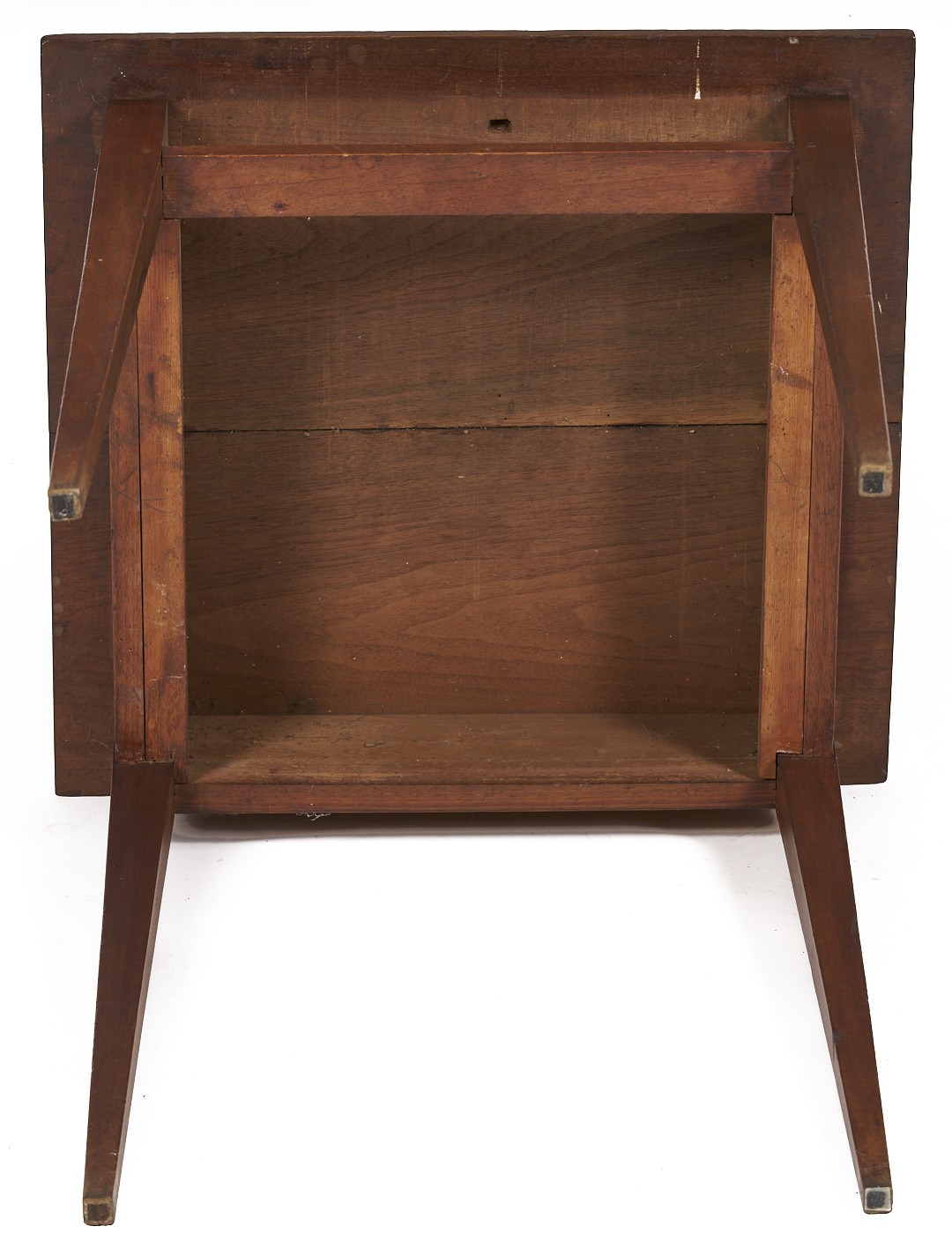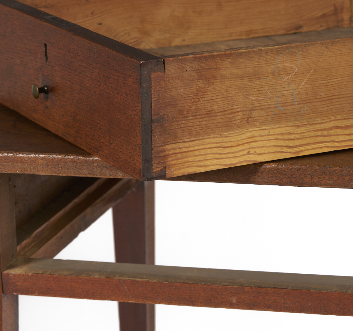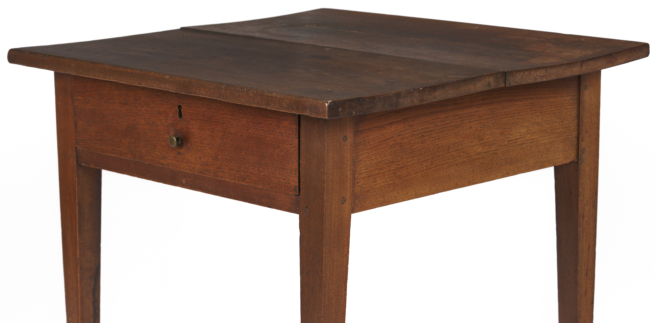 East Tennessee, Blount County, one drawer Hepplewhite table, walnut primary, yellow pine secondary. Overhanging plain top above one dovetailed drawer with a brass pull, resting on tall tapering Hepplewhite legs. 29 3/4 in. H x 3 3/4 in. W x 22 3/8 in. D. 1st qtr. 19th century.