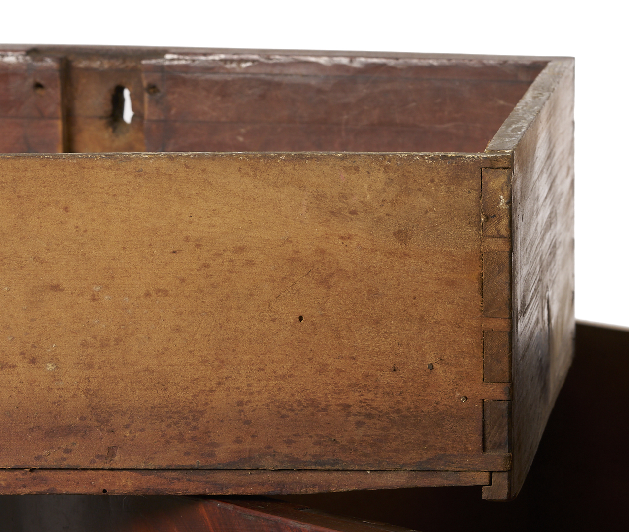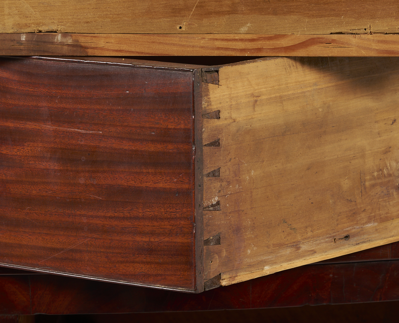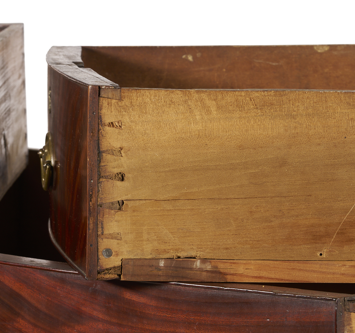 Overall good condition with minor surface wear. Brasses are not original. One backboard appears to be an old replacement, minor buildup of drawer sides, locks missing.