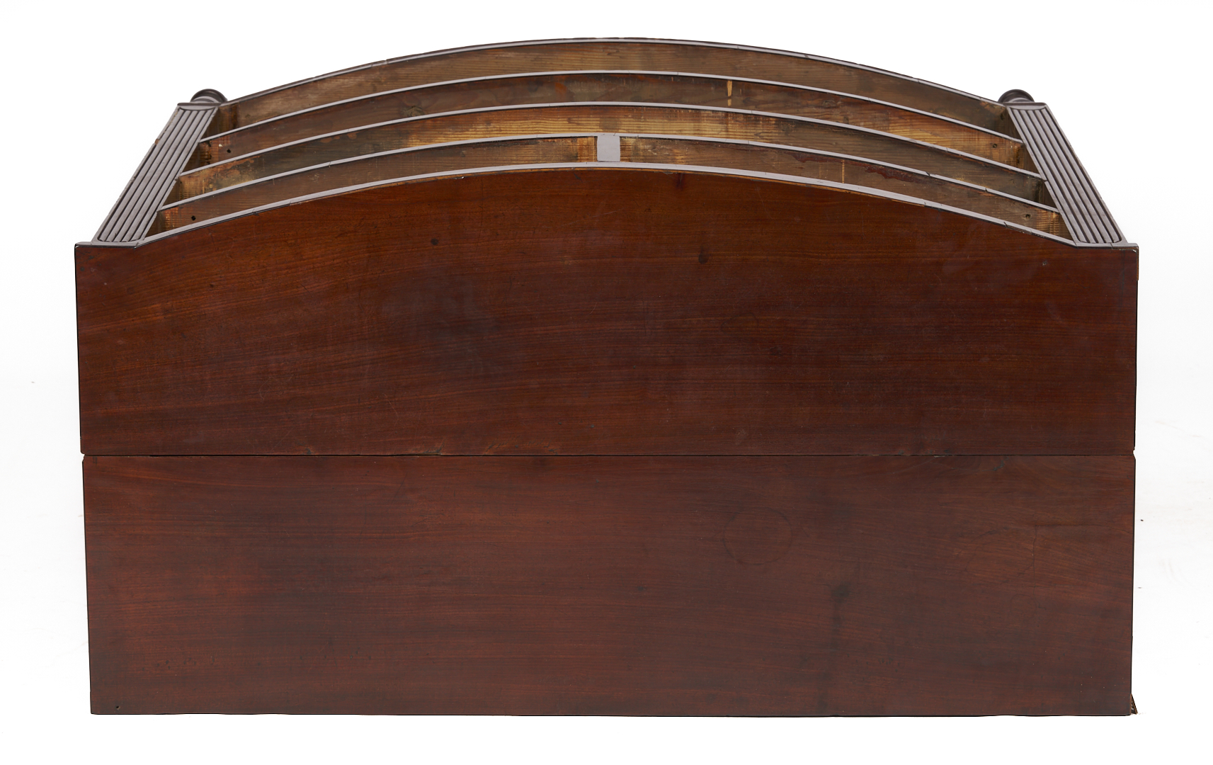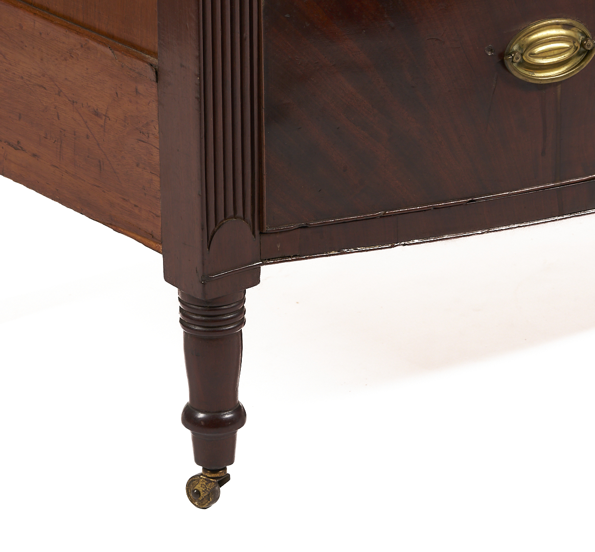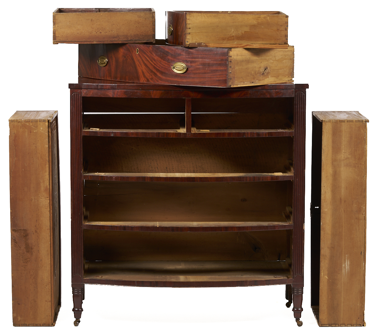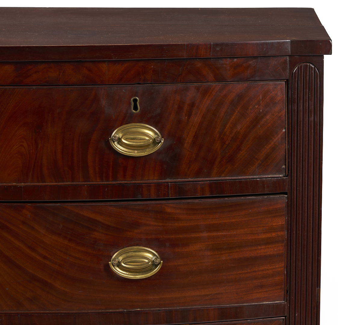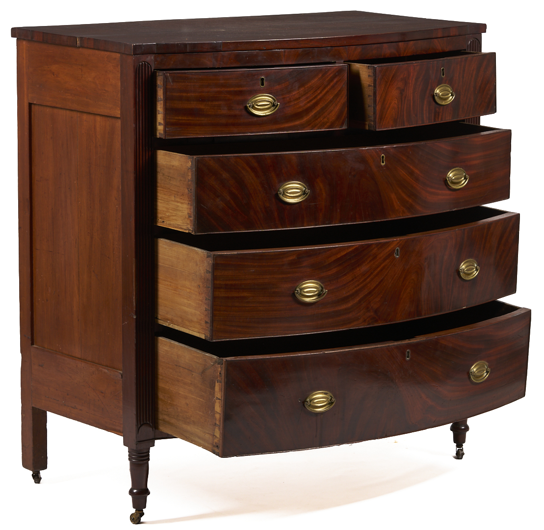 Virginia Federal bowfront chest of drawers, mahogany and figured mahogany veneers, with poplar and yellow pine secondary. Consisting of a single board top over a conforming case with two short dovetailed drawers over three full-length graduated dovetailed drawers, flanked by reeded stiles terminating in a lunette design at the base, and resting on turned and tapered feet fitted with castors. Illegible signature en verso. 44 1/8 in. H x 42 5/8 in. W x 22 3/4 in. D. Circa 1820.