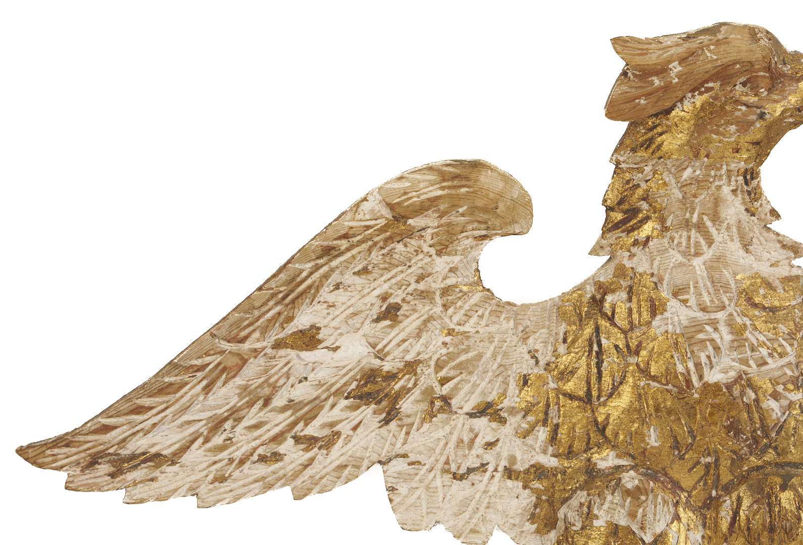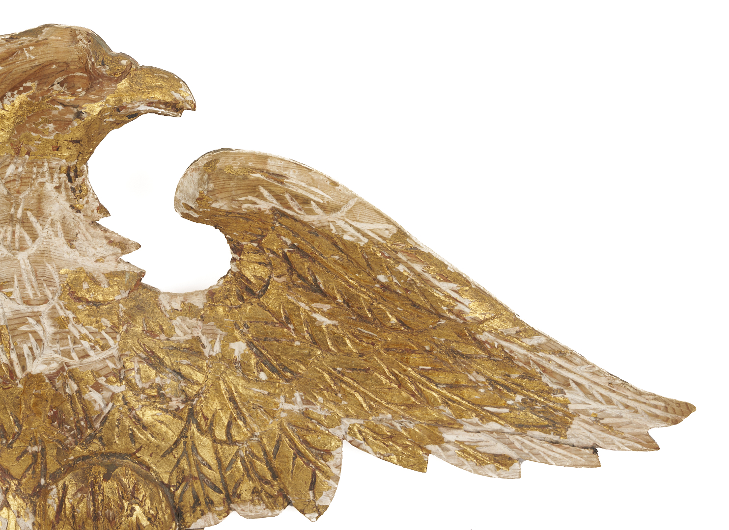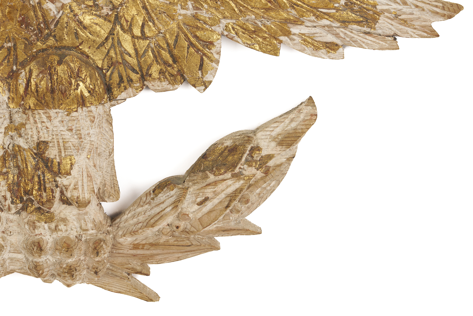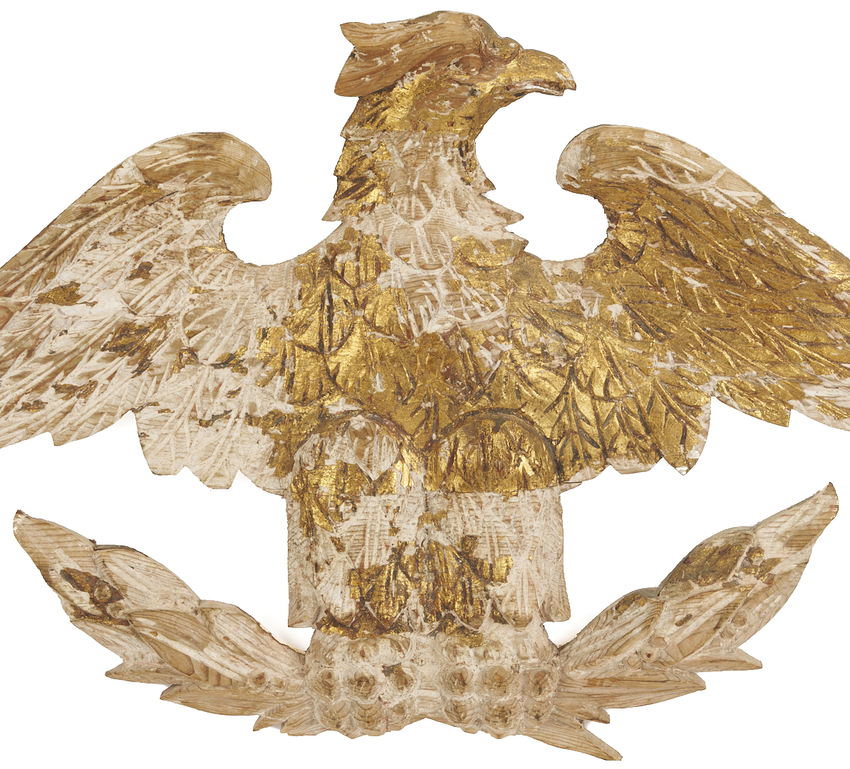 Carved and gilt wood plaque depicting an American Federal Eagle with open wings, grasping a laurel sprig. With later gilding primarily extant on right wing, body, and head. 14 in. H x 24 in. W x 1 1/2 in. D. 19th century.