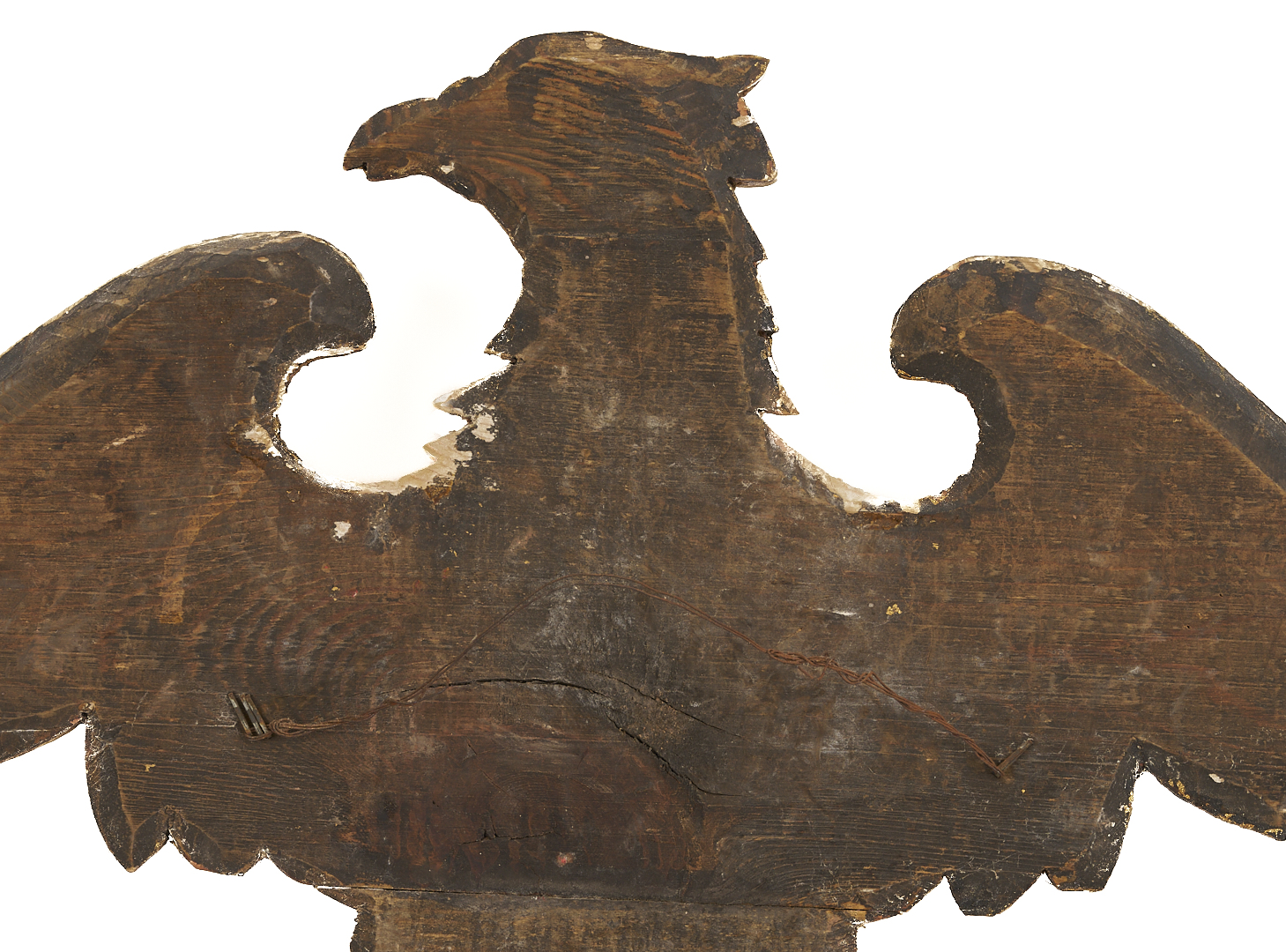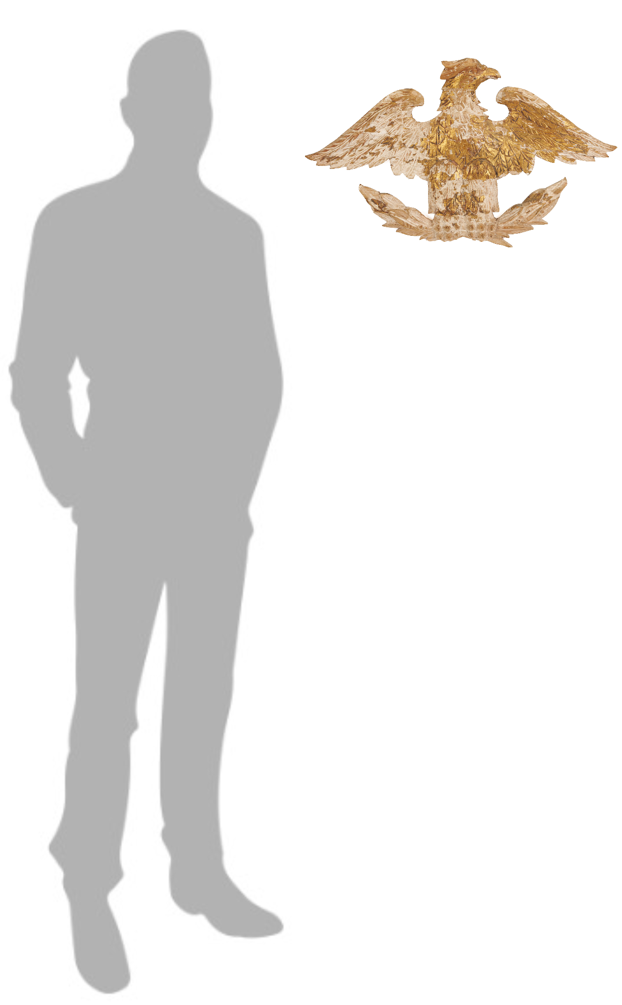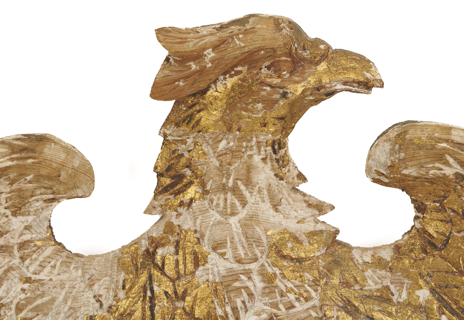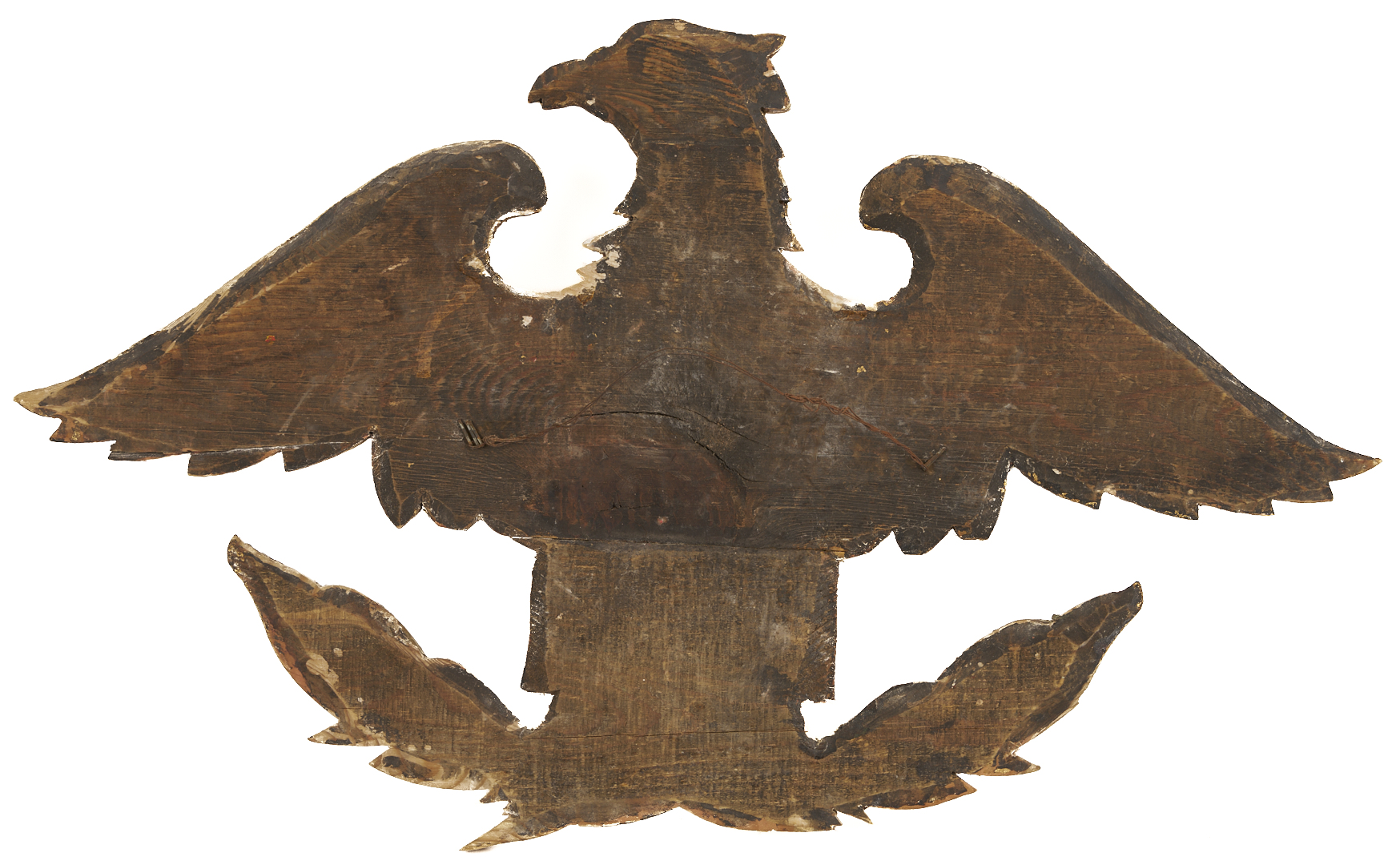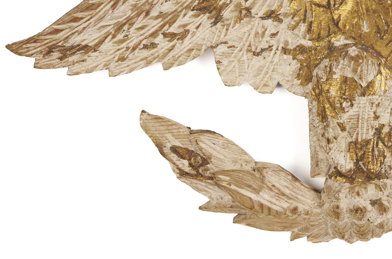 Carved and gilt wood plaque depicting an American Federal Eagle with open wings, grasping a laurel sprig. With later gilding primarily extant on right wing, body, and head. 14 in. H x 24 in. W x 1 1/2 in. D. 19th century.