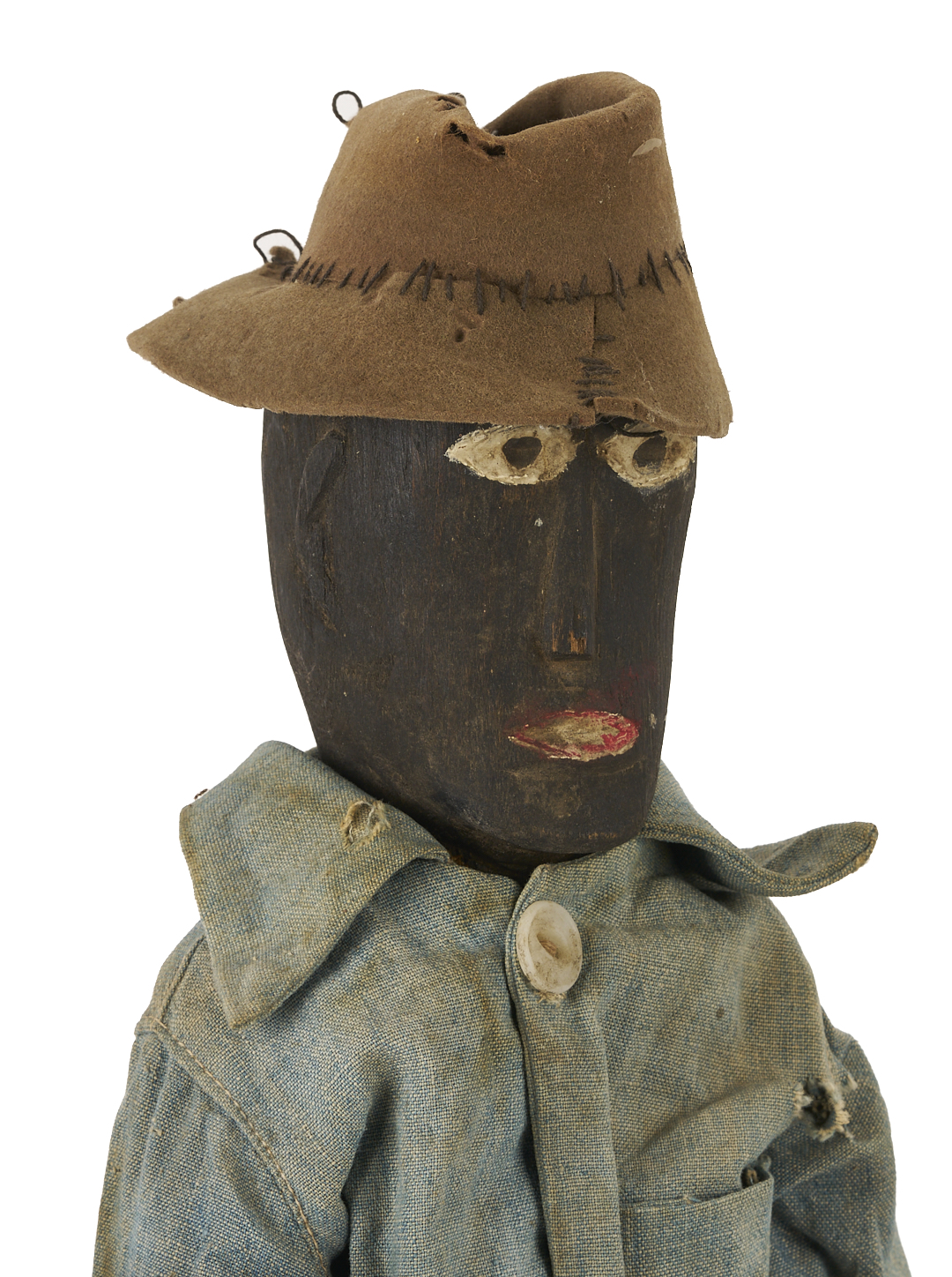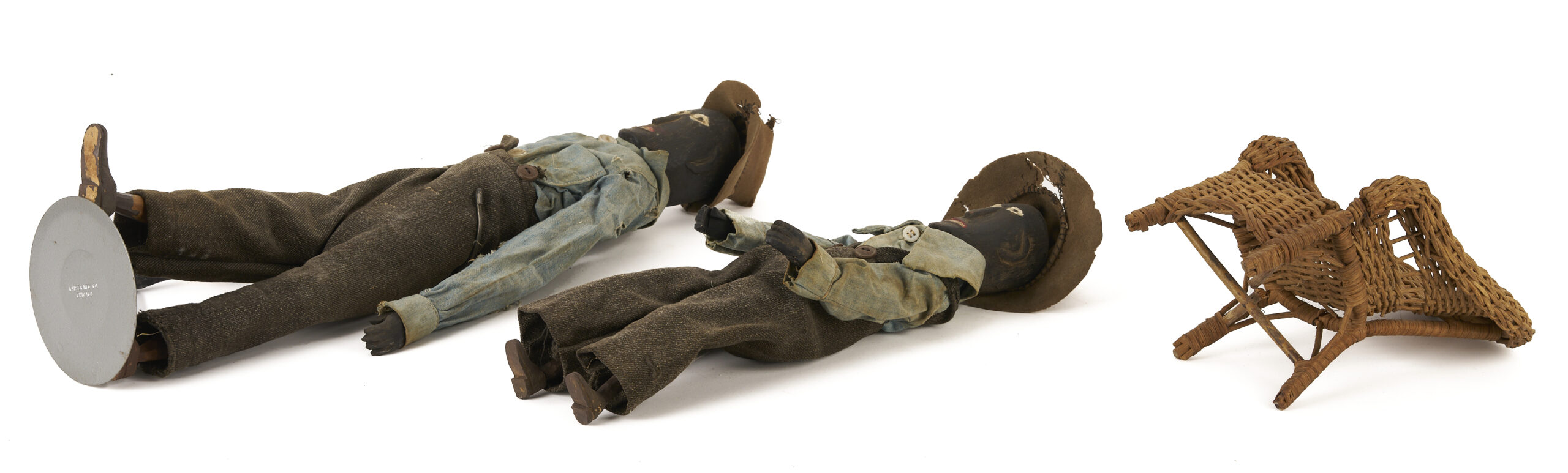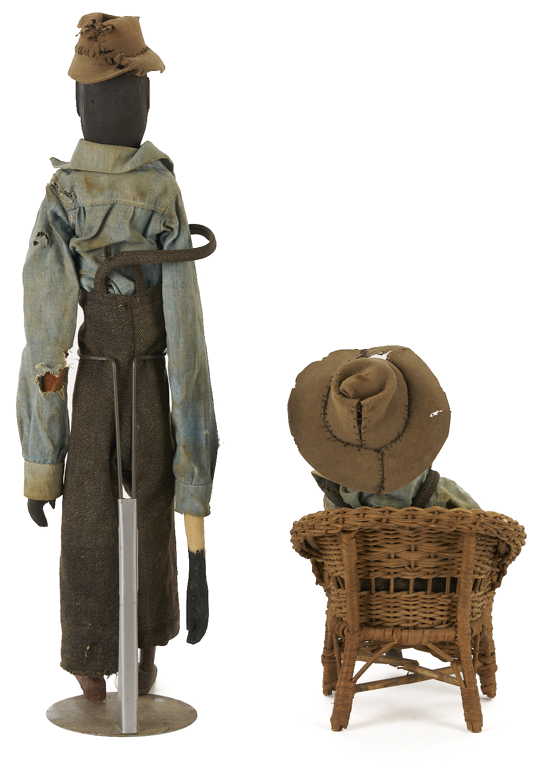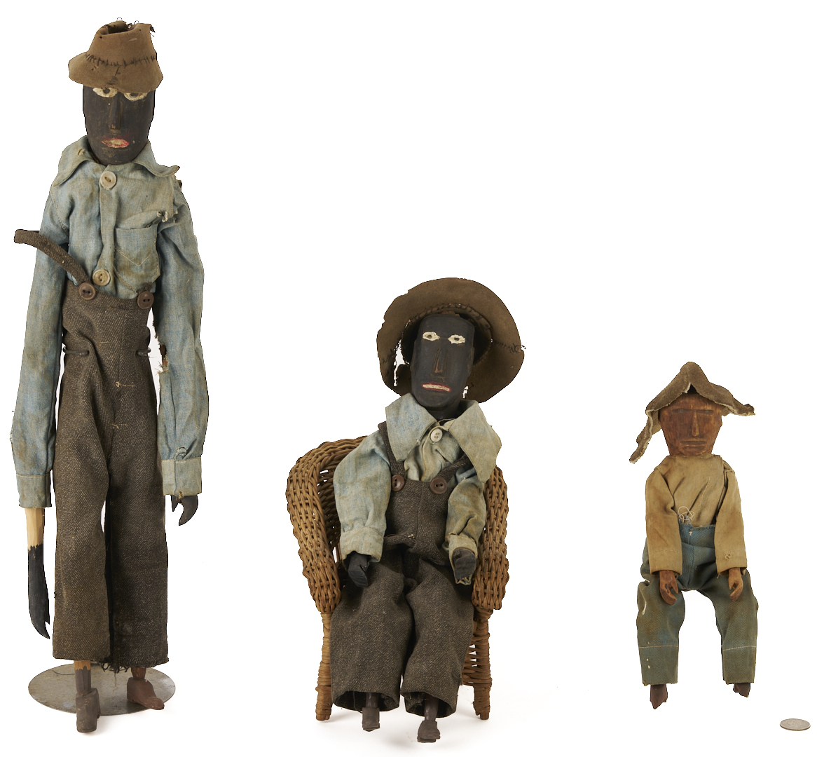 Group of three (3) East Tennessee, Blount County, carved and painted folk art dolls, all male, including two African American figures and one Caucasian figure, each attired in homespun work clothing, including overalls and hats. Unsigned. Ranging in size from 6 3/4 in. H x 3 in. D to 21 in H x 6 in. W. 20th century. Note: By oral history, these were created by an African American family residing in Blount County, TN.