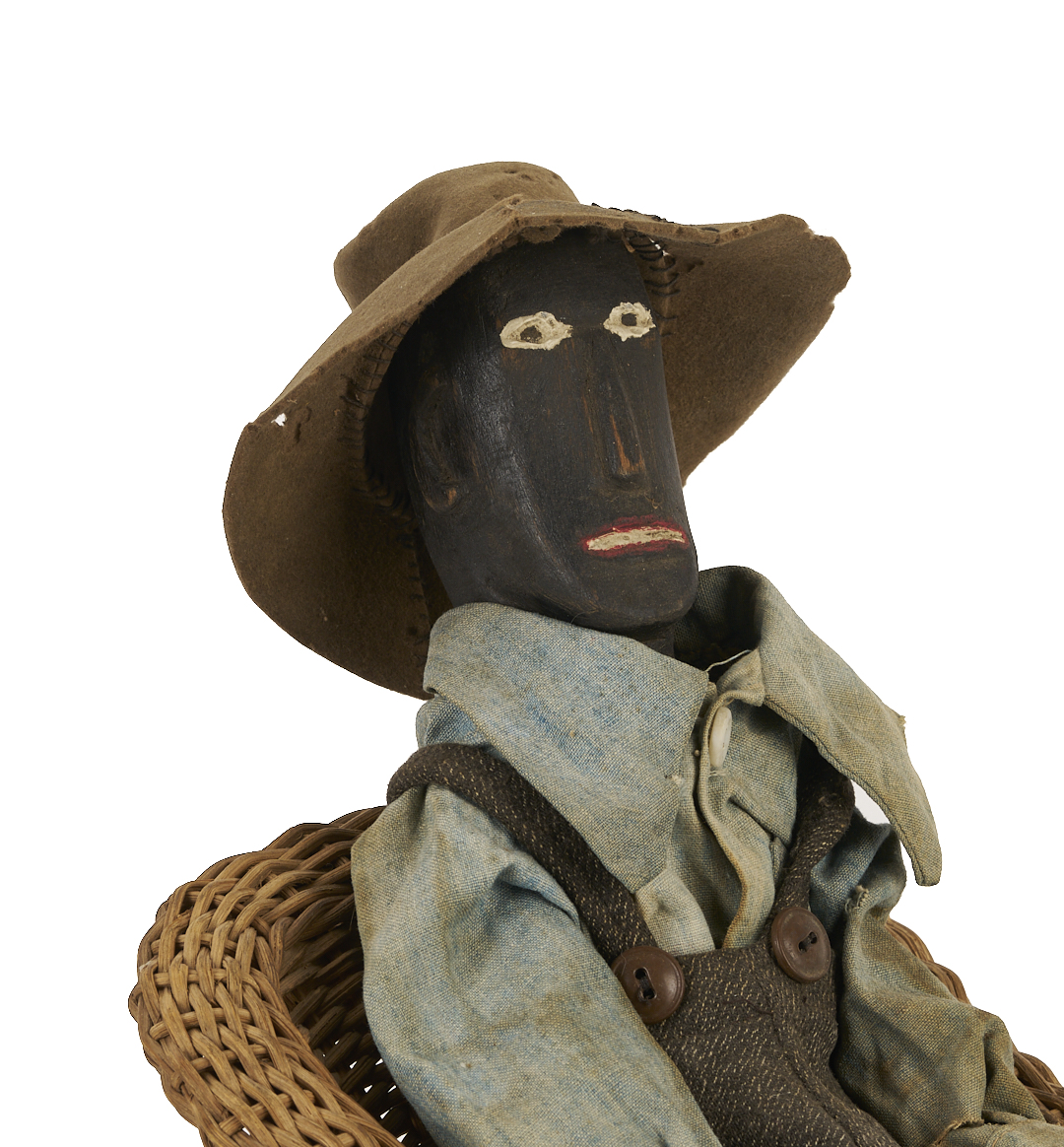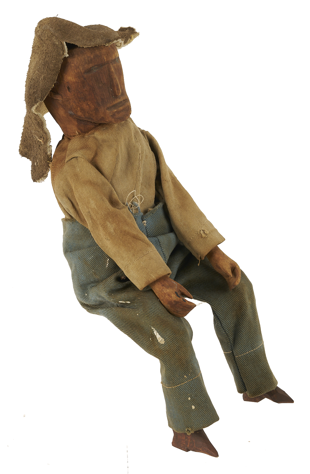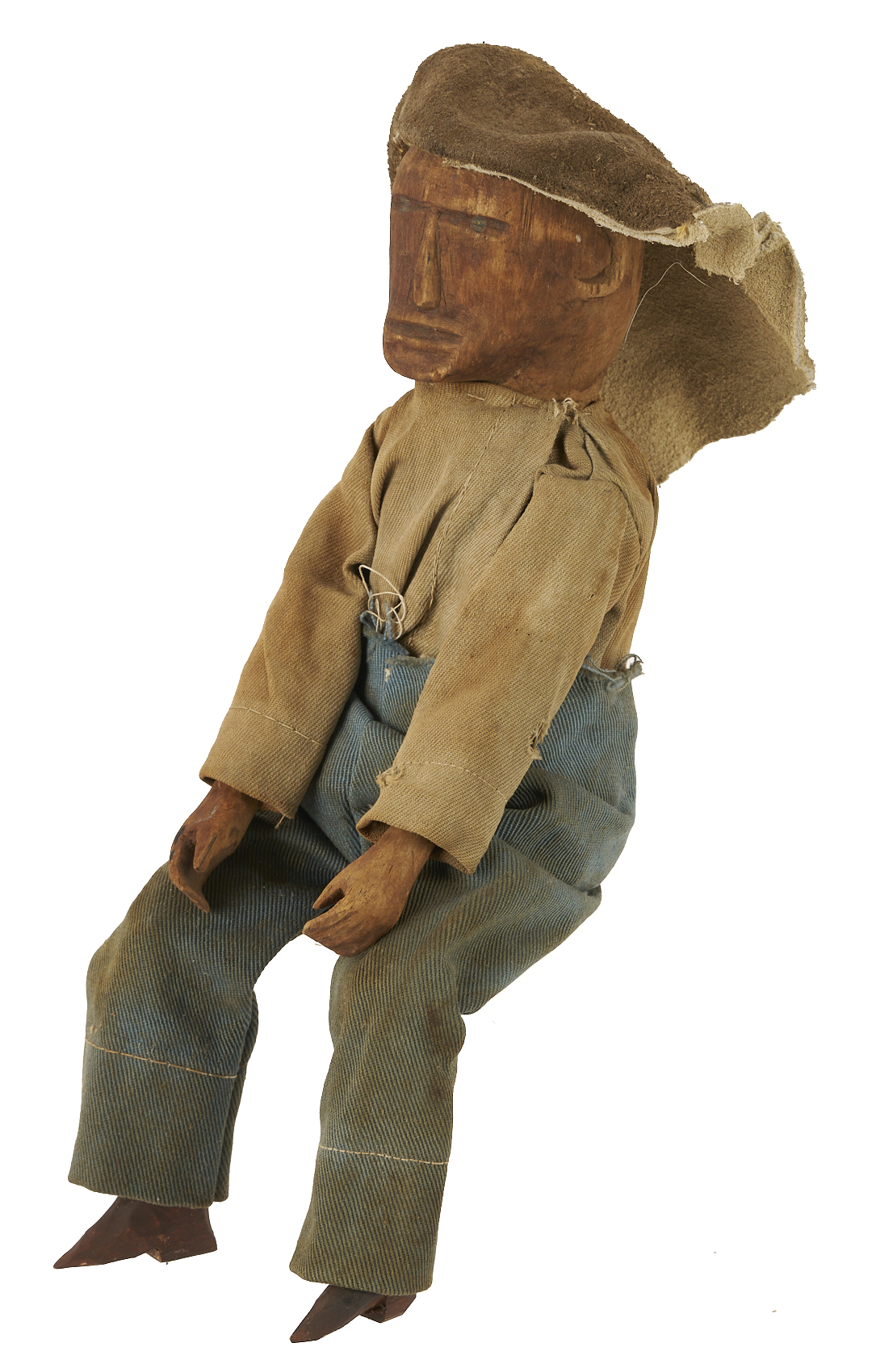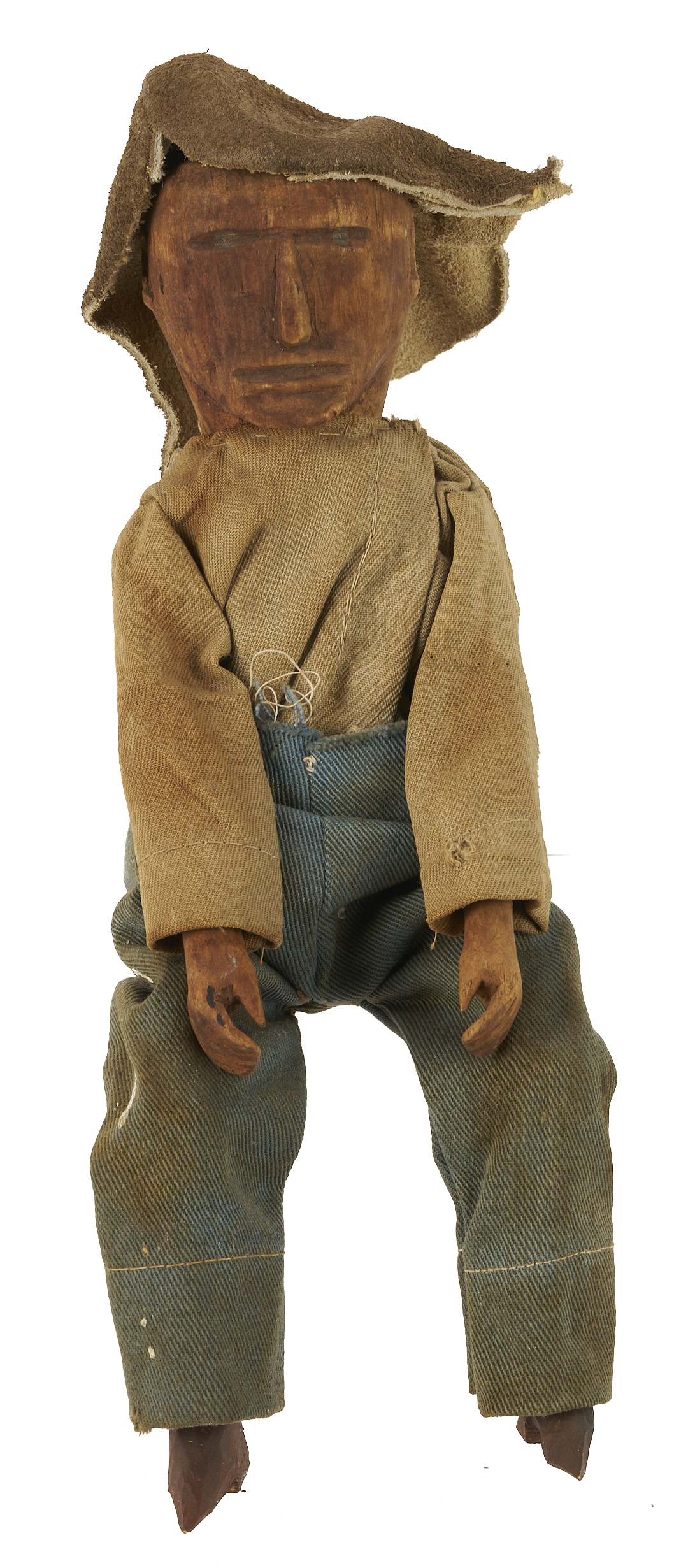 Group of three (3) East Tennessee, Blount County, carved and painted folk art dolls, all male, including two African American figures and one Caucasian figure, each attired in homespun work clothing, including overalls and hats. Unsigned. Ranging in size from 6 3/4 in. H x 3 in. D to 21 in H x 6 in. W. 20th century. Note: By oral history, these were created by an African American family residing in Blount County, TN.