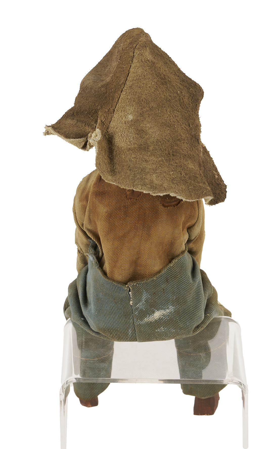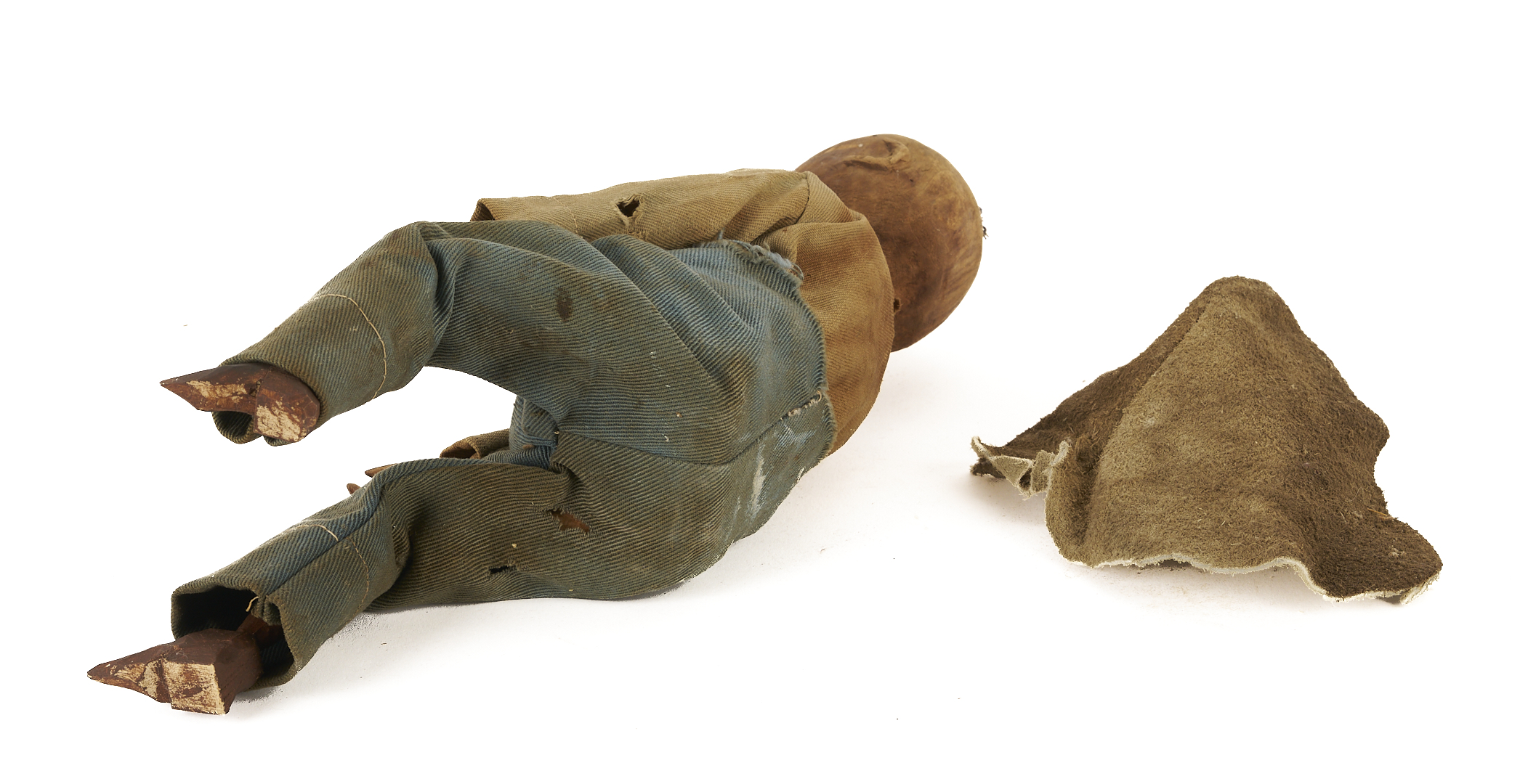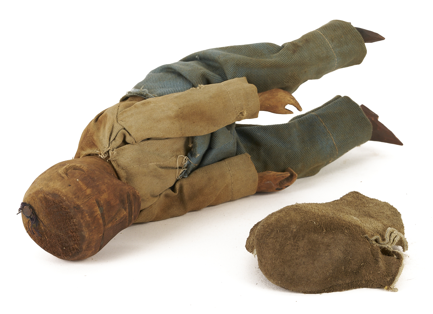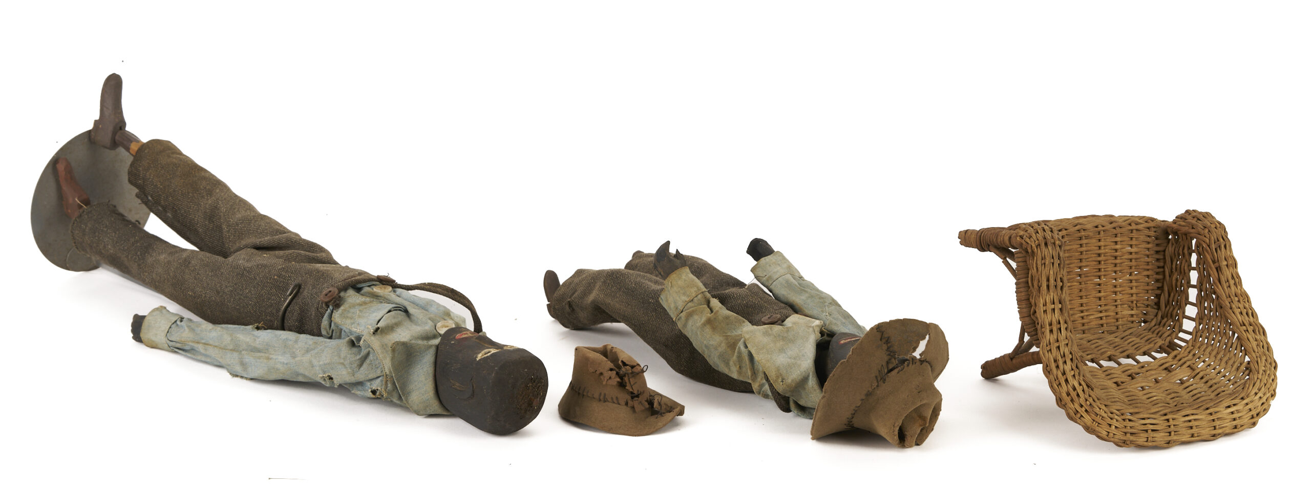 Group of three (3) East Tennessee, Blount County, carved and painted folk art dolls, all male, including two African American figures and one Caucasian figure, each attired in homespun work clothing, including overalls and hats. Unsigned. Ranging in size from 6 3/4 in. H x 3 in. D to 21 in H x 6 in. W. 20th century. Note: By oral history, these were created by an African American family residing in Blount County, TN.