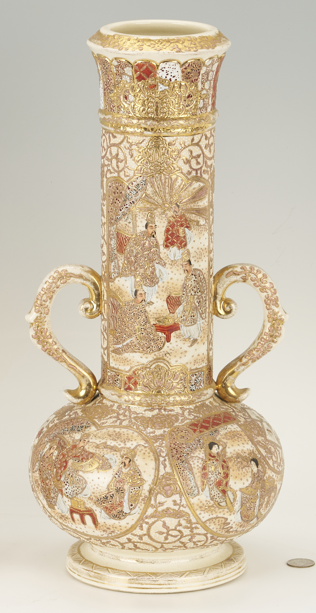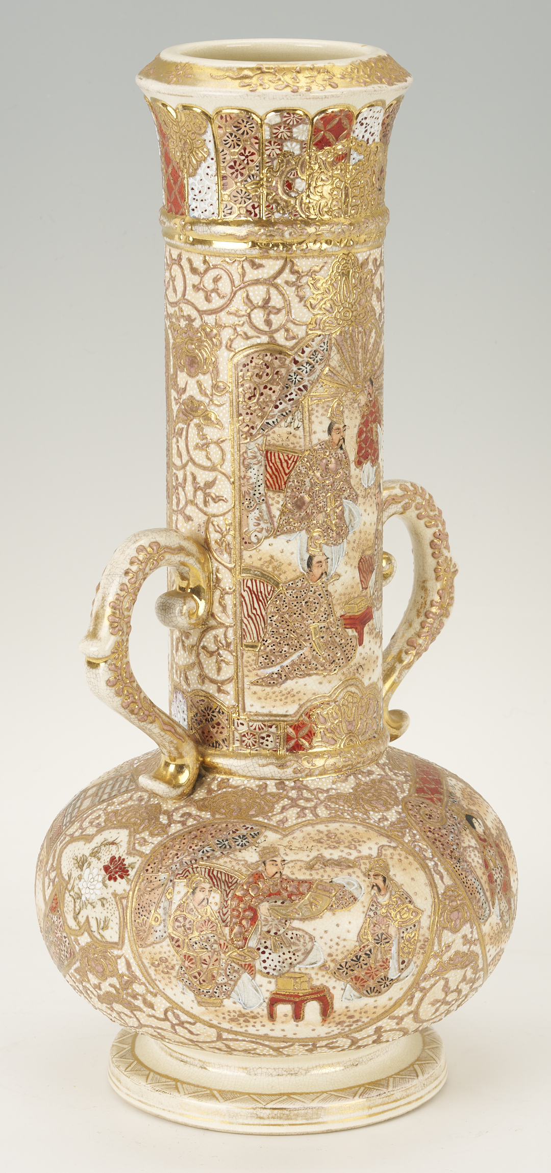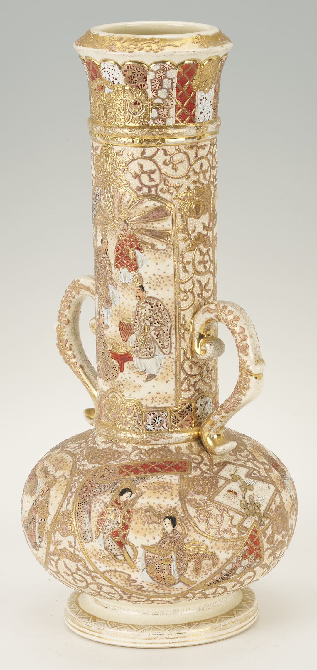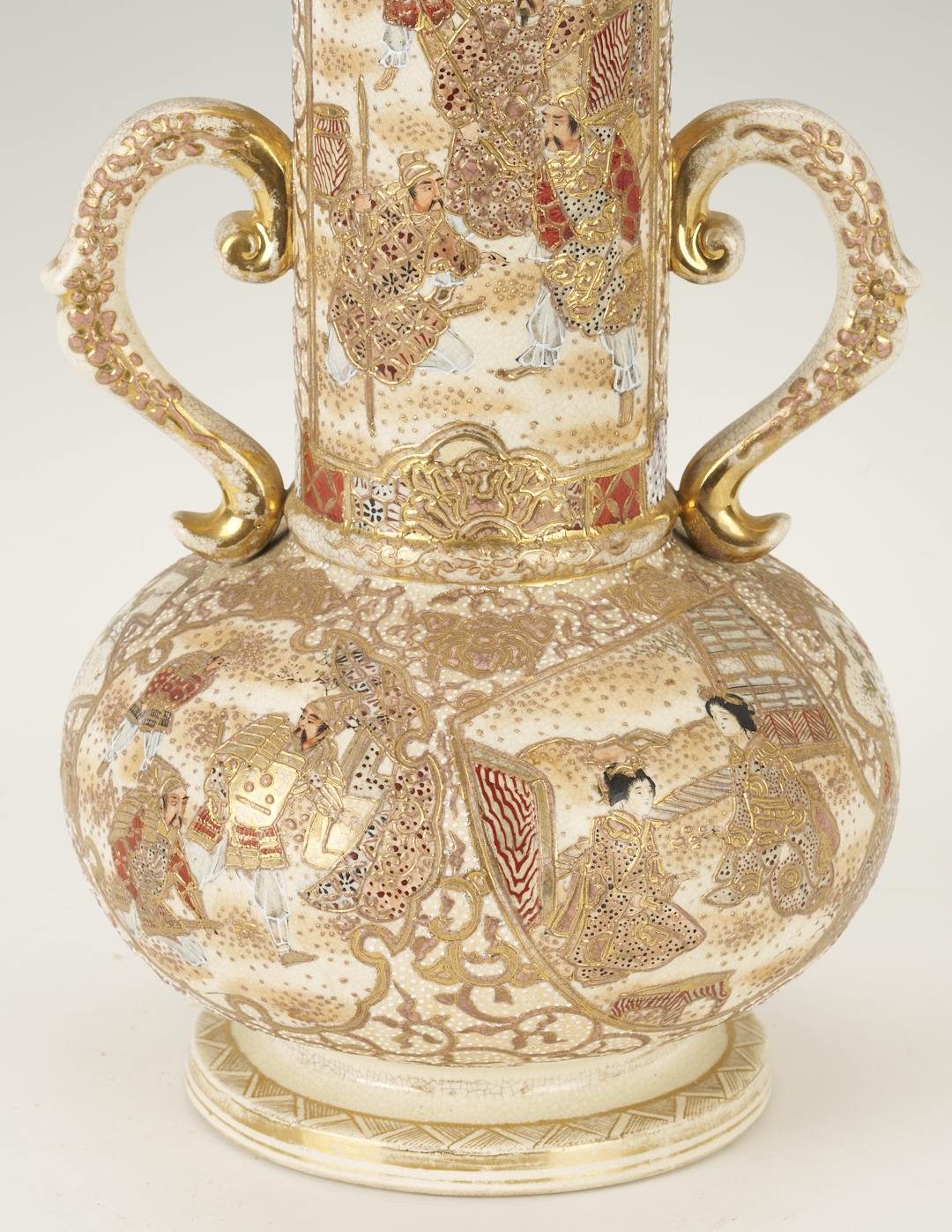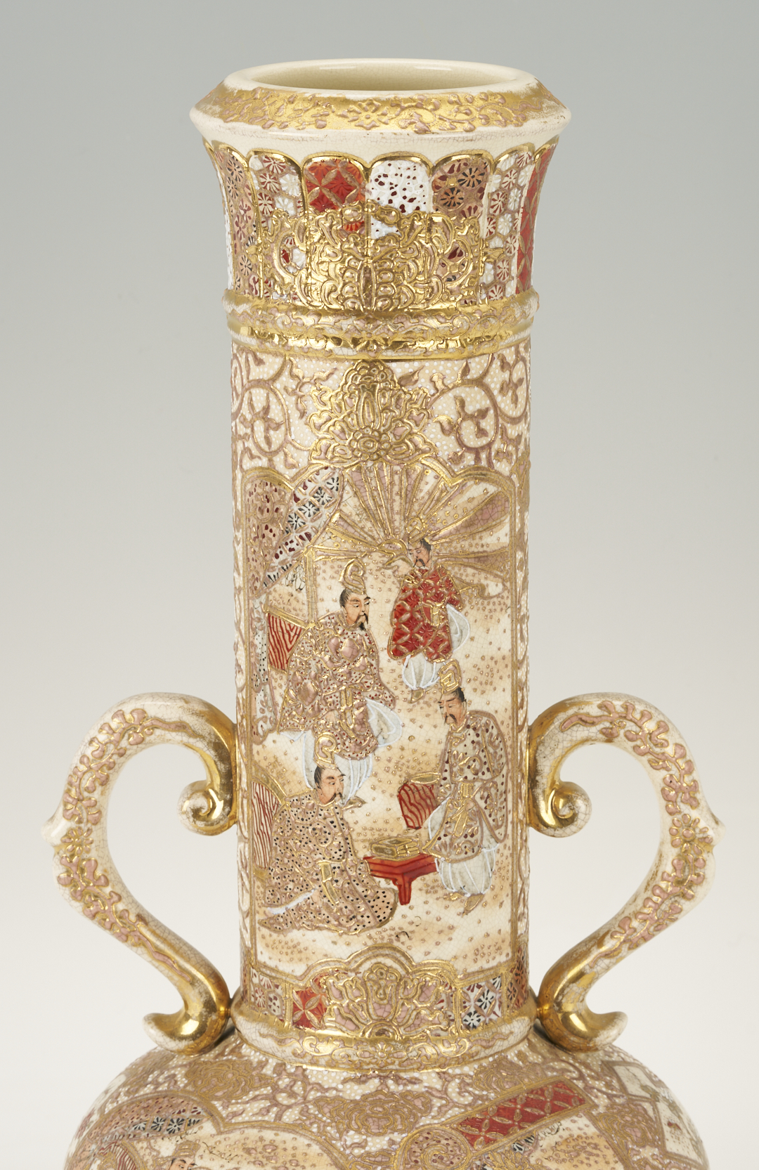 Three (3) Satsuma porcelain vases of unusual tall double handled form, all featuring polychrome enameled vignettes of court figures, the largest signed to base in gilt calligraphy. Largest vase: 18 1/2 in. H. Smaller vases: 12 3/4 in. H. Japanese, late 19th to early 20th centuries.