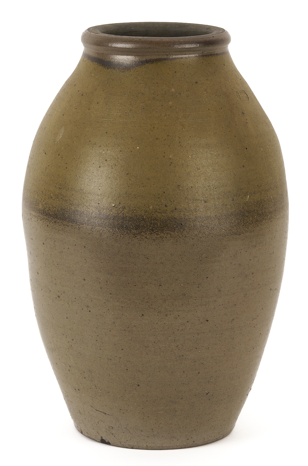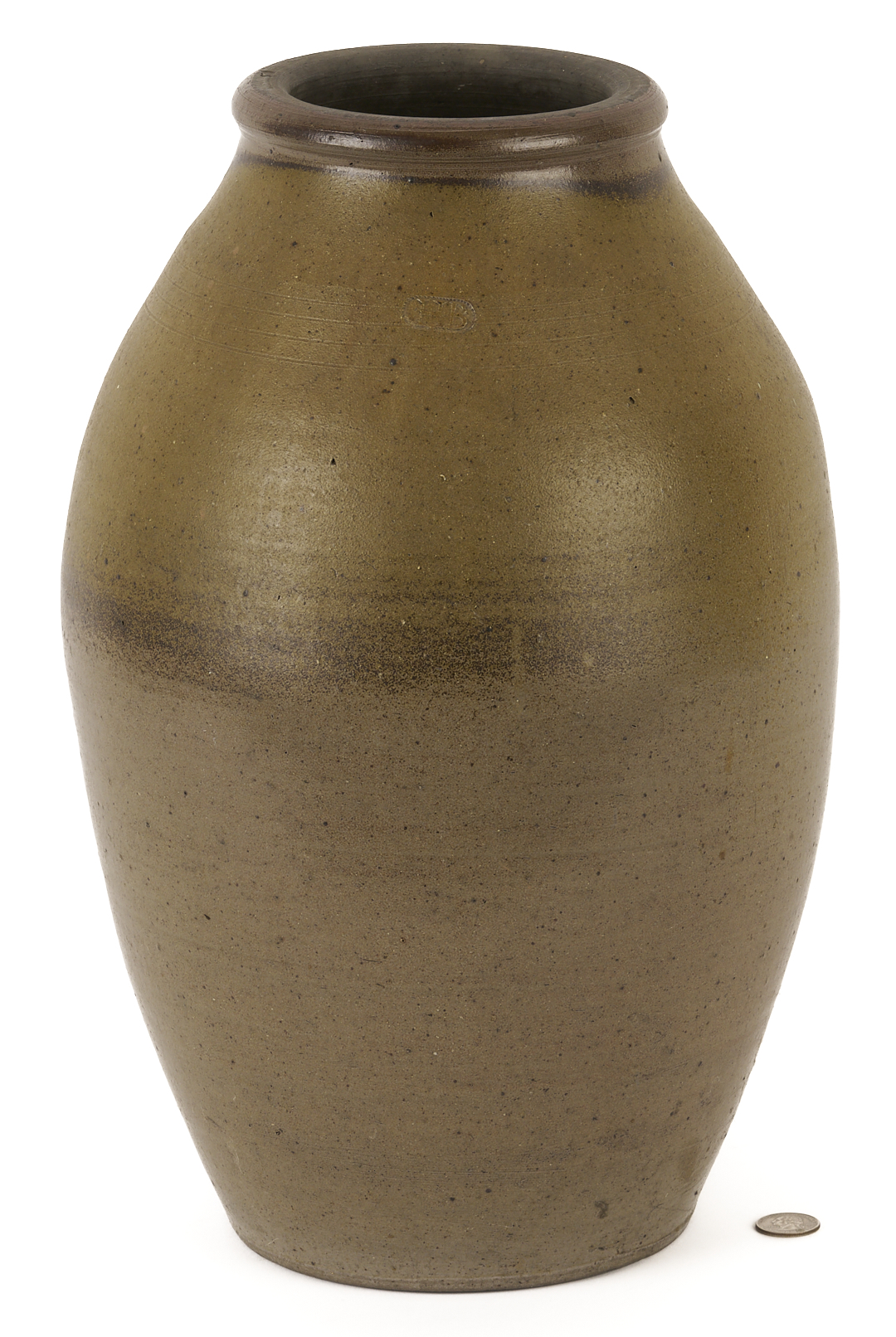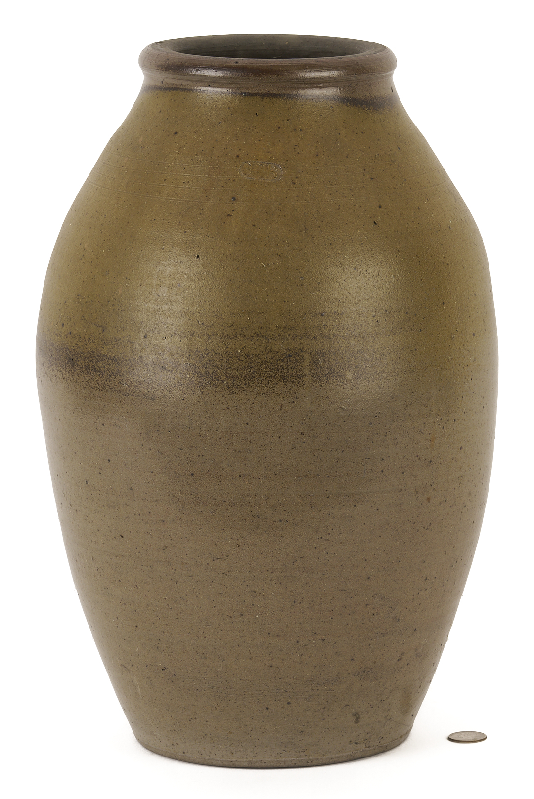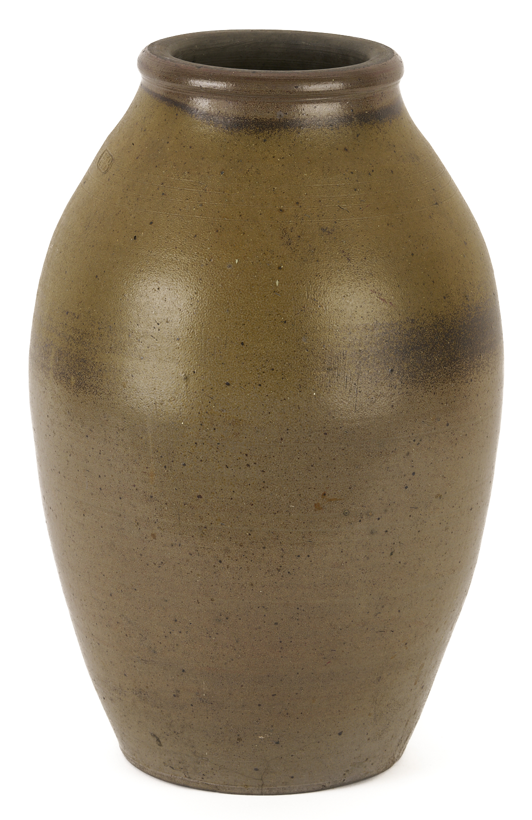 Middle Tennessee, likely Putnam County, salt-glazed stoneware pottery jar stamped HB below the rim within a serrated surround for Hiram Brown (1790 – 1867). Tall ovoid form with four faint rings on the upper shoulder and an olive green transitioning to tan glaze. 17 in. H x approx. 11 in. W. Second half of the 19th century.