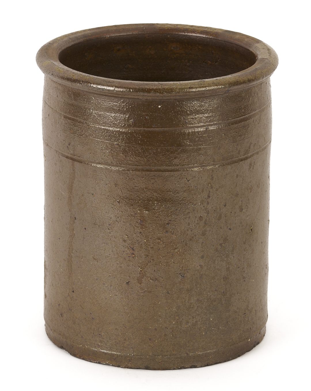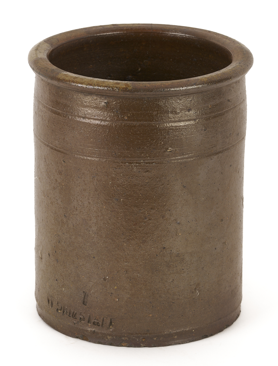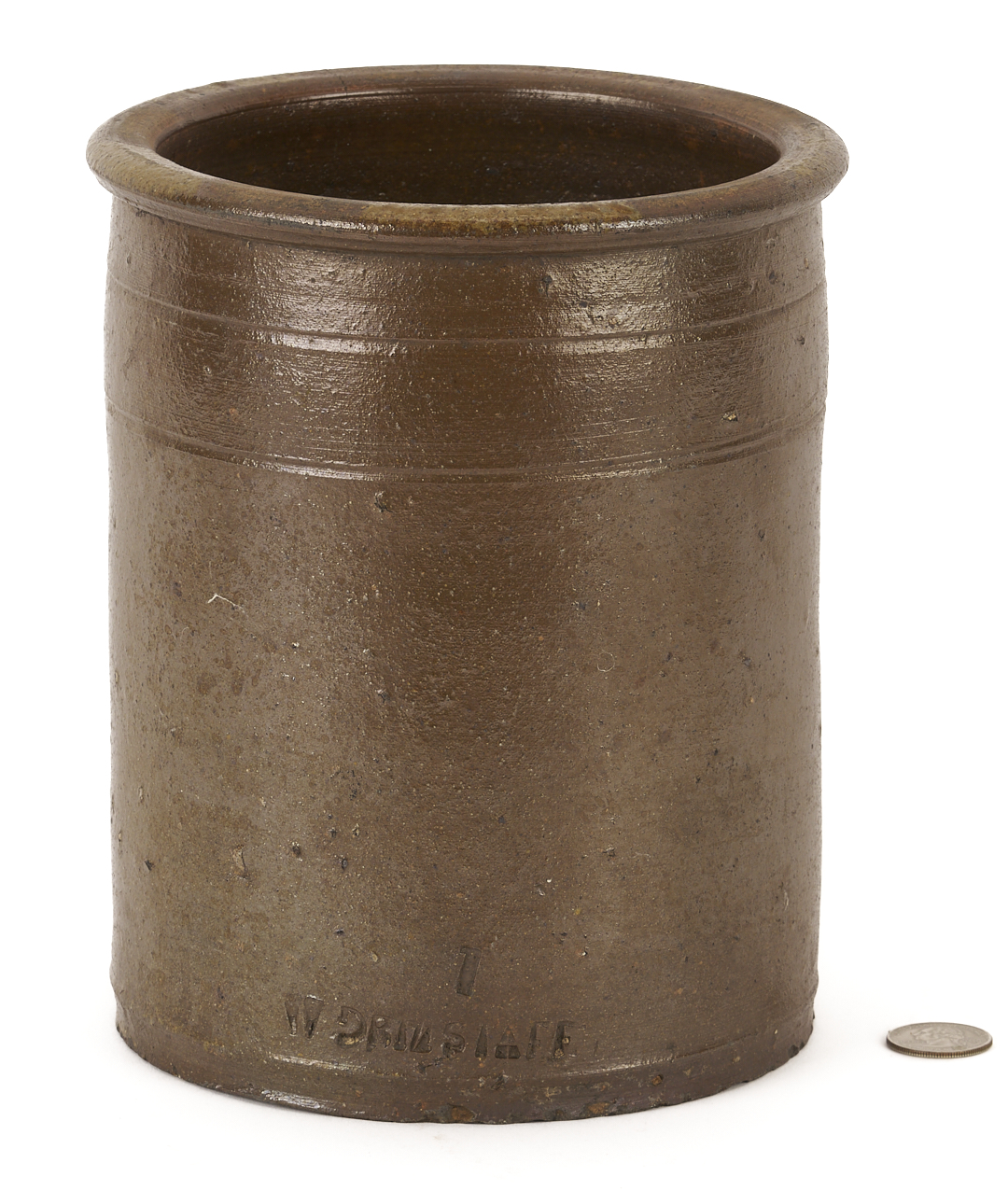 East Tennessee, Blount County, 1-gallon salt-glazed stoneware pottery preserving jar marked for Grindstaff Pottery (1870 – 1890). Lower base with impressed mark reading W. GRINSTAFF and 1 denoting capacity, two incised lines below the rolled rim, and beveled foot. 8 1/8 in. H.