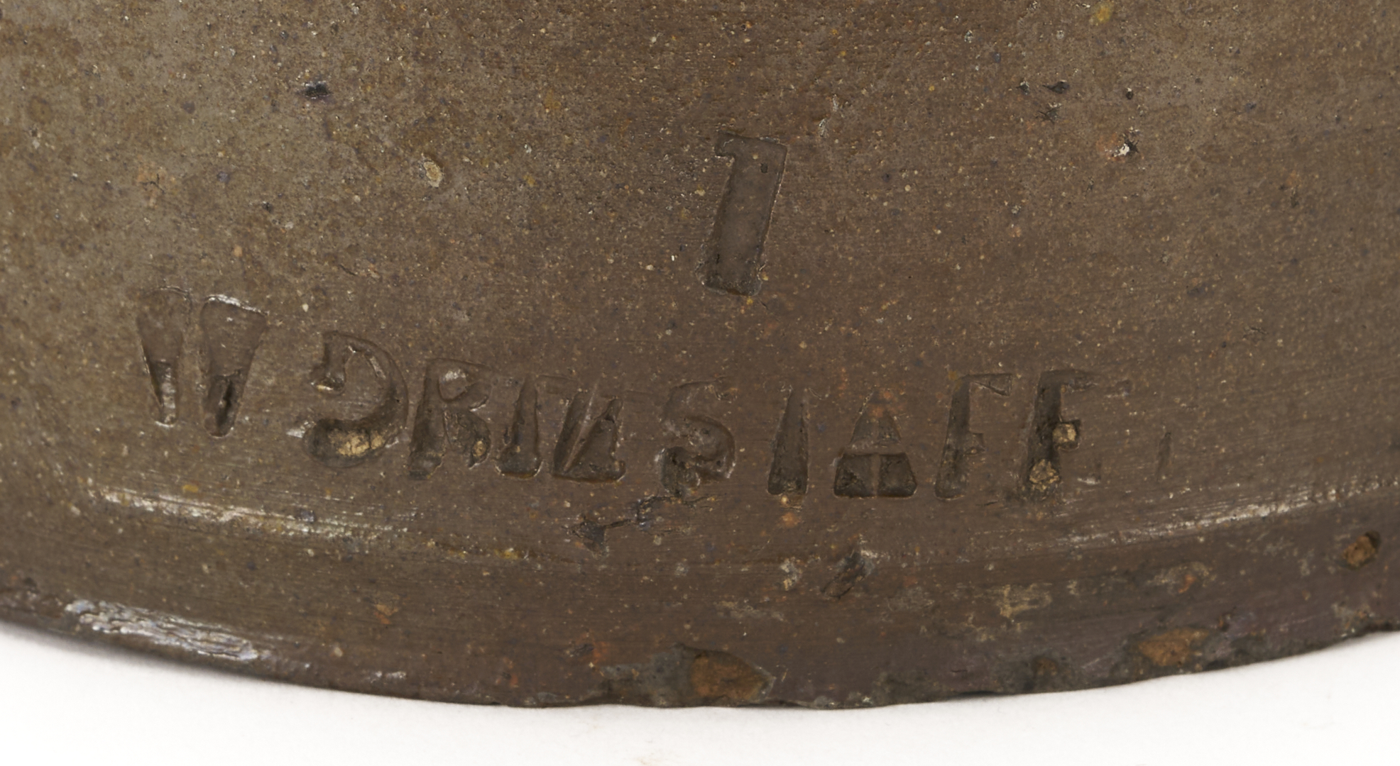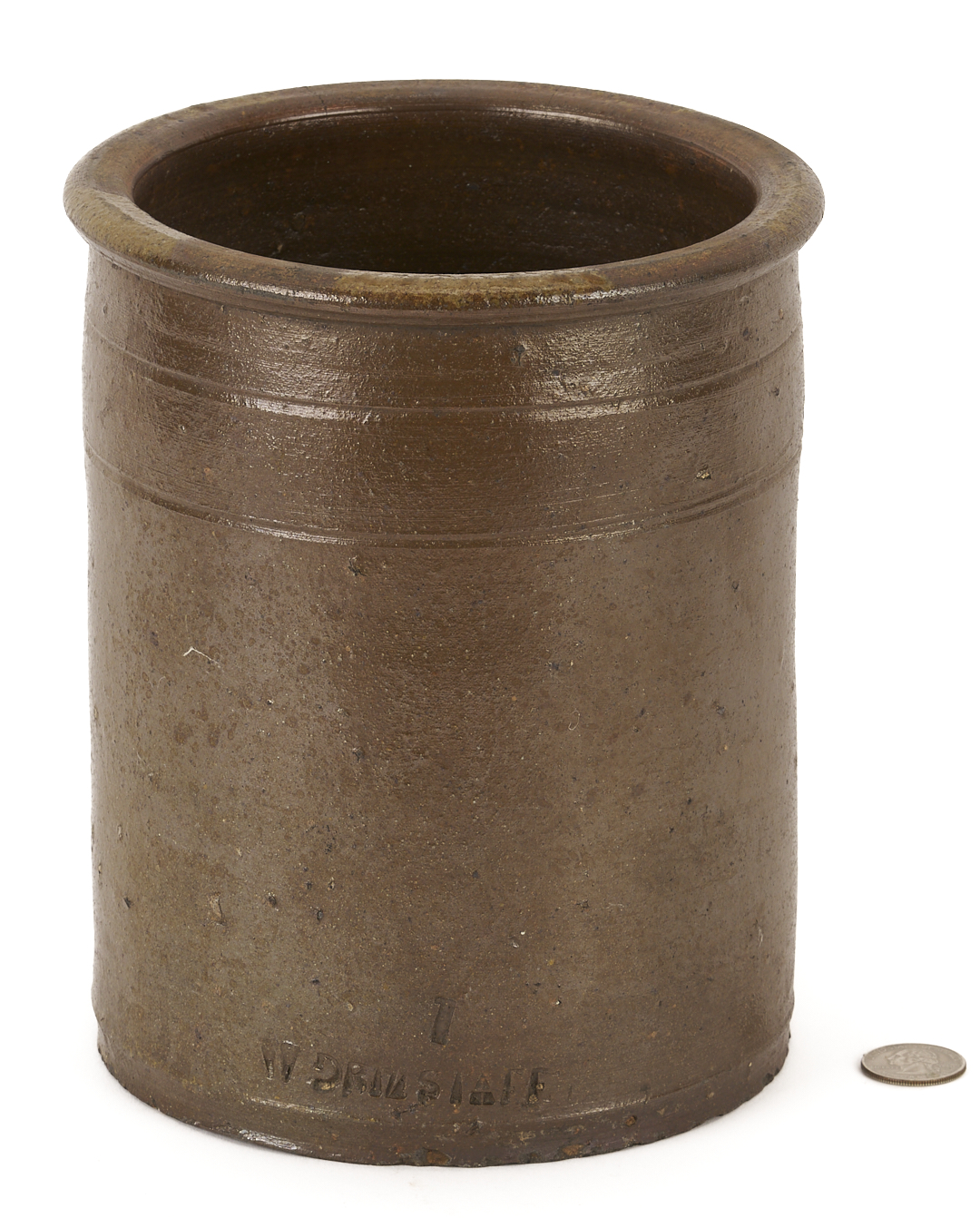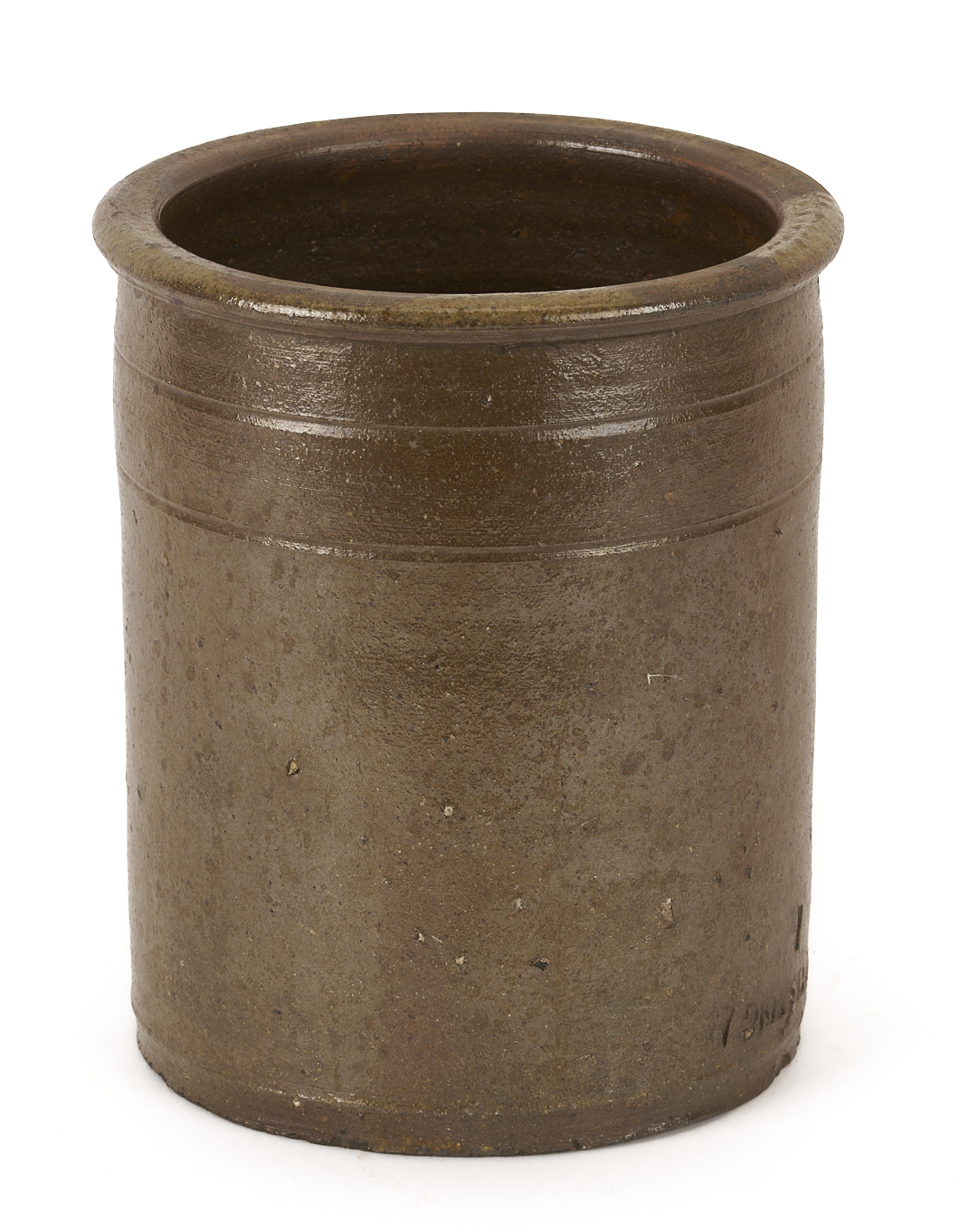 East Tennessee, Blount County, 1-gallon salt-glazed stoneware pottery preserving jar marked for Grindstaff Pottery (1870 – 1890). Lower base with impressed mark reading W. GRINSTAFF and 1 denoting capacity, two incised lines below the rolled rim, and beveled foot. 8 1/8 in. H.