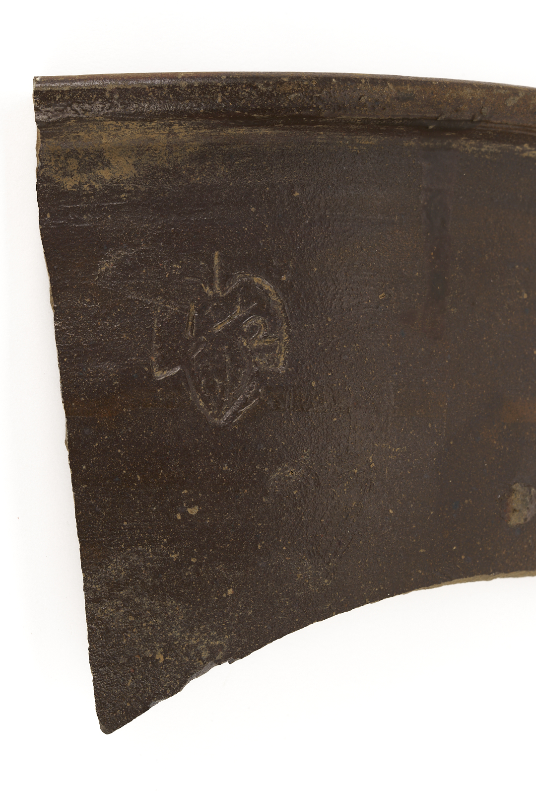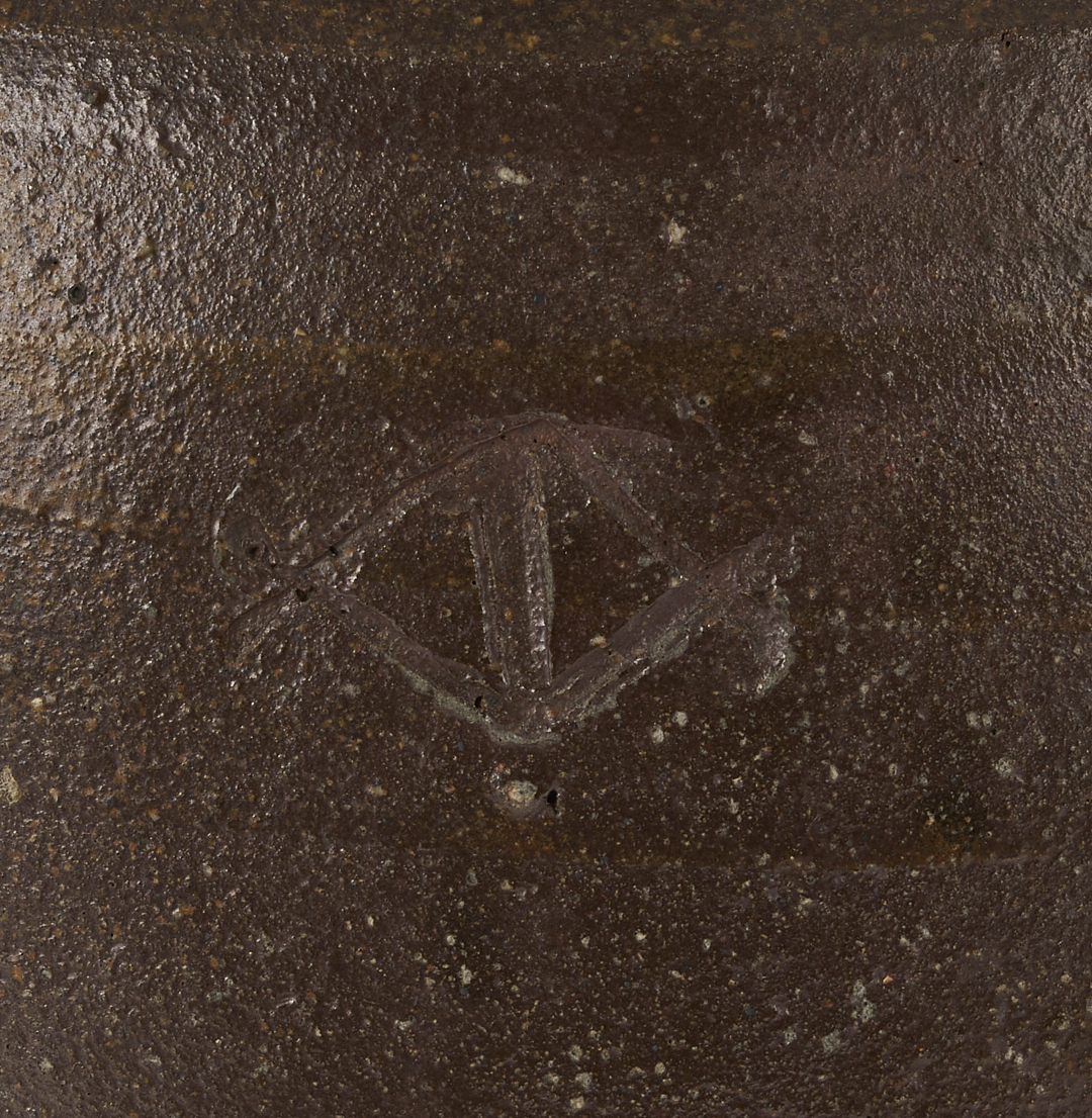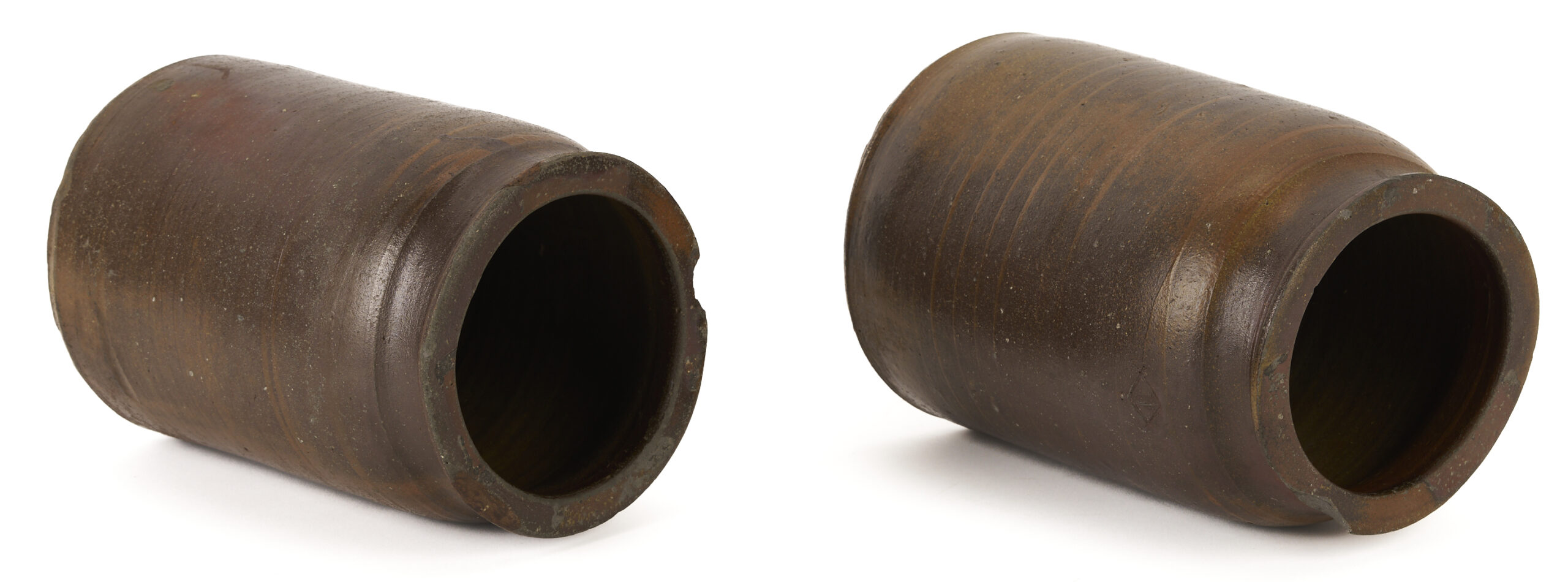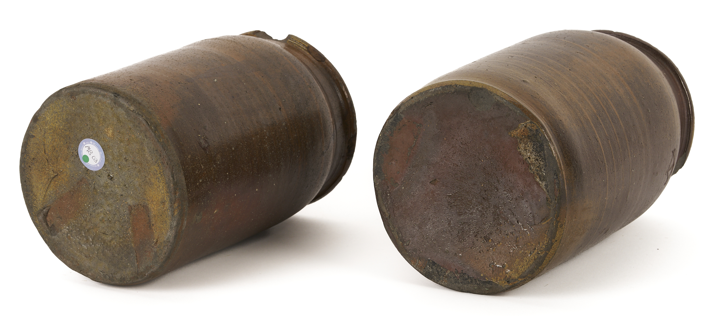 Two (2) East Tennessee salt-glazed stoneware pottery crocks, attributed to John E. Glass, working in Bount County, slight bell form with flattened rolled rims, stamped “1” denoting capacity within an incised stylised diamond or fish, and bevelled base. One jar retains an exhibition label for the 2011 “Tennessee Turned: Earthenware and Stoneware Made in East Tennessee 1800-1900” exhibit held at the East Tennessee Historical Society. 9 1/4 in. H and 9 7/8 in. H. Circa 1857 – 1860. Note: John E. Glass is listed as a potter in an 1858 directory of Blount County businesses. On the 1860 census, he is identified as a 39-year-old potter living without land adjacent to David Grindstaff, father of the potter William Grindstaff. Glass appears to have started a pottery factory on David Grindstaff’s property, and William Grindstaff began to work with him, eventually establishing a pottery business in his own name. (Source: Tennessee Potteries, Pots, and Potters – 1790s – 1950, Volume 1, Samuel D. Smith and Stephen T. Rogers, 2011). This lot also contains an associated, possibly Blount County, salt-glazed stoneware pottery shard with an incised maple leaf design and 1/2 capacity mark.