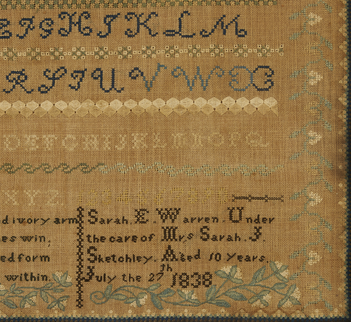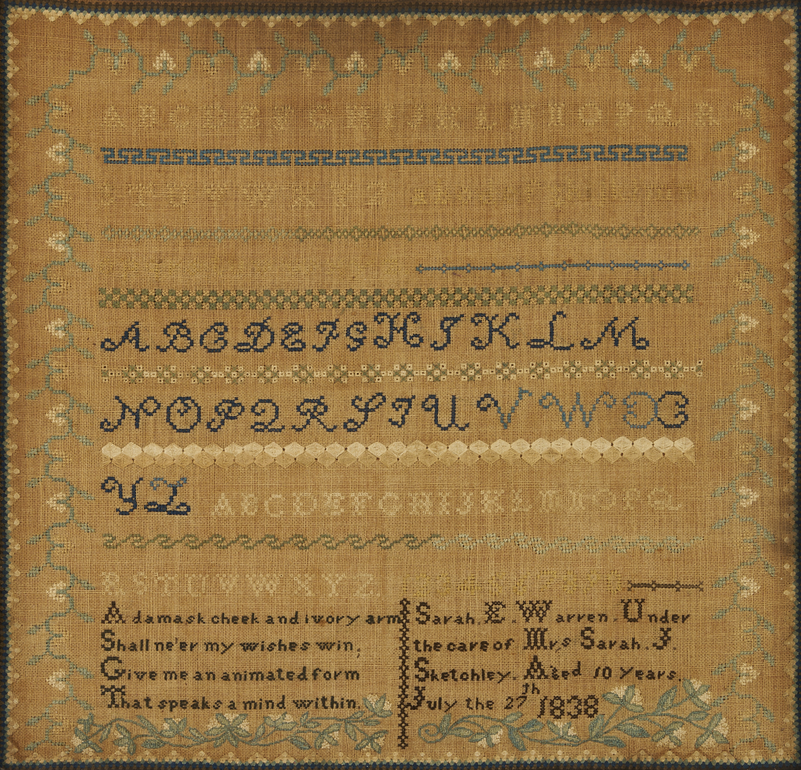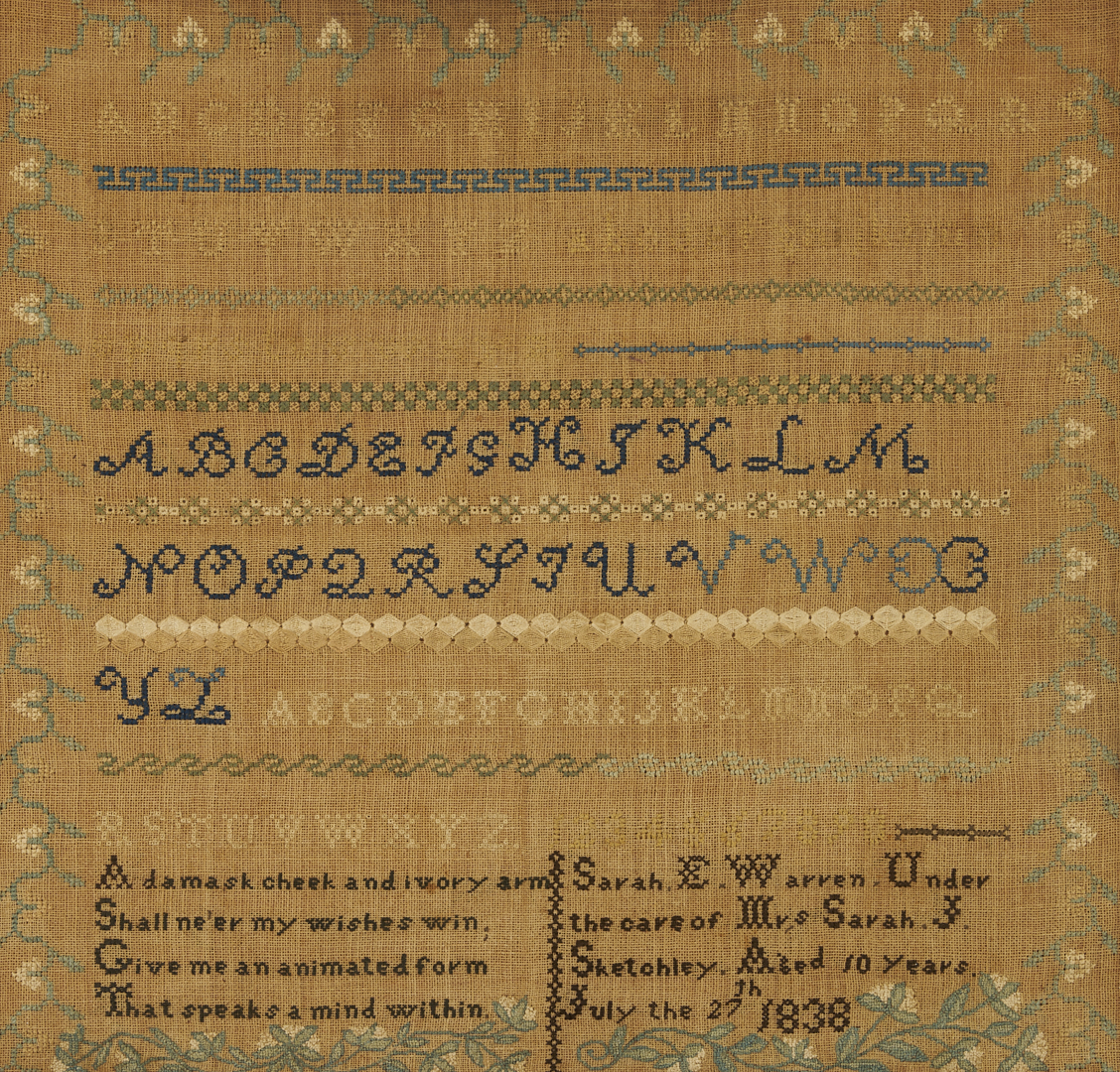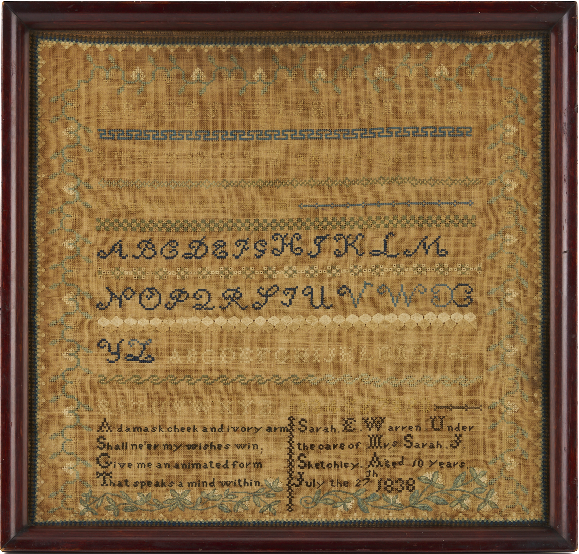 Maryville, East Tennessee Schoolgirl Needlework Sampler, stitched by Sarah E. Warren in 1838. Silk on linen, featuring an unusual and time consuming Queen’s-stitched sawtooth outer border and a strawberry embroidered interior border. Seven lines of alphabets and numbers are divided by decorative bands rendered in cross, cross over one, eyelet and queen stitches, over a verse and signature identifying both the stitcher and her teacher: “Sarah E. Warren Under the care of Mrs. Sarah J. Sketchley. Aged 10 years. July the 27th 1838.” Housed under glass in a mahogany frame. Sight: 19 1/2 in H x 20 1/2 in. W. Frame: 21 5/8 in. H x 22 5/8 in. W. Ref. Core and Hasson, TENNESSEE SAMPLERS: FEMALE EDUCATION AND DOMESTIC ARTS, 1800-1900, pp. 175-176. According to the Tennessee Sampler Survey, Mrs. Sarah J. Sketchley taught at the Young Ladies Finishing School in Maryville, Blount County. Her pupil, Sarah Elizabeth Warren (1827-1900) was the oldest of seven children born to Barton Leonidas Warren and Evaline Singleton. The family lived to the east of Louisville, Blount Co., where her father owned a large tannery and leather business. Mr. Warren was considered the richest man in Blount County. Sarah married William McClung Steele in 1853. Sarah’s husband owned a wholesale stock business, Steele & Bros., in Maryville. The couple lived on a farm in nearby Louisville. They had two sons and one daughter, all of whom were long-lived. Sarah died in 1900 and is buried in the Magnolia Cemetery in Maryville, Blount County. A packet of genealogical data including on the teacher, Ms. Sketchley, accompanies this sampler, along with a couple of old family notes. One additionally states that Louisa Hill was the cousin of Confederate General A.P. Hill.