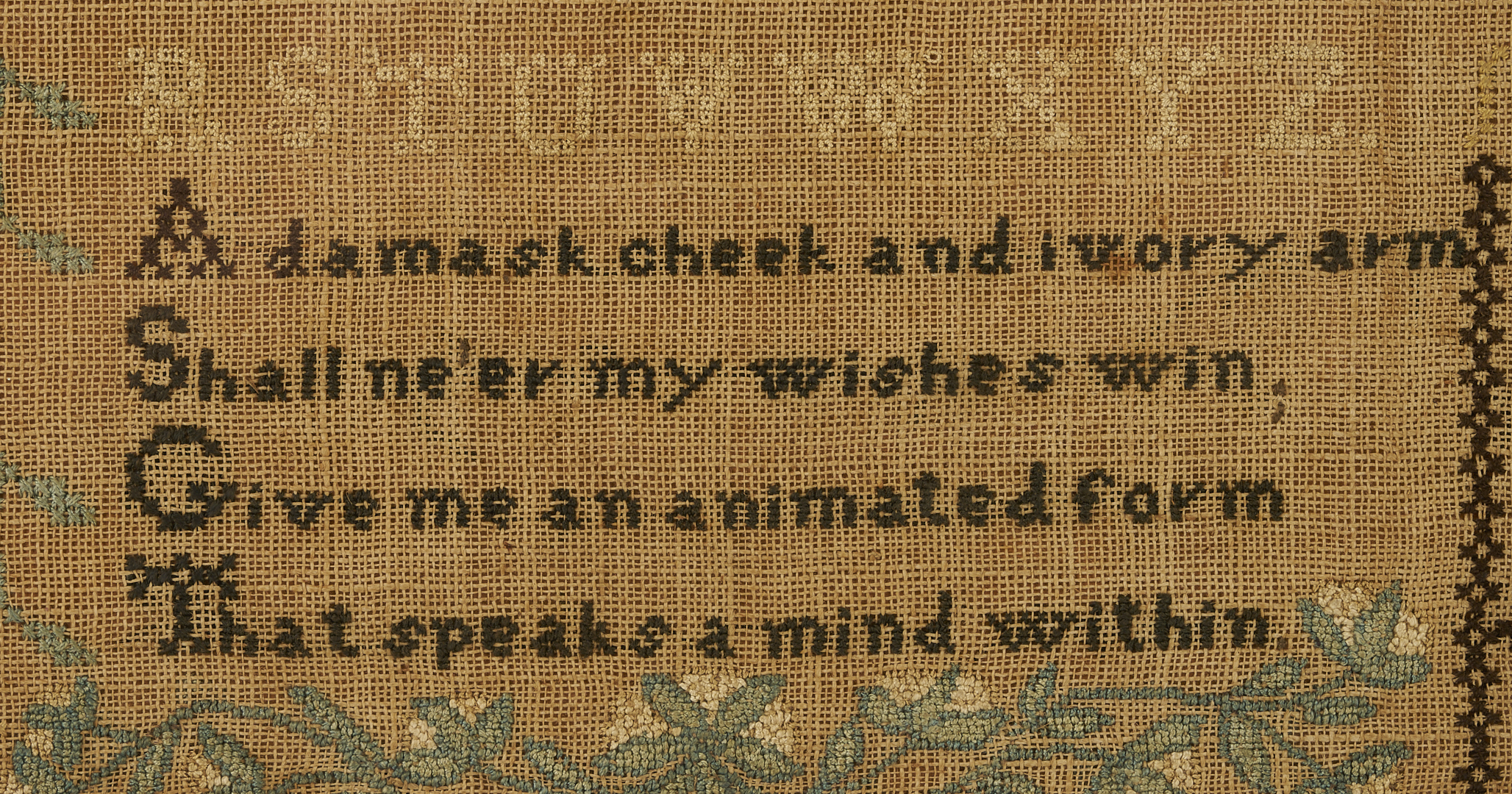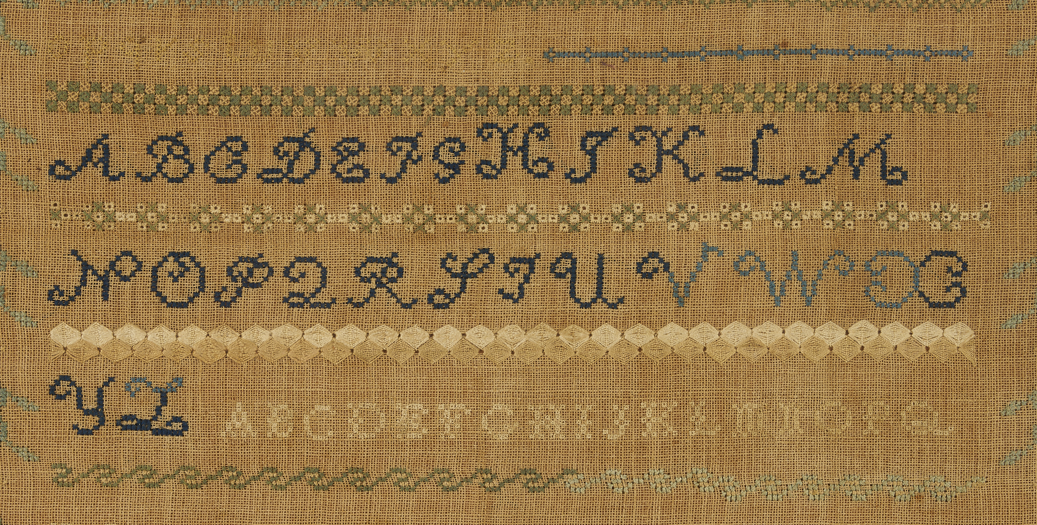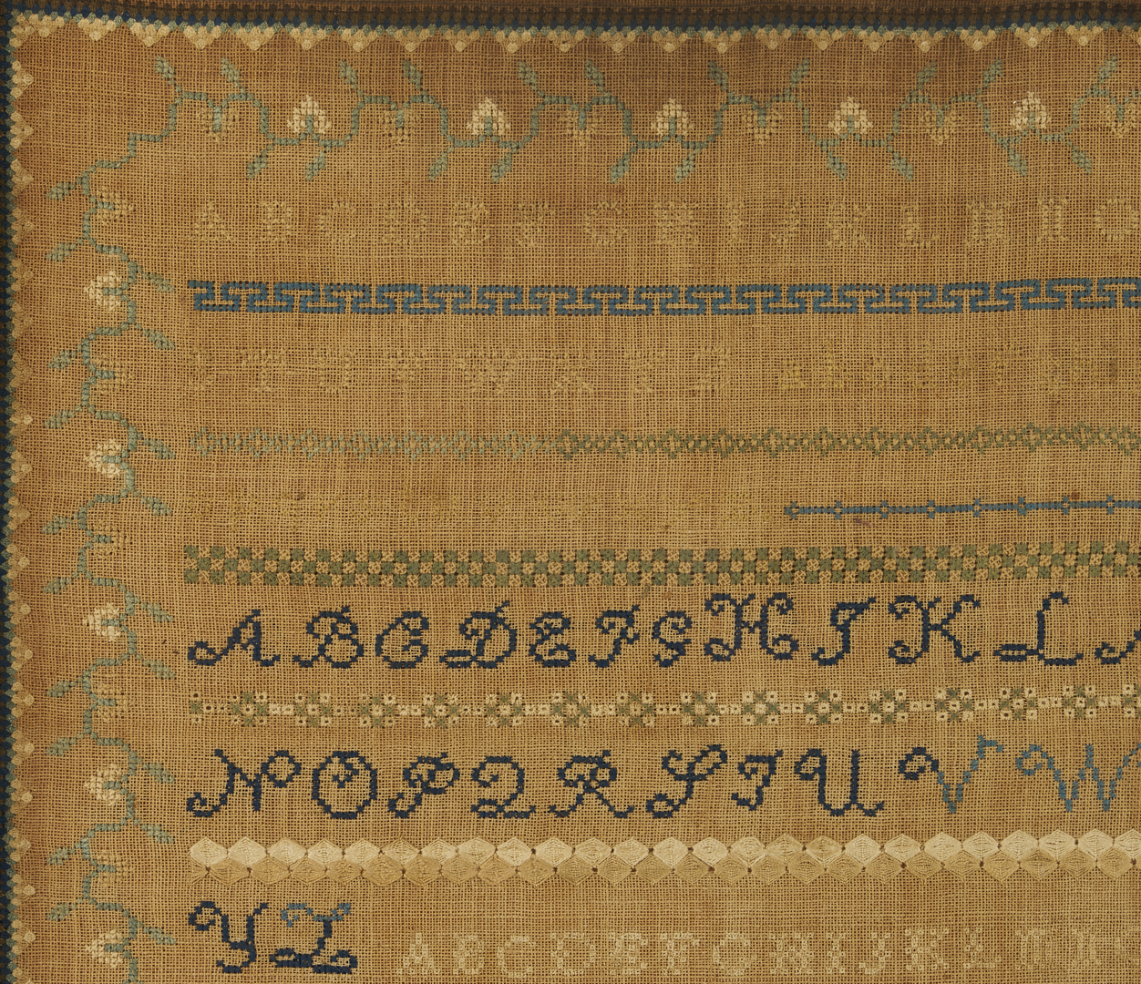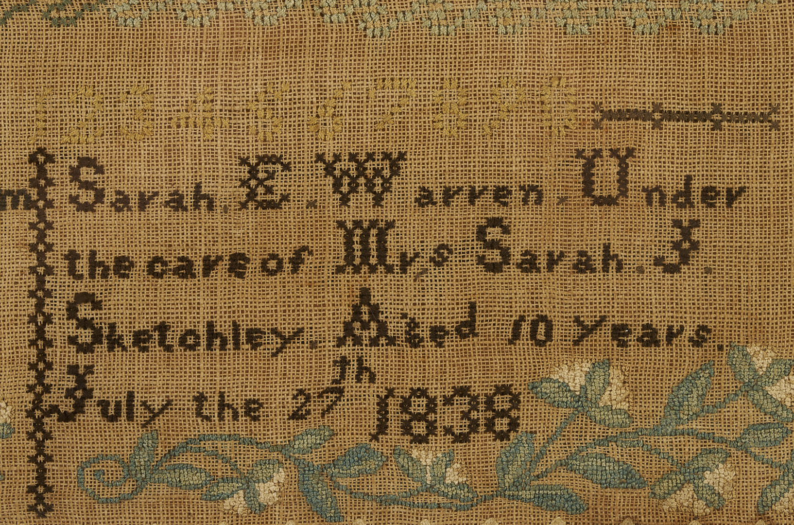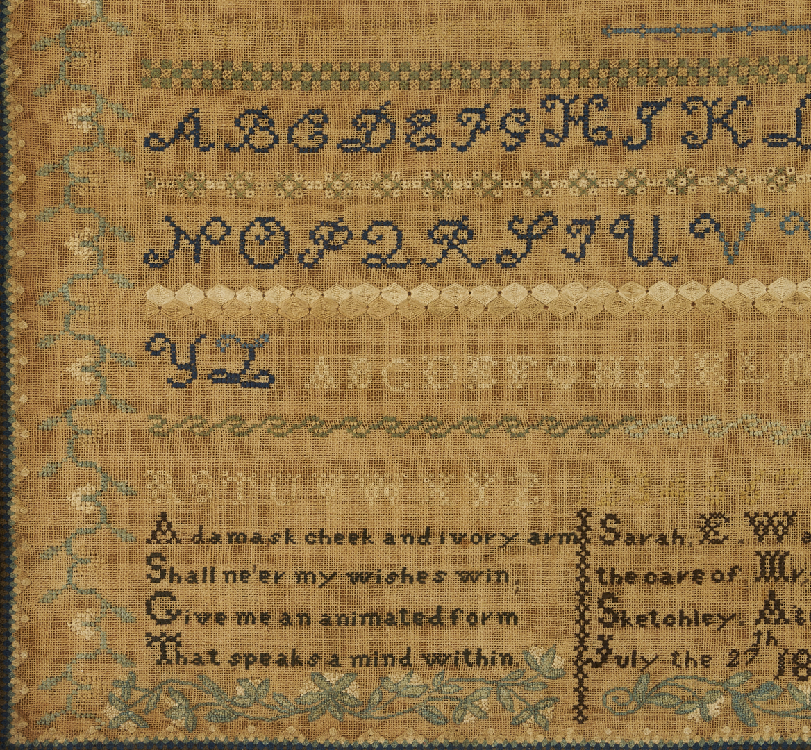 Maryville, East Tennessee Schoolgirl Needlework Sampler, stitched by Sarah E. Warren in 1838. Silk on linen, featuring an unusual and time consuming Queen’s-stitched sawtooth outer border and a strawberry embroidered interior border. Seven lines of alphabets and numbers are divided by decorative bands rendered in cross, cross over one, eyelet and queen stitches, over a verse and signature identifying both the stitcher and her teacher: “Sarah E. Warren Under the care of Mrs. Sarah J. Sketchley. Aged 10 years. July the 27th 1838.” Housed under glass in a mahogany frame. Sight: 19 1/2 in H x 20 1/2 in. W. Frame: 21 5/8 in. H x 22 5/8 in. W. Ref. Core and Hasson, TENNESSEE SAMPLERS: FEMALE EDUCATION AND DOMESTIC ARTS, 1800-1900, pp. 175-176. According to the Tennessee Sampler Survey, Mrs. Sarah J. Sketchley taught at the Young Ladies Finishing School in Maryville, Blount County. Her pupil, Sarah Elizabeth Warren (1827-1900) was the oldest of seven children born to Barton Leonidas Warren and Evaline Singleton. The family lived to the east of Louisville, Blount Co., where her father owned a large tannery and leather business. Mr. Warren was considered the richest man in Blount County. Sarah married William McClung Steele in 1853. Sarah’s husband owned a wholesale stock business, Steele & Bros., in Maryville. The couple lived on a farm in nearby Louisville. They had two sons and one daughter, all of whom were long-lived. Sarah died in 1900 and is buried in the Magnolia Cemetery in Maryville, Blount County. A packet of genealogical data including on the teacher, Ms. Sketchley, accompanies this sampler, along with a couple of old family notes. One additionally states that Louisa Hill was the cousin of Confederate General A.P. Hill.