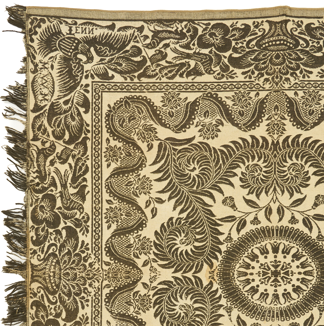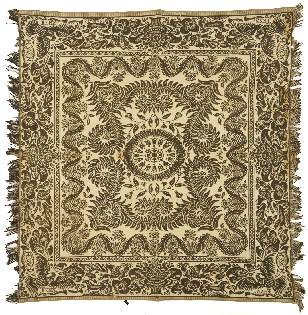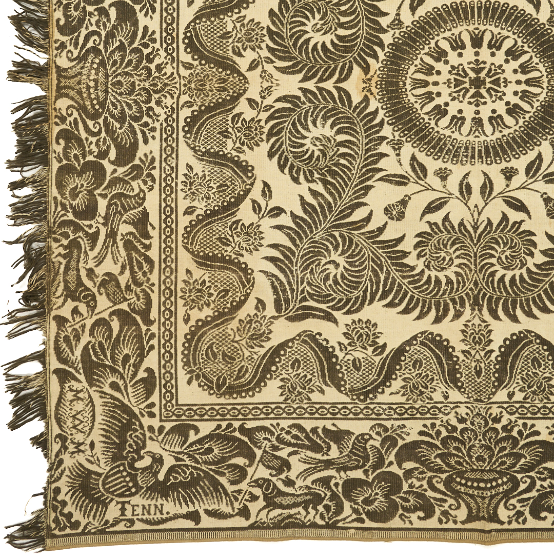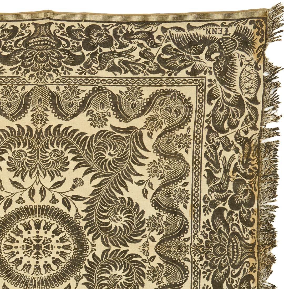 East Tennessee olive green and white coverlet made by Maryville Woolen Mills Company. The corners feature eagles with shields flanked by “M.W.M. Tenn.”. The center panel features a central circular foliate medallion flanked by stylized scrolling foliate borders. The wide border with birds, potted flowers, foliage, and dogs carrying flags. 79 in. x 79 in. Note: Maryville Woolen Mills operated in Blount County, TN, from approximately 1874 to 1906.
