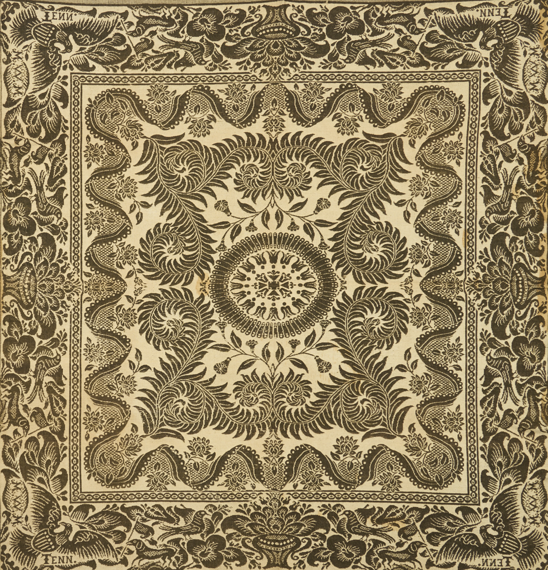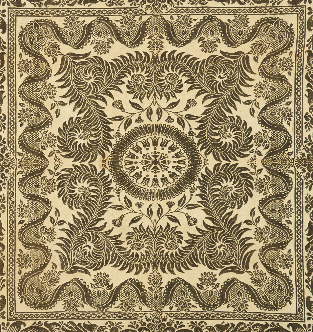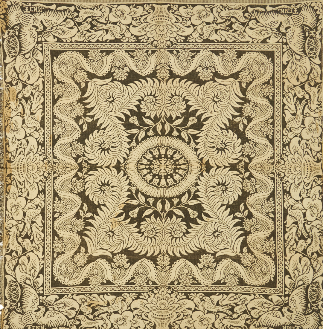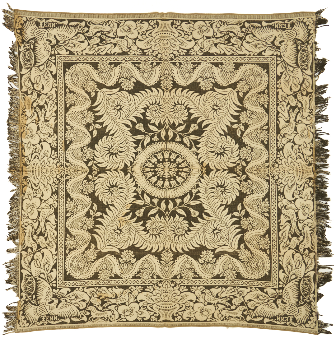 East Tennessee olive green and white coverlet made by Maryville Woolen Mills Company. The corners feature eagles with shields flanked by “M.W.M. Tenn.”. The center panel features a central circular foliate medallion flanked by stylized scrolling foliate borders. The wide border with birds, potted flowers, foliage, and dogs carrying flags. 79 in. x 79 in. Note: Maryville Woolen Mills operated in Blount County, TN, from approximately 1874 to 1906.