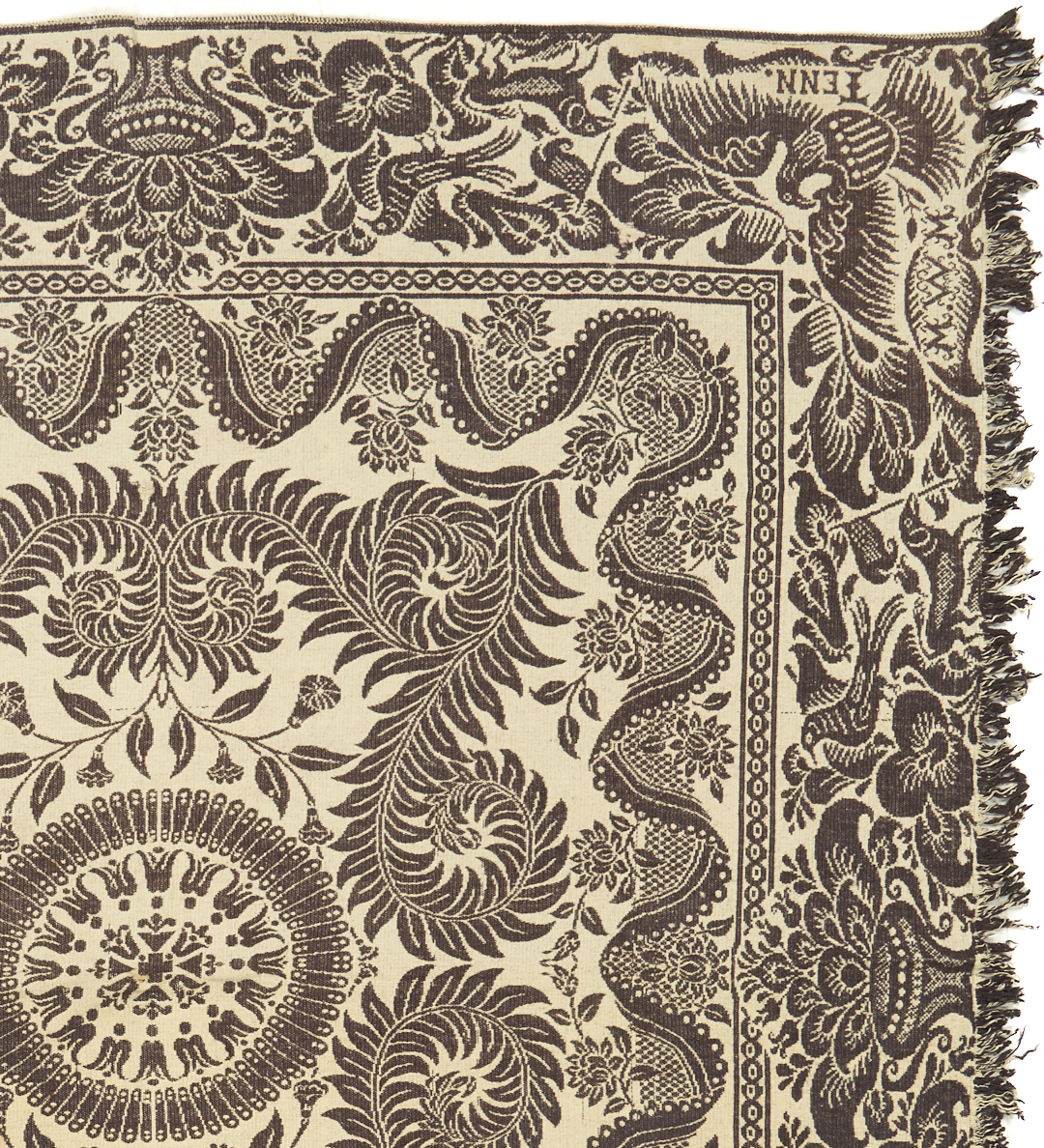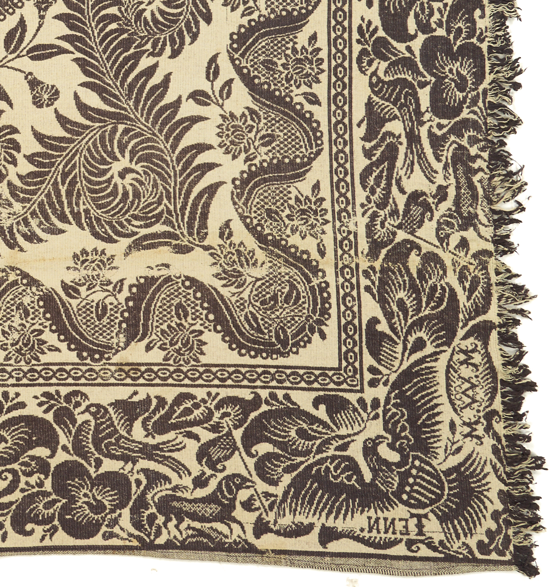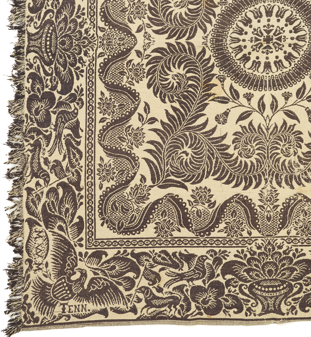 East Tennessee black and white coverlet made by Maryville Woolen Mills Company. The corners feature eagles with shields flanked by “M.W.M. Tenn.”. The center panel features a central circular foliate medallion flanked by stylized scrolling foliate borders. The wide border with birds, potted flowers, foliage, and dogs carrying flags. 72 3/4 in. x 79 in. Note: Maryville Woolen Mills operated in Blount County, TN, from approximately 1874 to 1906.