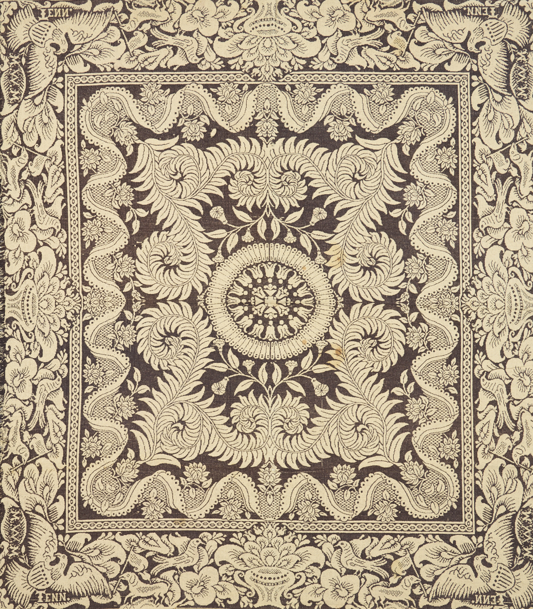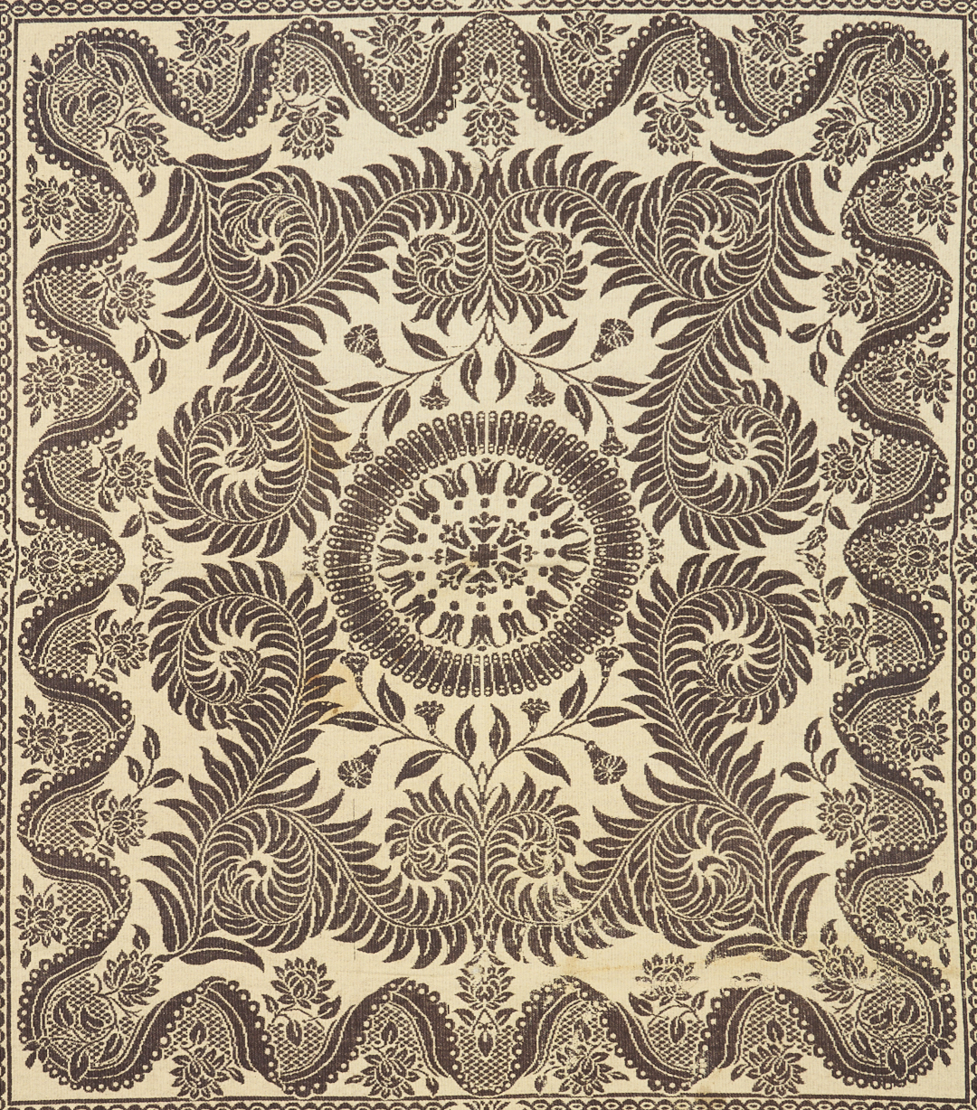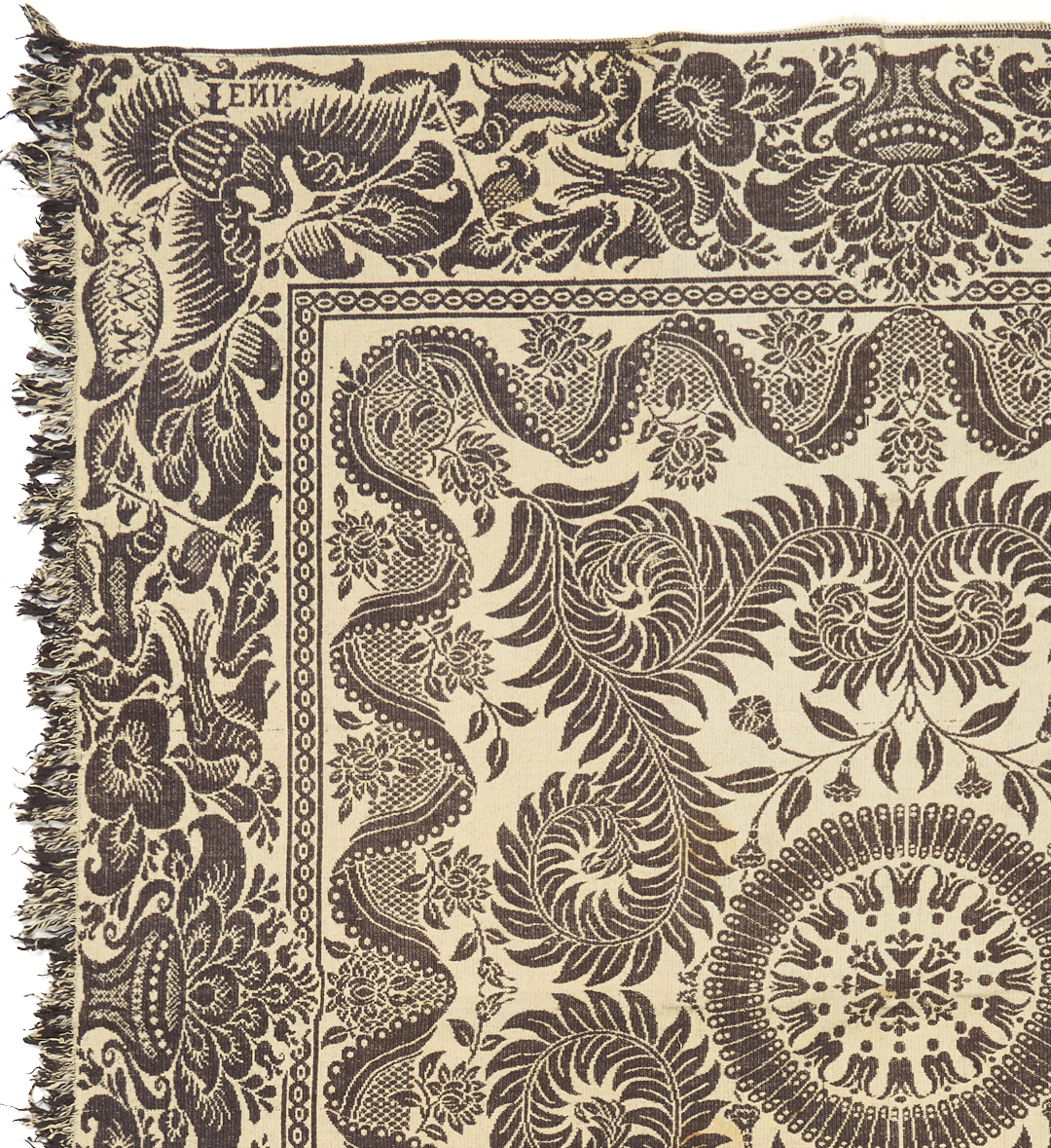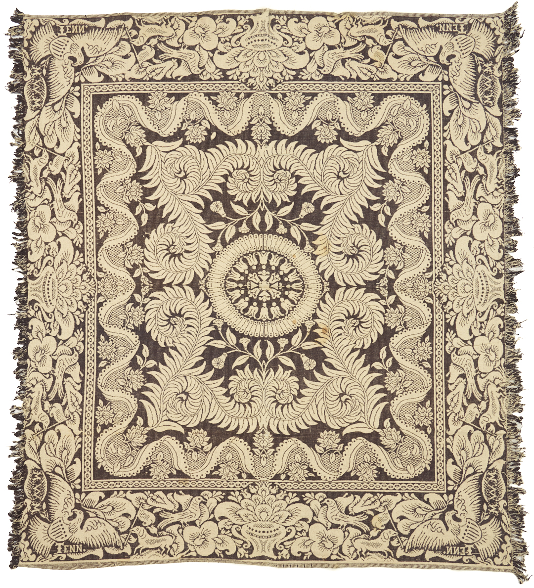 East Tennessee black and white coverlet made by Maryville Woolen Mills Company. The corners feature eagles with shields flanked by “M.W.M. Tenn.”. The center panel features a central circular foliate medallion flanked by stylized scrolling foliate borders. The wide border with birds, potted flowers, foliage, and dogs carrying flags. 72 3/4 in. x 79 in. Note: Maryville Woolen Mills operated in Blount County, TN, from approximately 1874 to 1906.