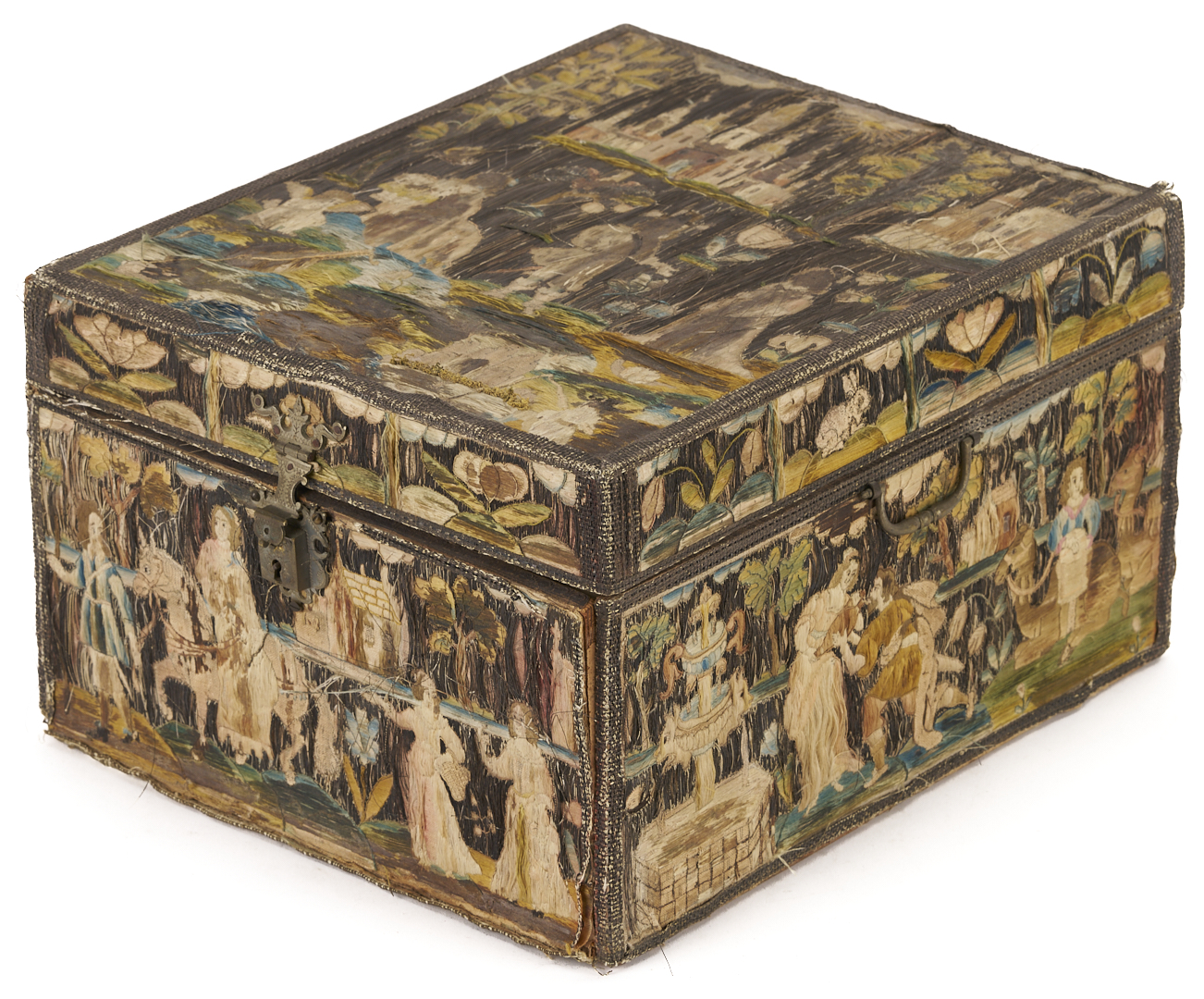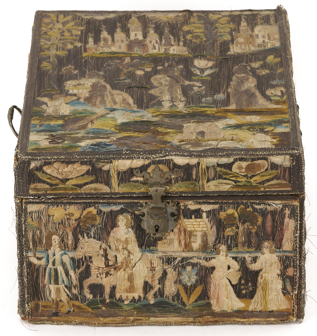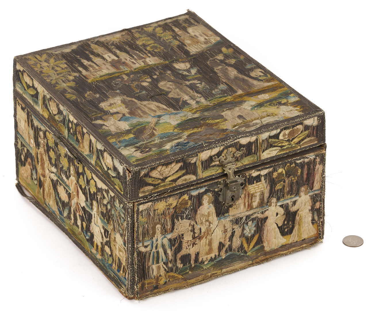 English or Continental silk embroidered toilette or dressing / writing box. The embroidery features intricate and well-executed scenes of figures in landscapes: a dog chasing a rabbit, a squirrel, flowers and a castle. The hinged cover lifts to reveal a fitted interior with 4 glass bottles and 2 glass inkwells and the original mirror (broken). Engraved brass latch and handles. 6 1/2 in. H x 12 1/2 in. L x 9 1/2 in. D. Also included is a framed silk embroidered picture with Biblical scene of the baby Moses being discovered in a basket in the river by Pharaoh’s daughter. Under glass in a later ebonized frame measuring 10 in. x 10 in. Both items 18th century or earlier.