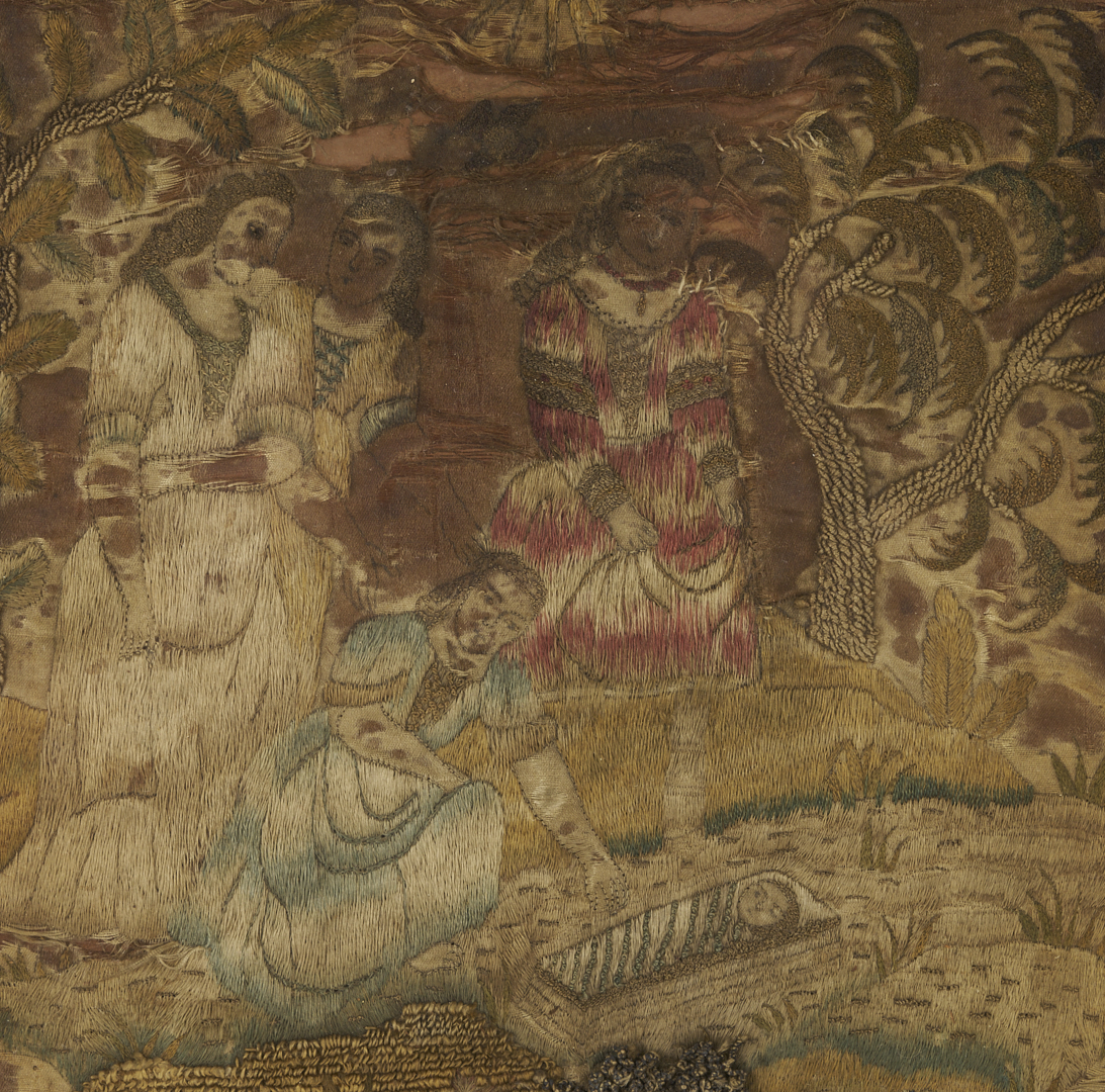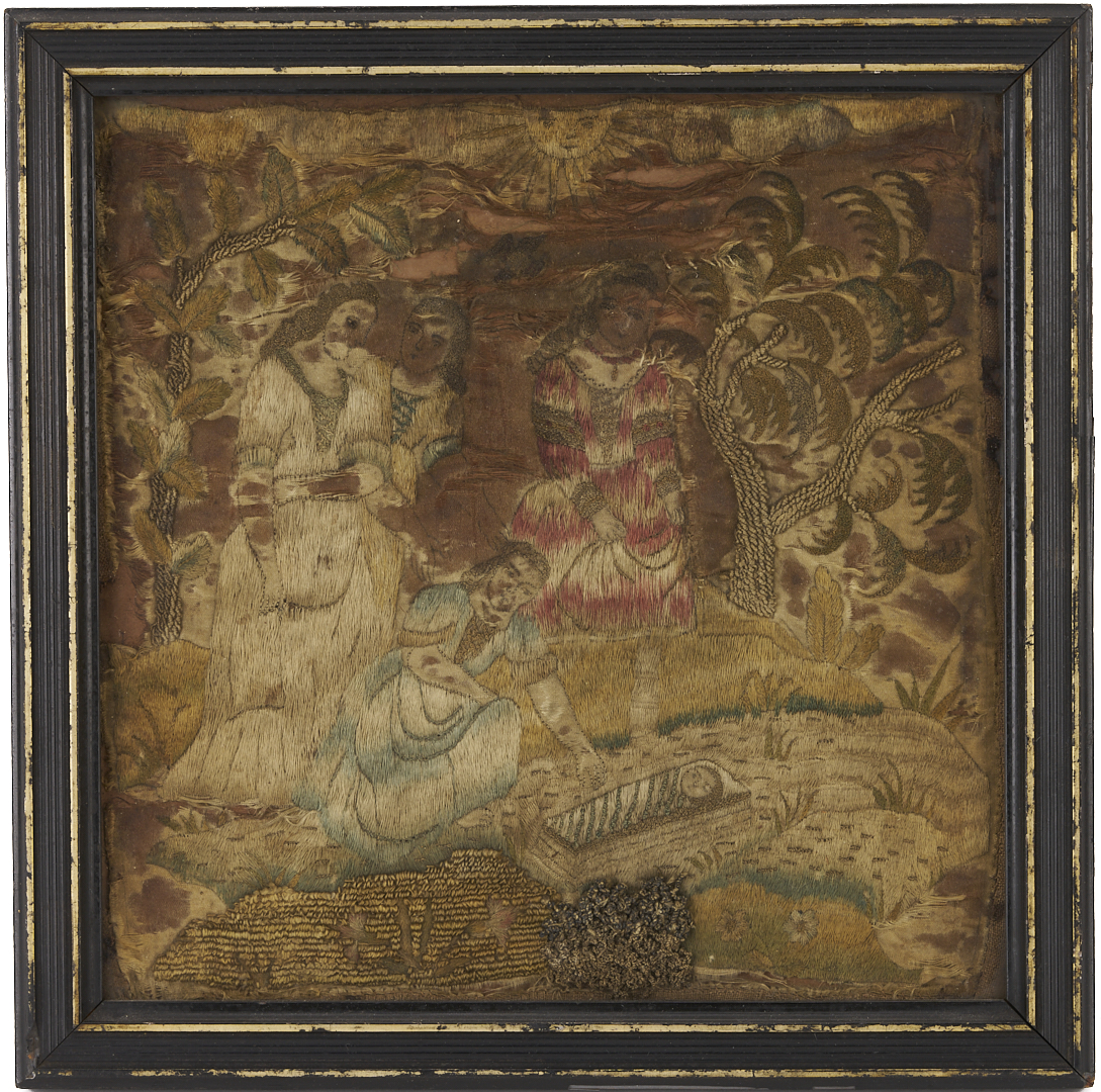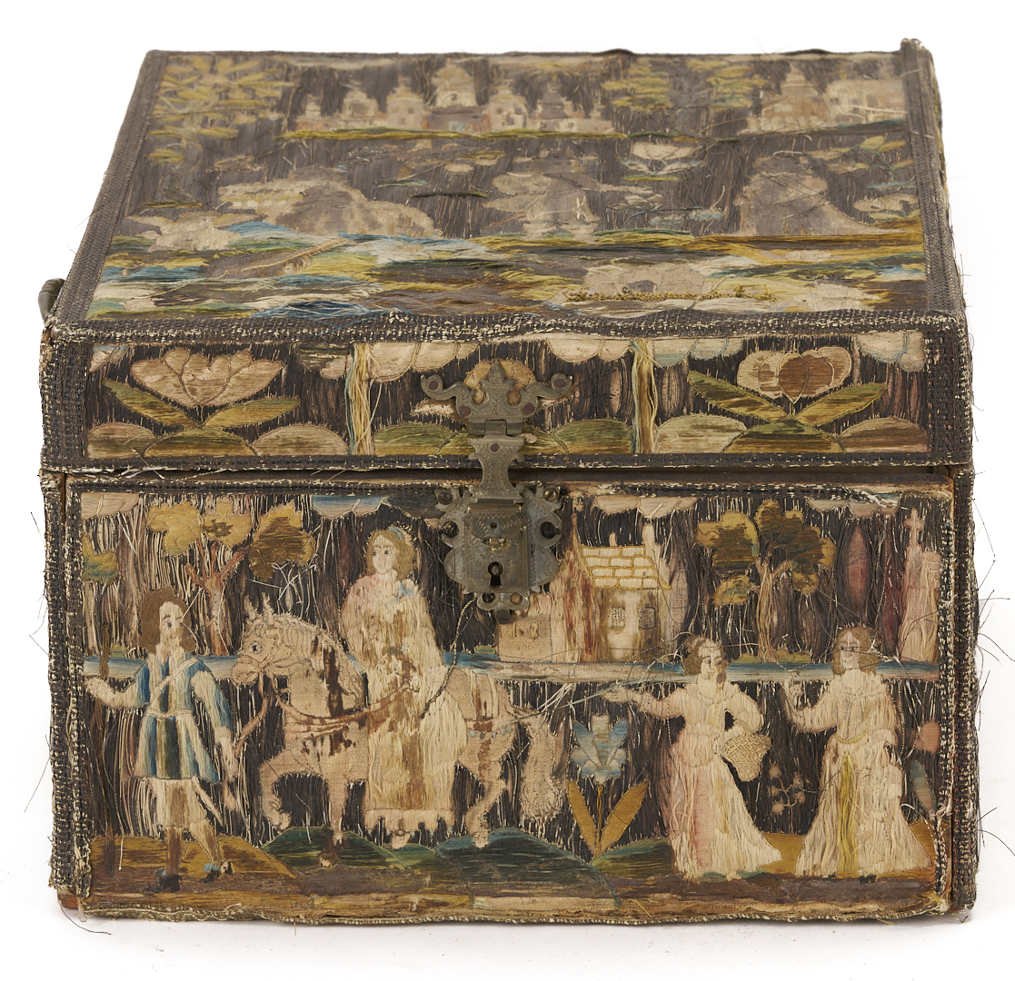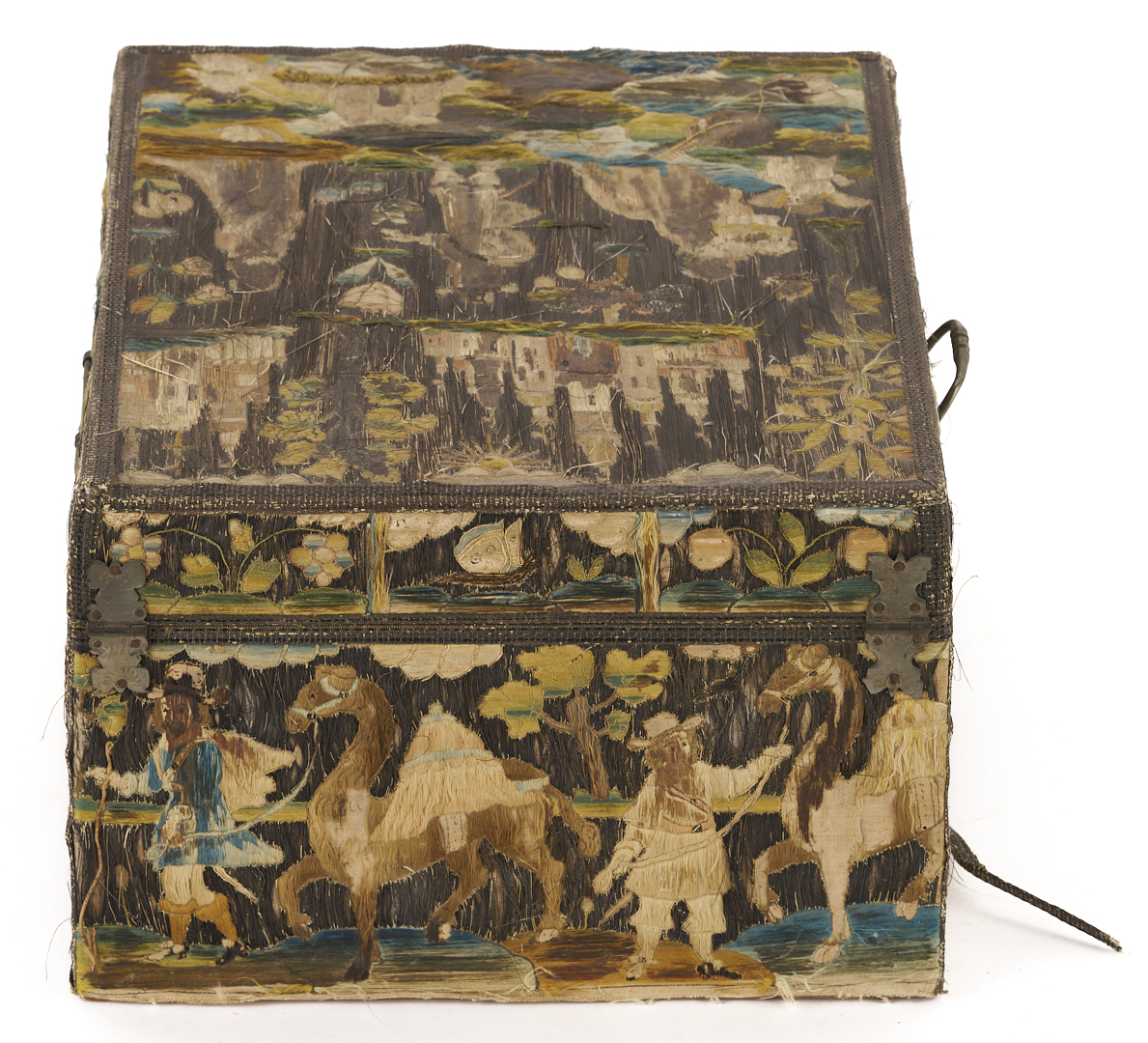 English or Continental silk embroidered toilette or dressing / writing box. The embroidery features intricate and well-executed scenes of figures in landscapes: a dog chasing a rabbit, a squirrel, flowers and a castle. The hinged cover lifts to reveal a fitted interior with 4 glass bottles and 2 glass inkwells and the original mirror (broken). Engraved brass latch and handles. 6 1/2 in. H x 12 1/2 in. L x 9 1/2 in. D. Also included is a framed silk embroidered picture with Biblical scene of the baby Moses being discovered in a basket in the river by Pharaoh’s daughter. Under glass in a later ebonized frame measuring 10 in. x 10 in. Both items 18th century or earlier.