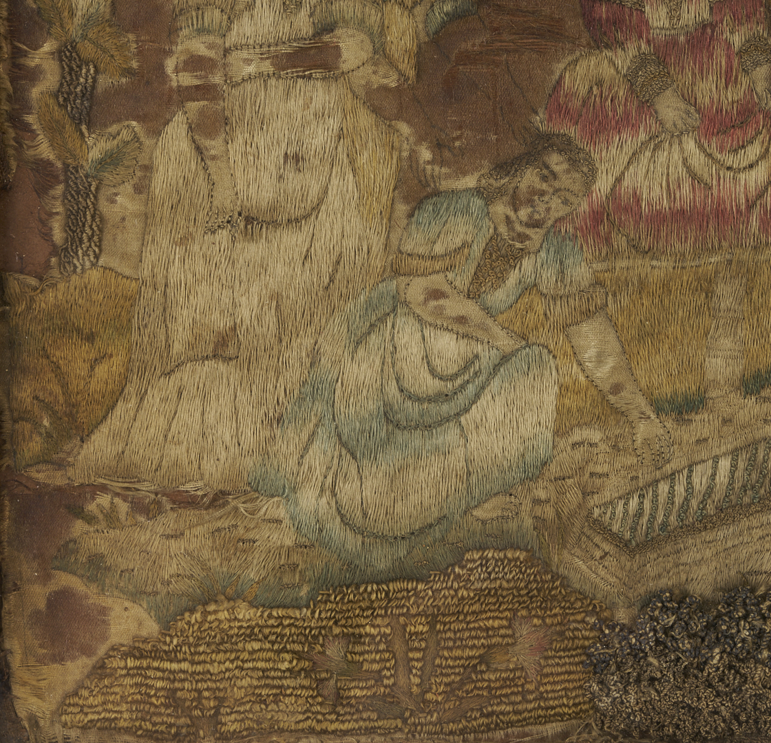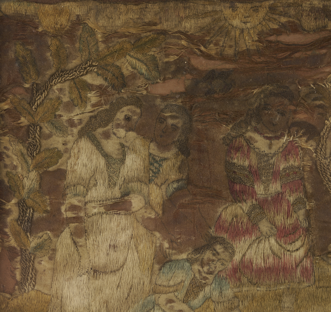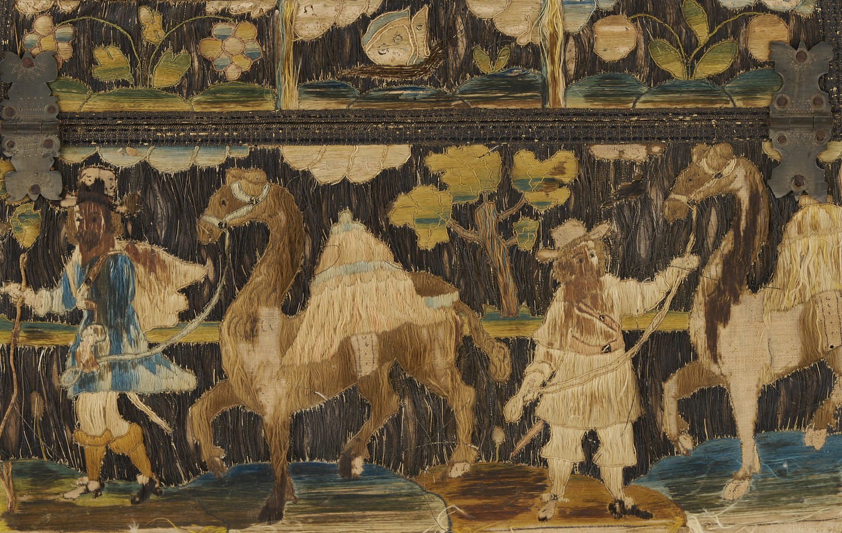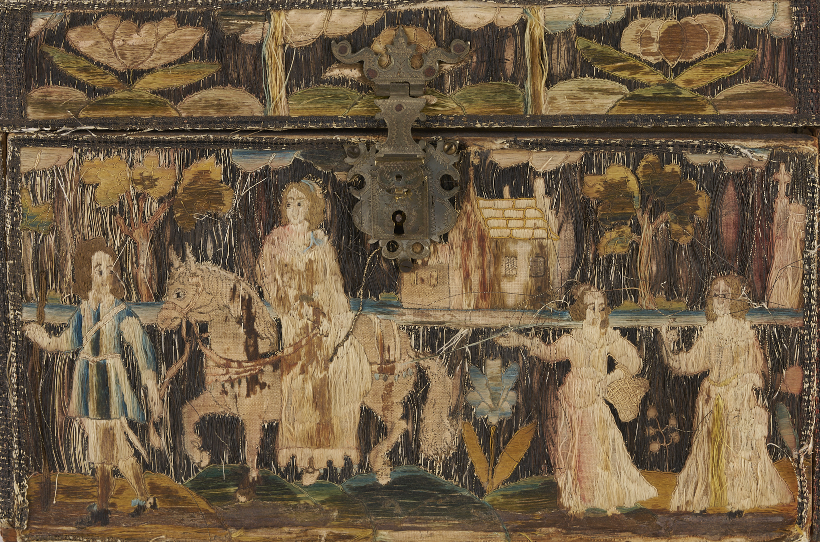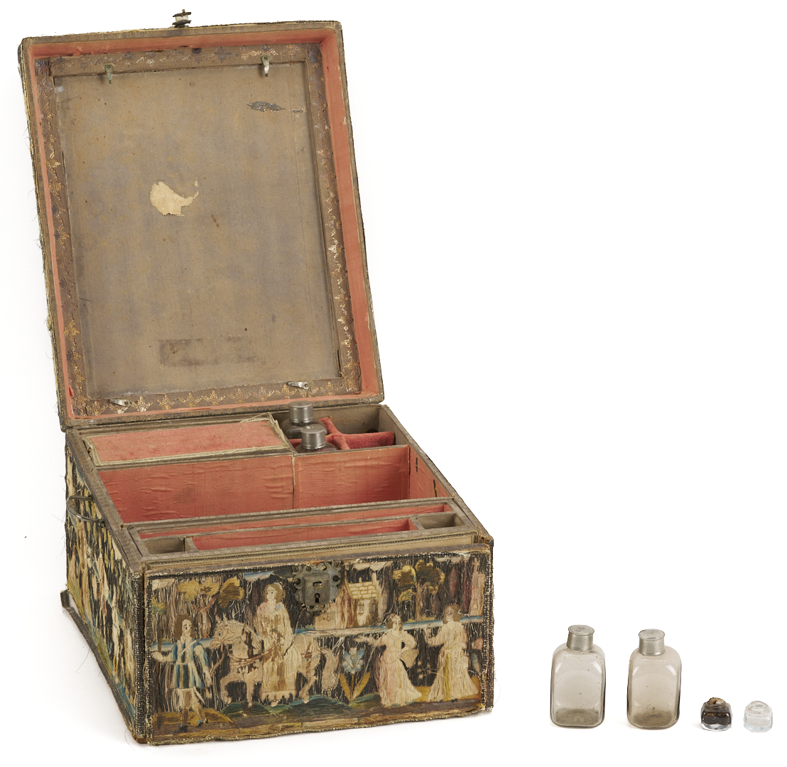 1st item: the original embroidery survives in relatively good condition with wear, especially at the latch, fraying, some fading, and scattered losses consistent with age and use. Two glass bottles are stuck in their compartments. Mirror broken. 2nd item: Fragile condition with fraying, losses and fading; some ground disintegration. Not examined out of frame.