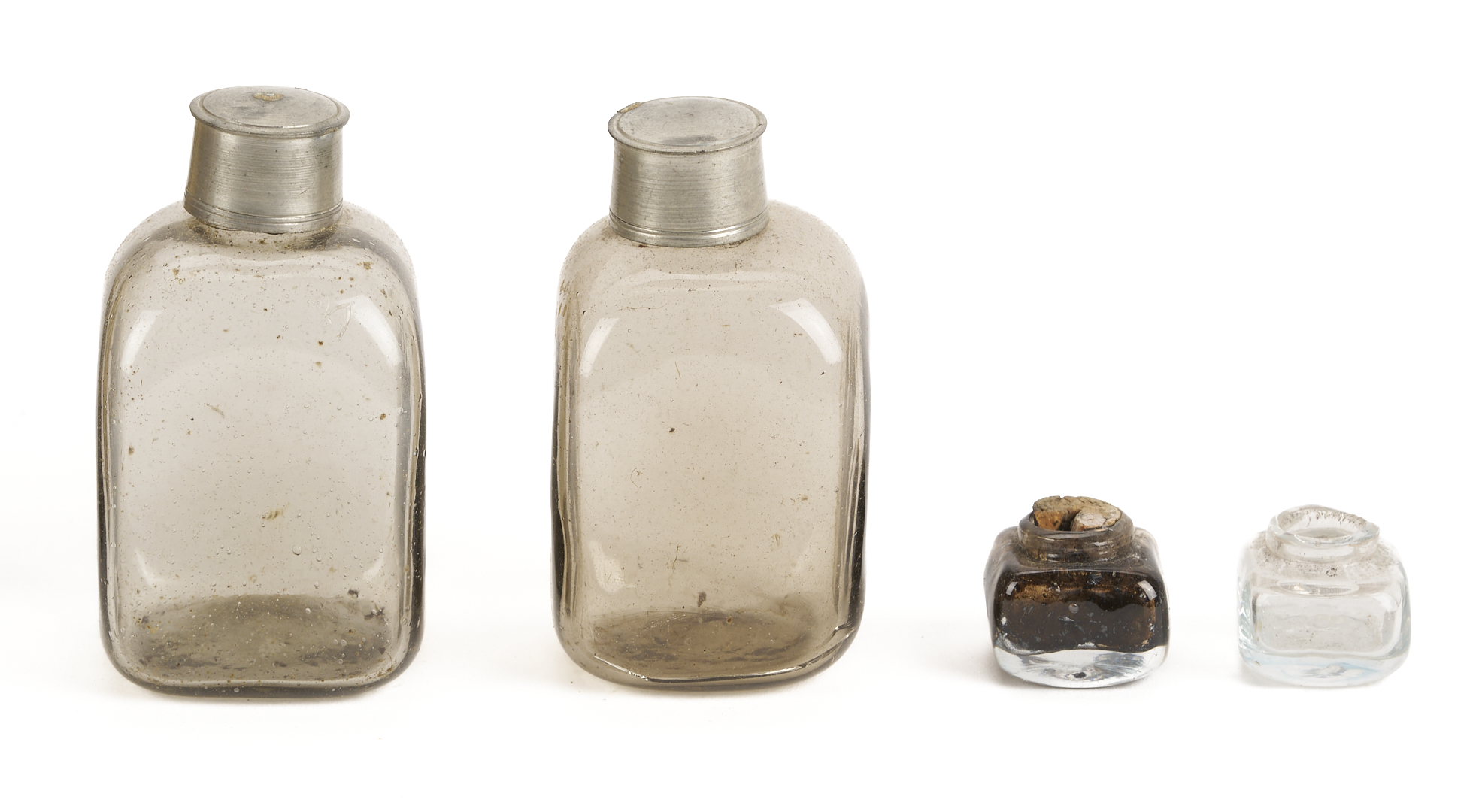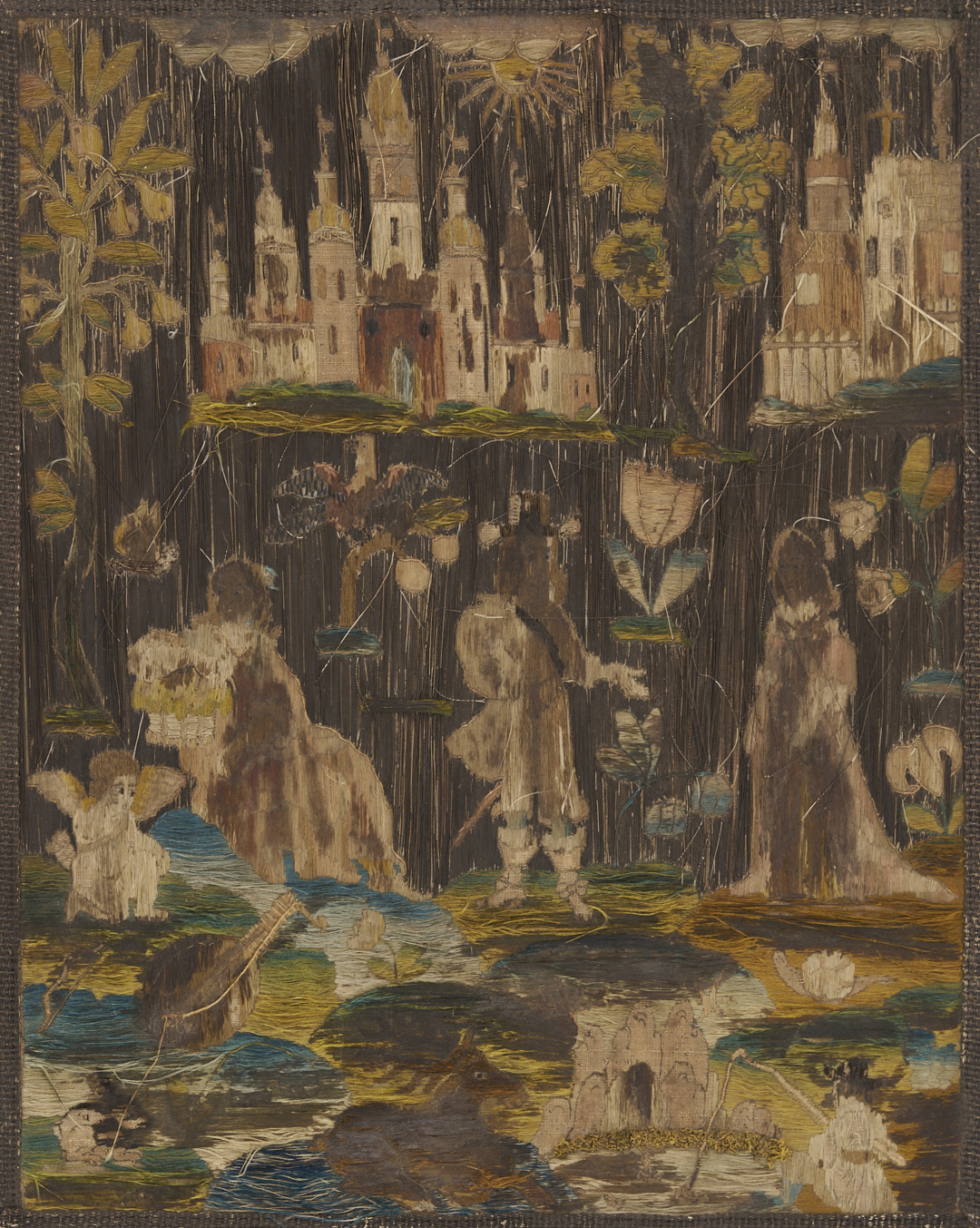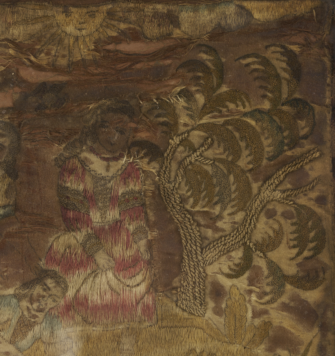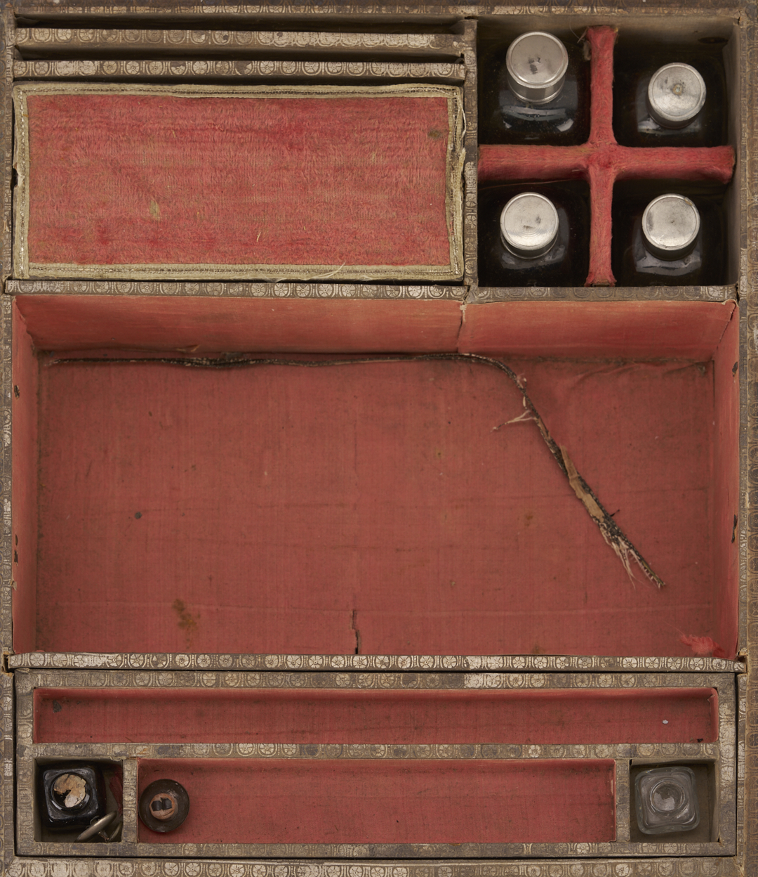 1st item: the original embroidery survives in relatively good condition with wear, especially at the latch, fraying, some fading, and scattered losses consistent with age and use. Two glass bottles are stuck in their compartments. Mirror broken. 2nd item: Fragile condition with fraying, losses and fading; some ground disintegration. Not examined out of frame.