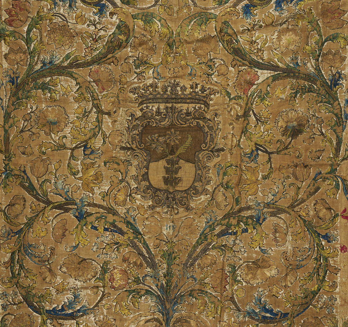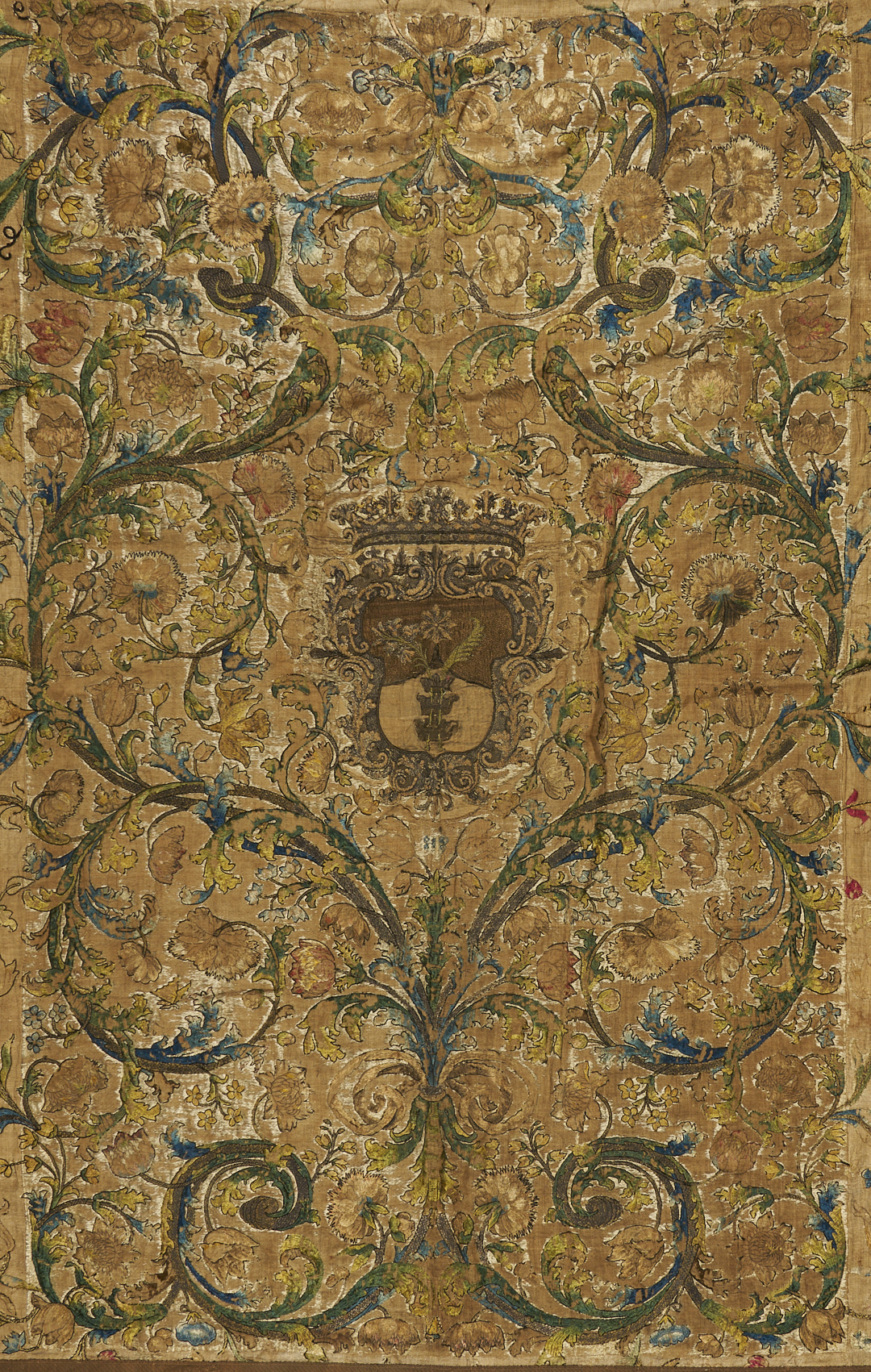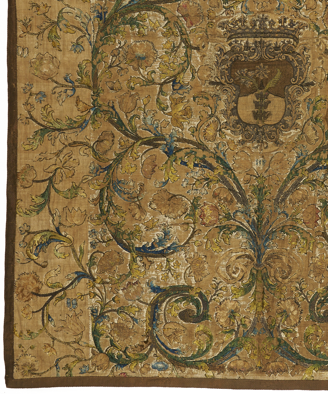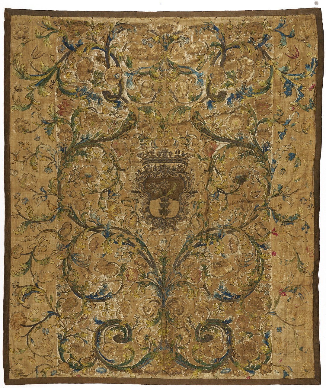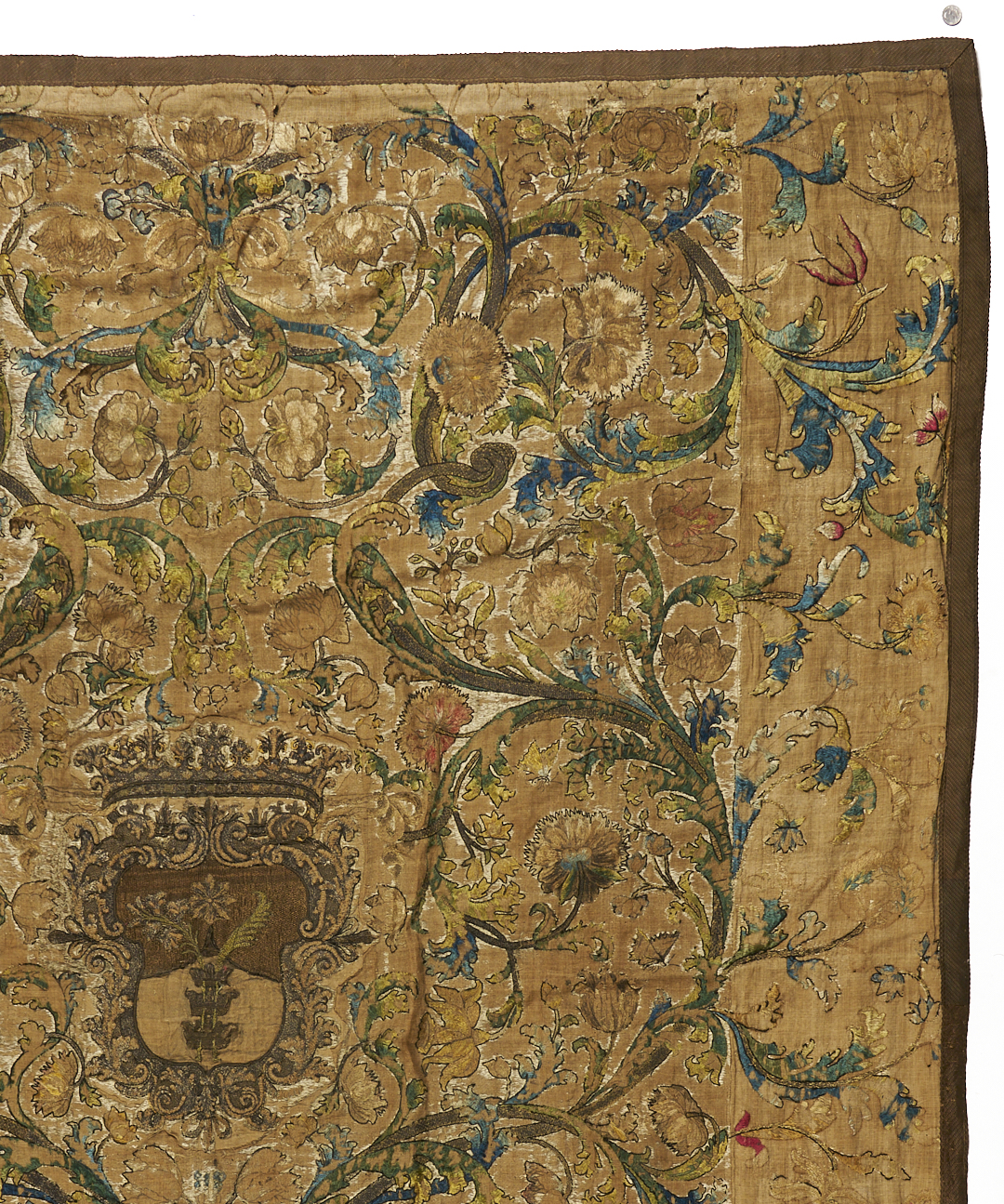 Continental tapestry or bed covering, silk on linen, featuring a central heraldic shield embroidered with metallic threads and surrounded by flowering vines and scrolls, all rendered in rich shades of teal, gold, and rose. Pattered brown wool binding and silk backing with velcro strip at top for ease of hanging. 88 in. x 74 in. 18th century.