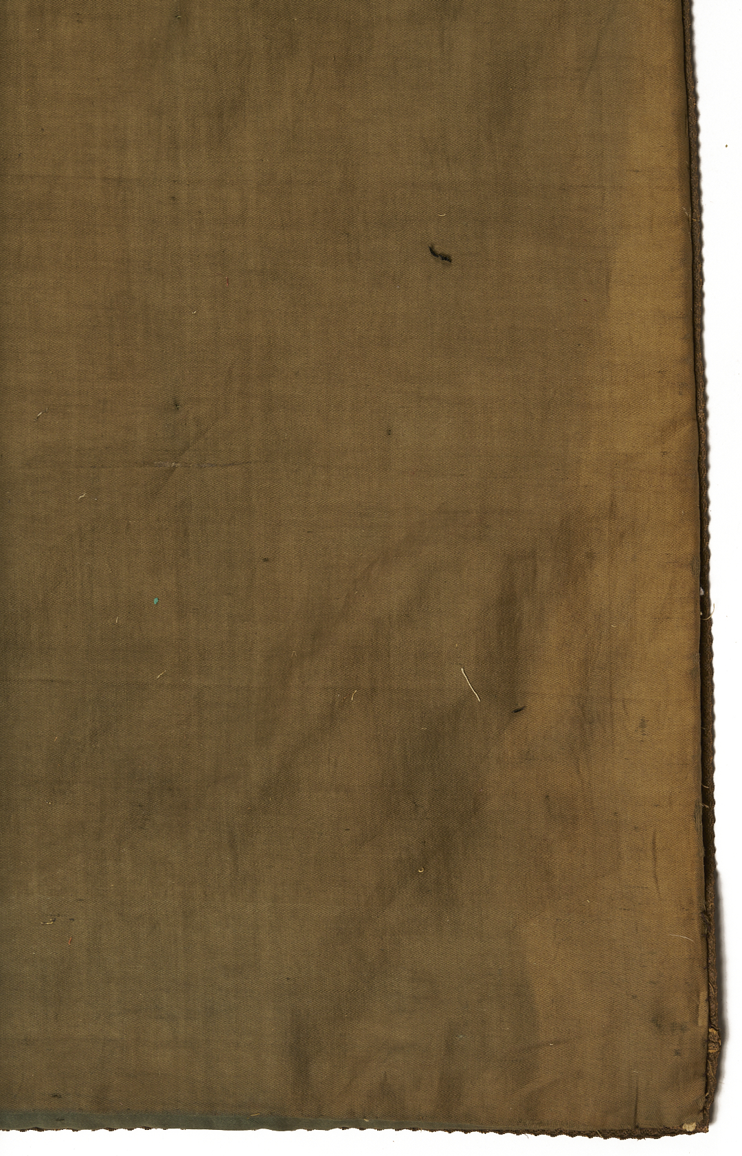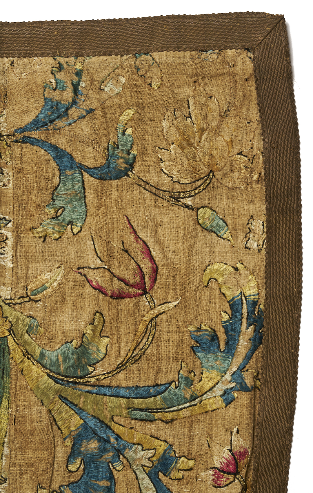 Velcro strip added to top for ease of hanging. Significant fading with fraying and losses to many silk threads. Scattered small stains and some small losses to linen ground, but overall stable and displayable condition.