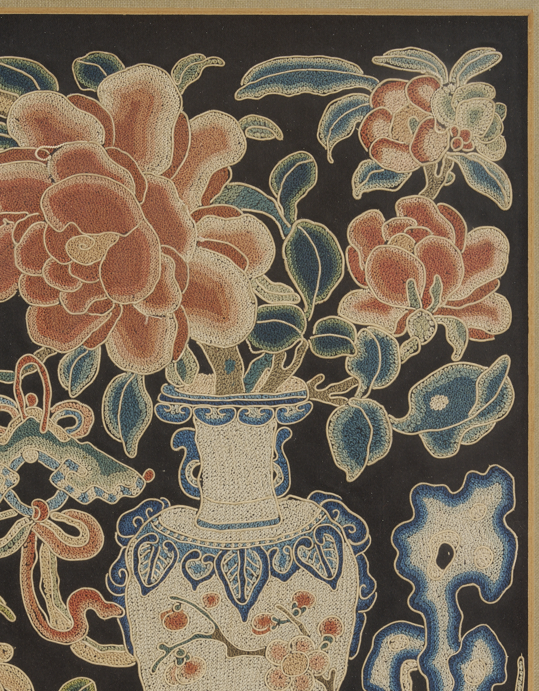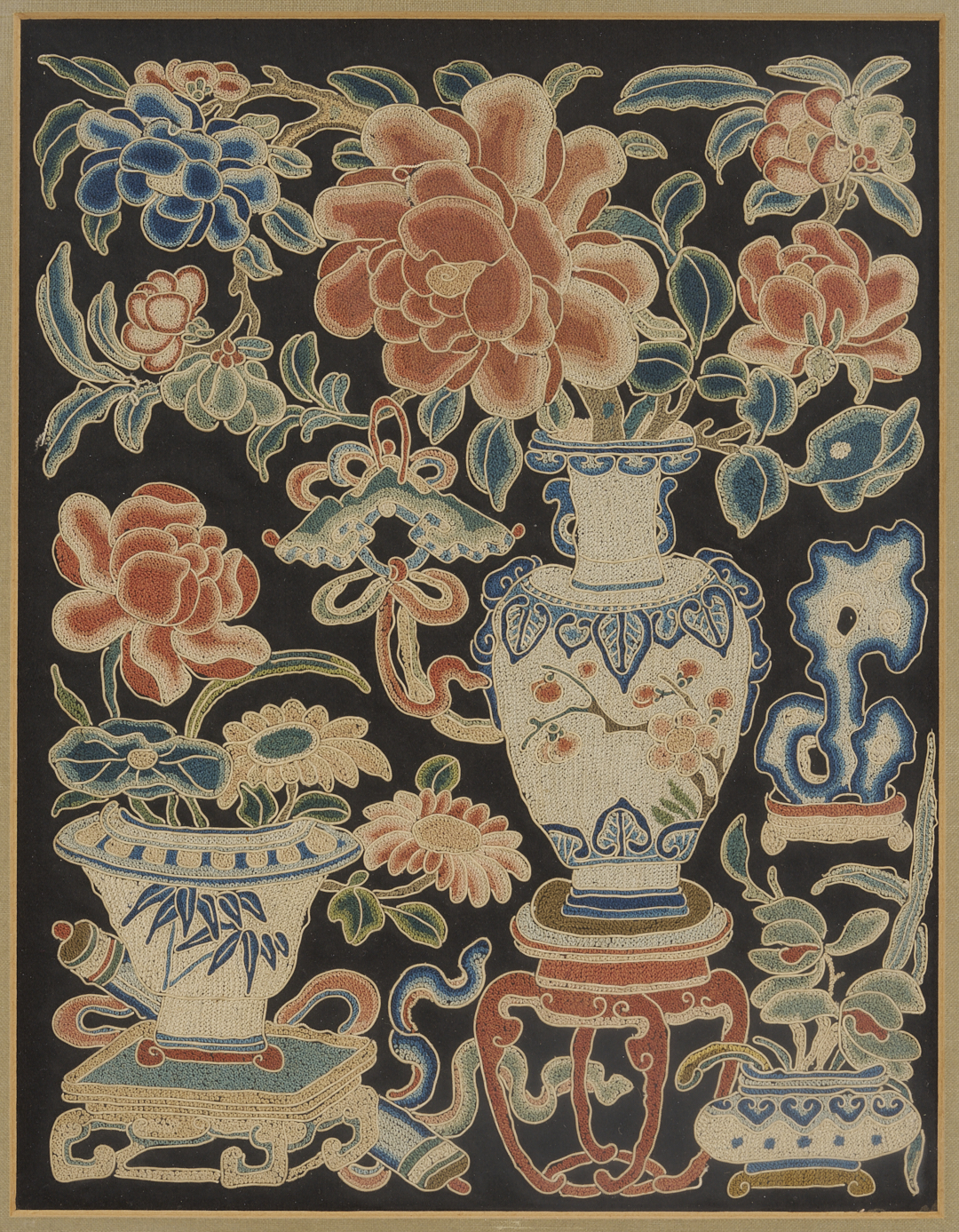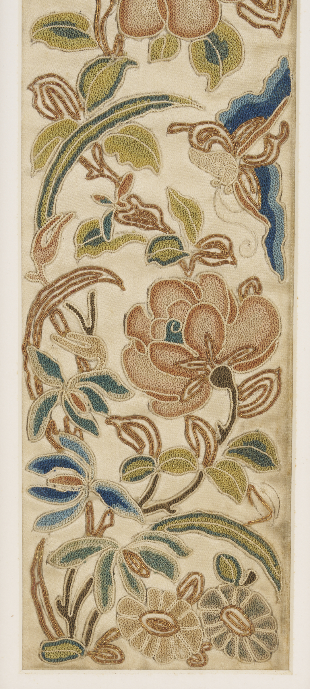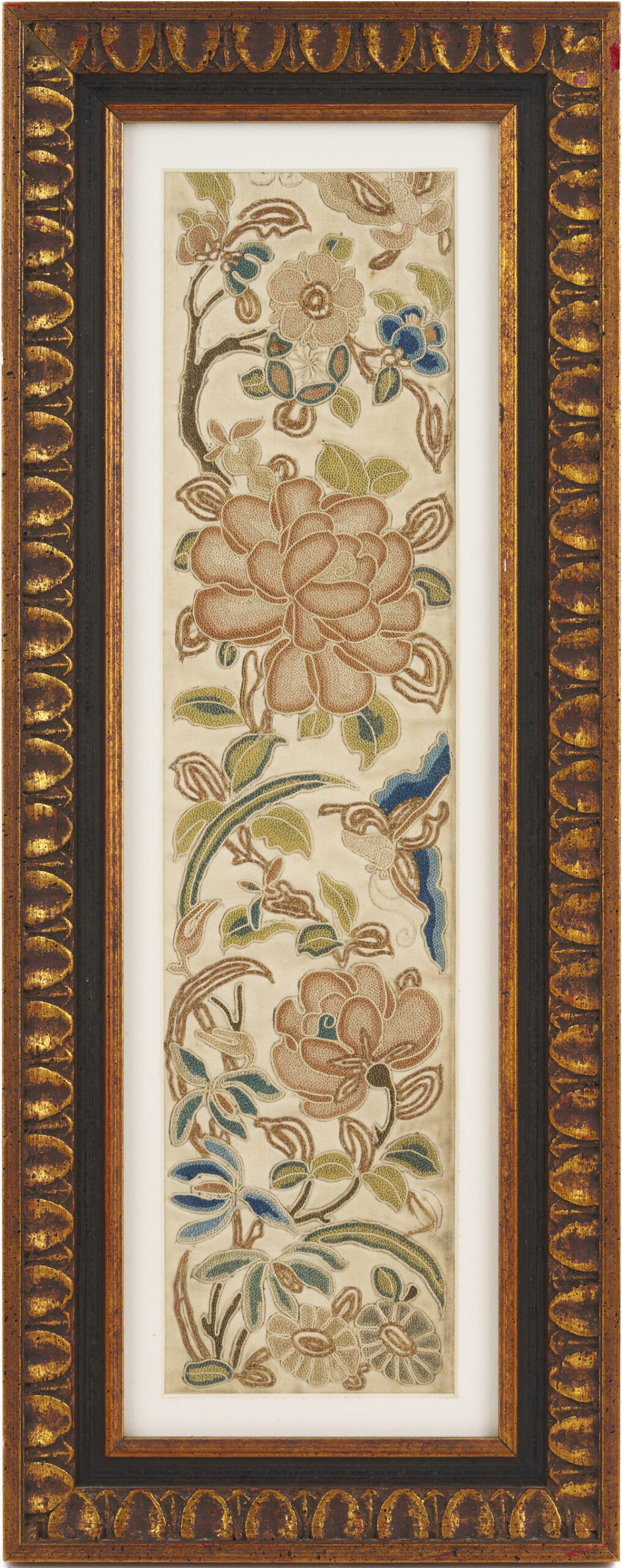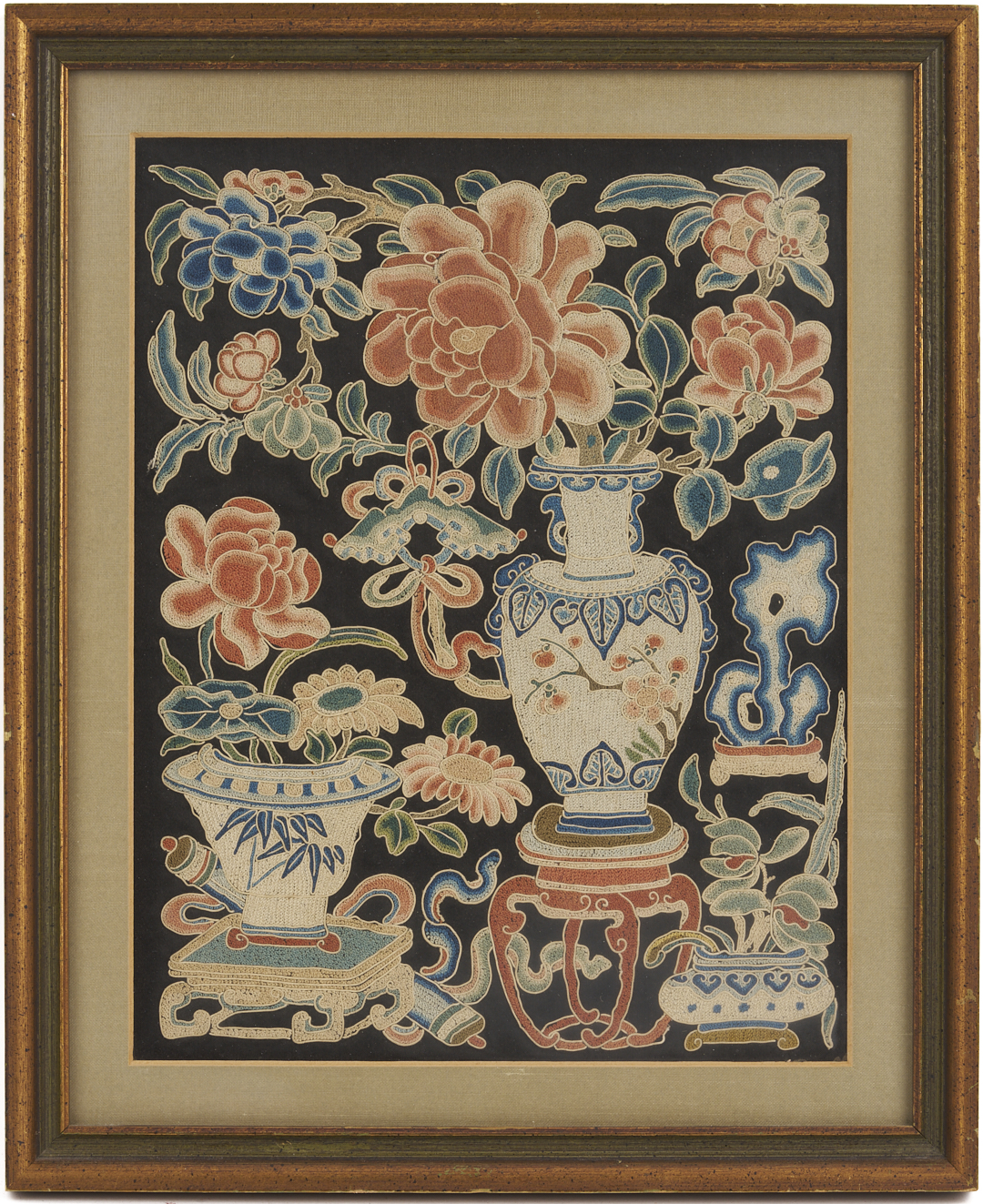 Three (3) Chinese framed “forbidden stitch” silk embroidered panels, two depicting flowers and bats, the third depicting precious objects. Framed sizes: 8 in. W x 19 1/2 in. H; 15 in. H x 14 in. W; and 14 1/2 in. H x 11 3/4 in. W. All early 20th century.