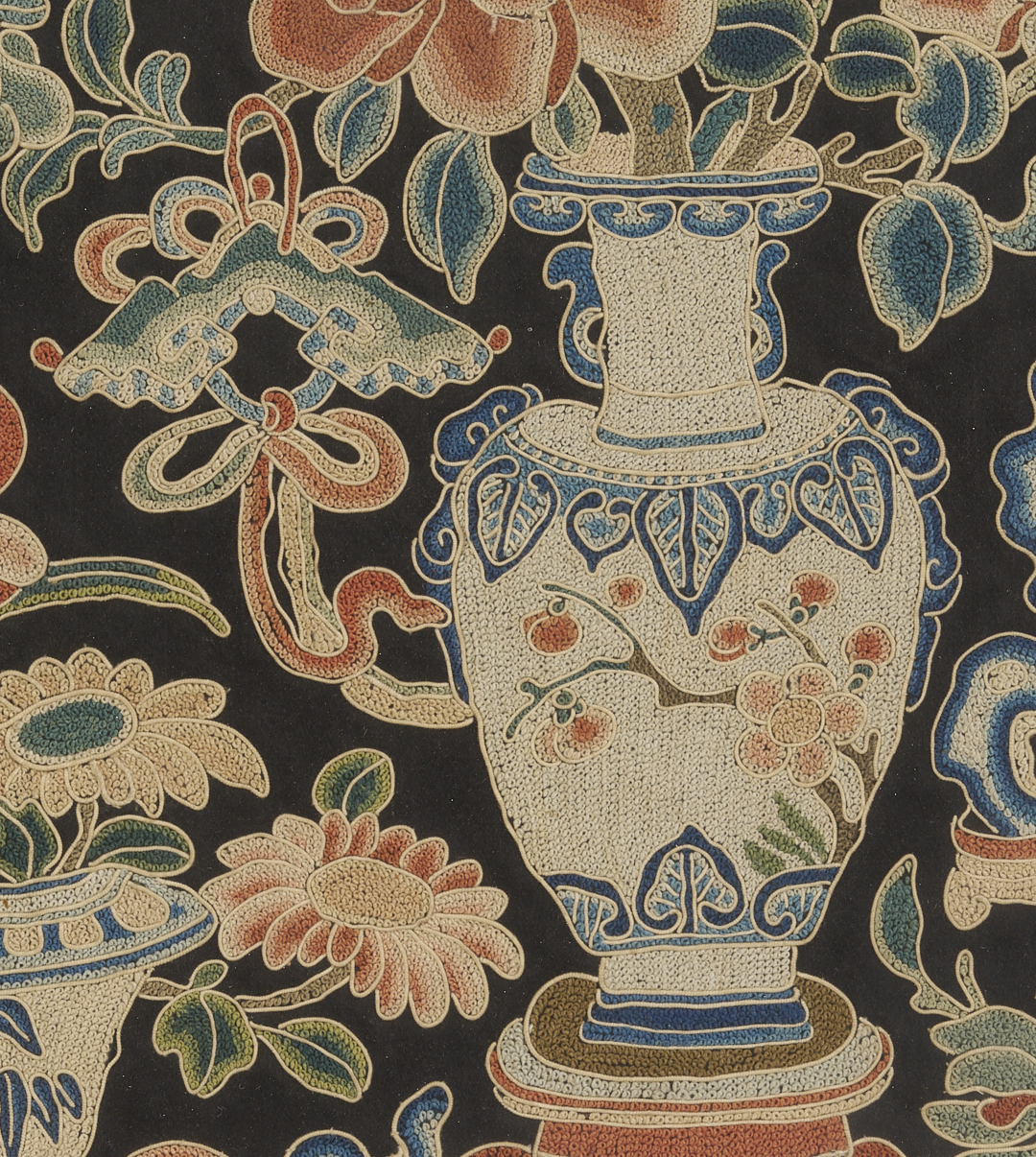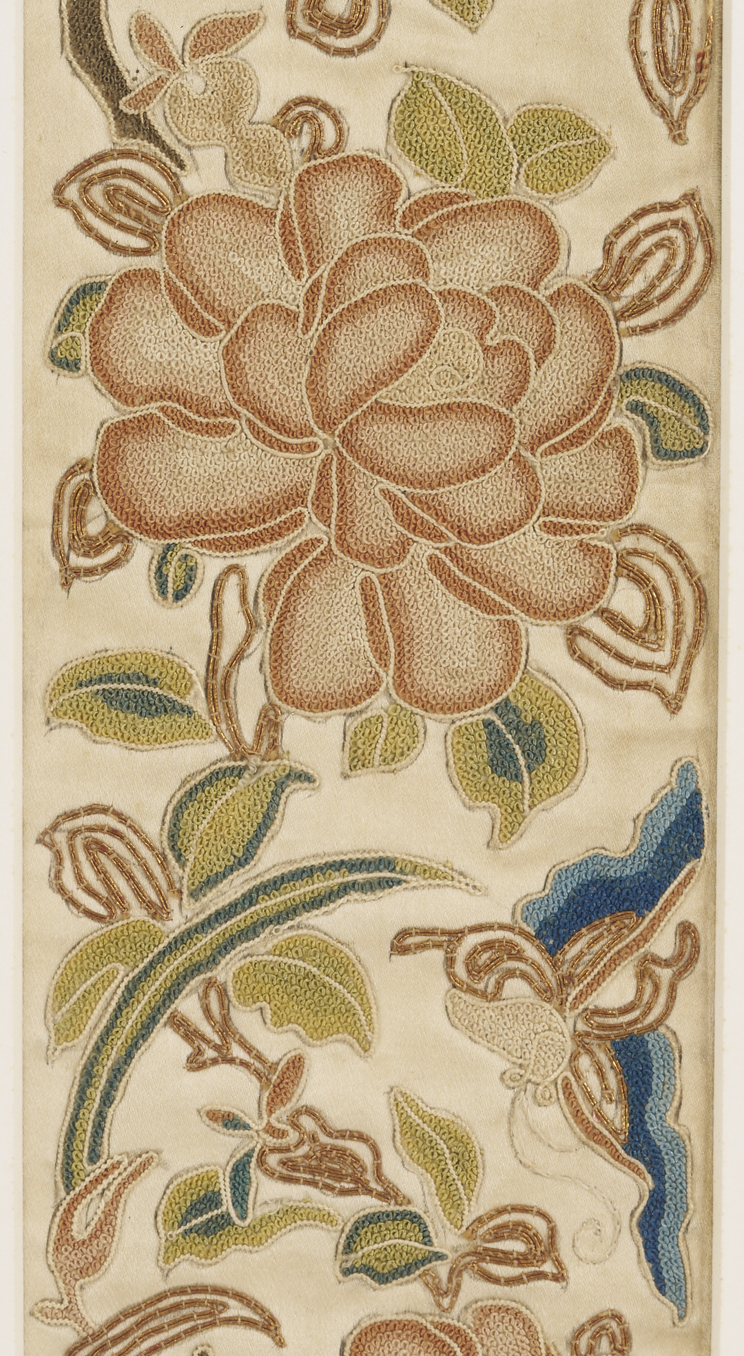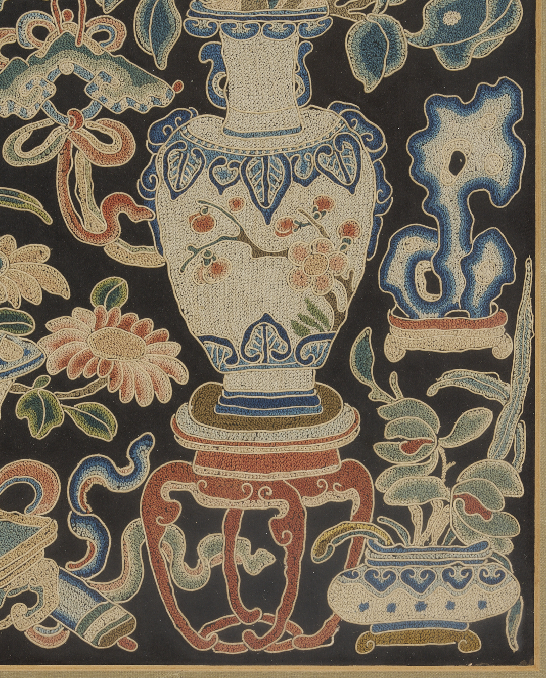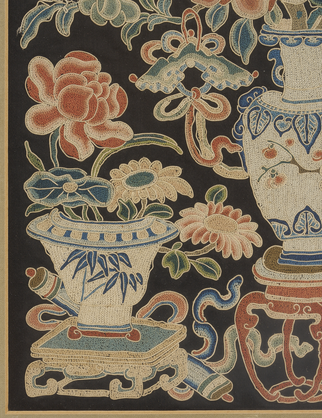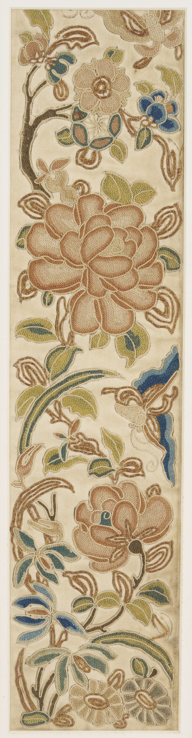Three (3) Chinese framed “forbidden stitch” silk embroidered panels, two depicting flowers and bats, the third depicting precious objects. Framed sizes: 8 in. W x 19 1/2 in. H; 15 in. H x 14 in. W; and 14 1/2 in. H x 11 3/4 in. W. All early 20th century.