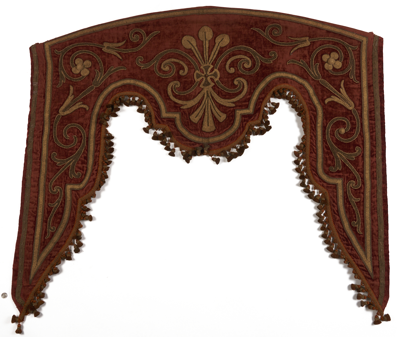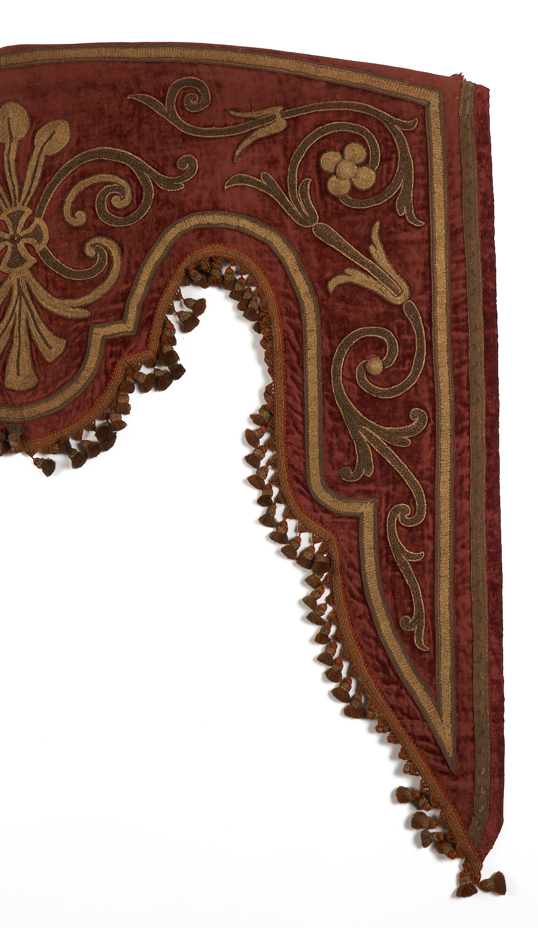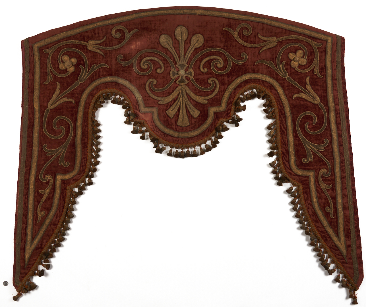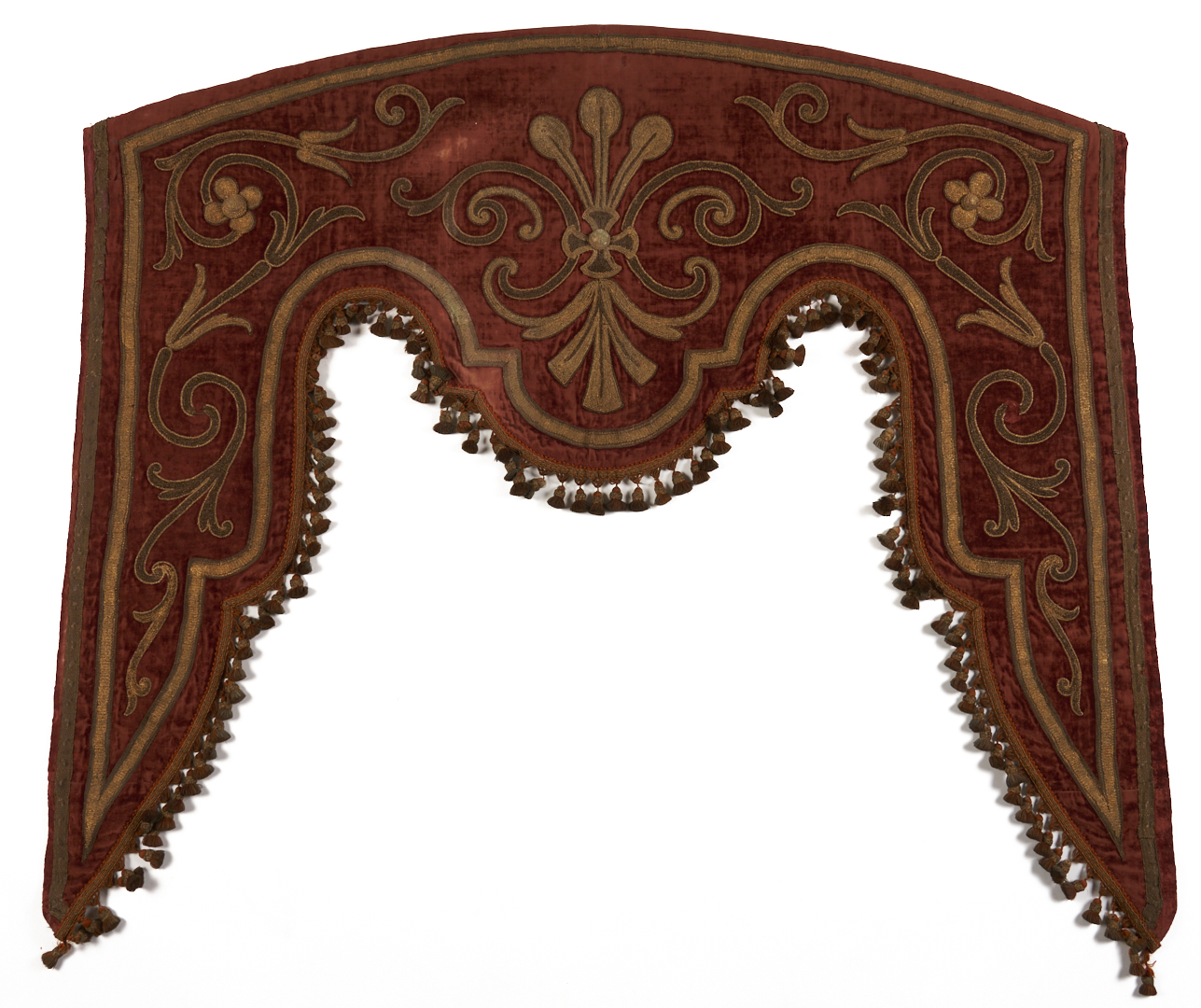 Pair of Renaissance style pelmets or drapery valances, burgundy silk velvet with appliqué raised floral scroll designs embroidered in metallic threads, and finished with tassel trim. Each with later bindings to backs. Each 59 in. W x 48 in. H. French or Italian, late 18th or early 19th century.