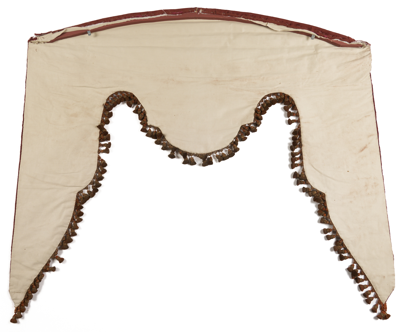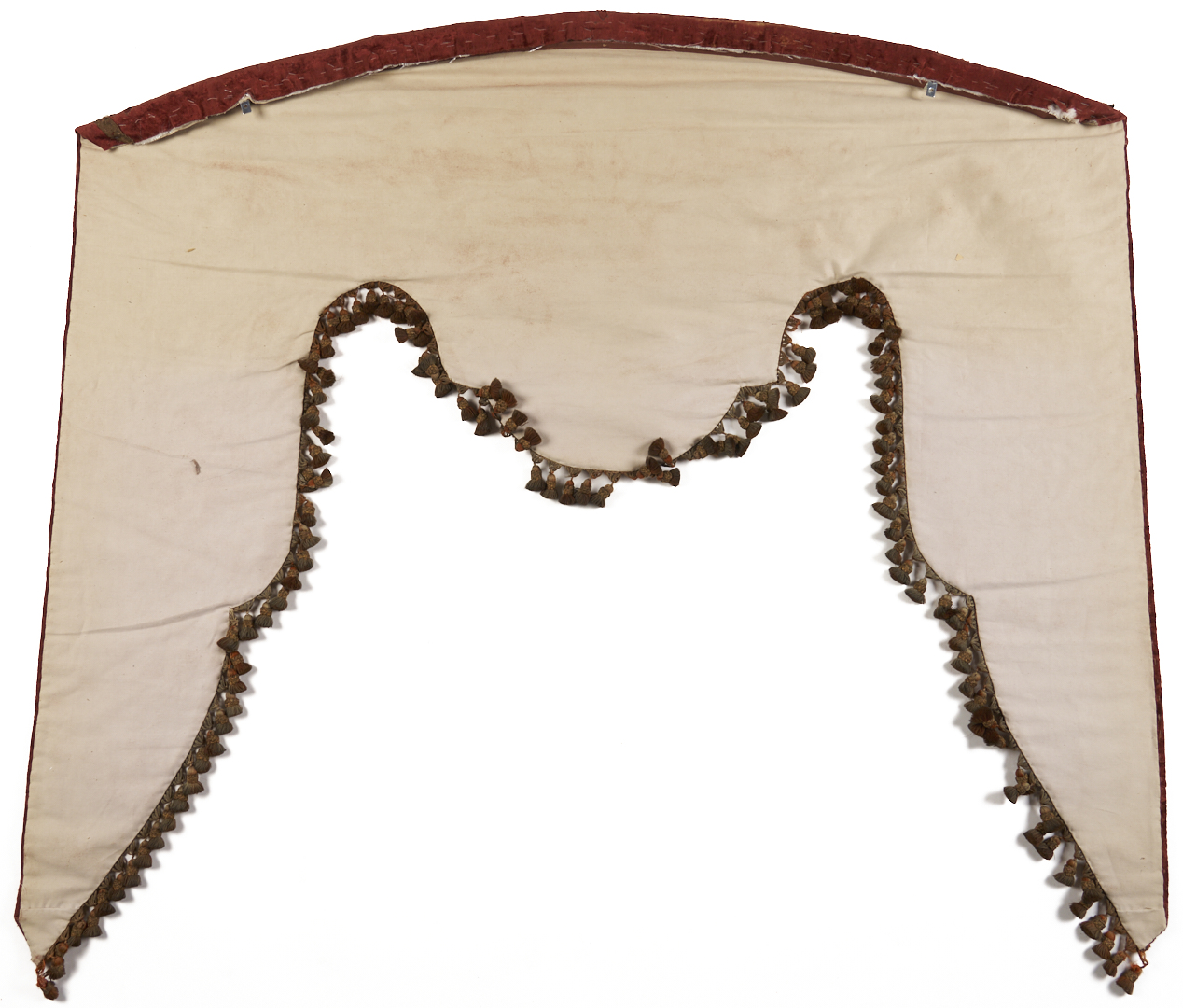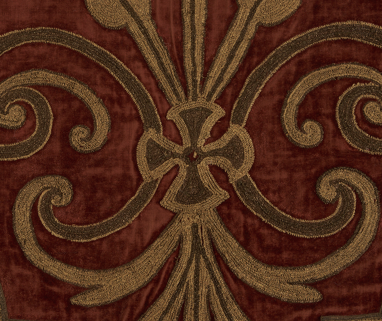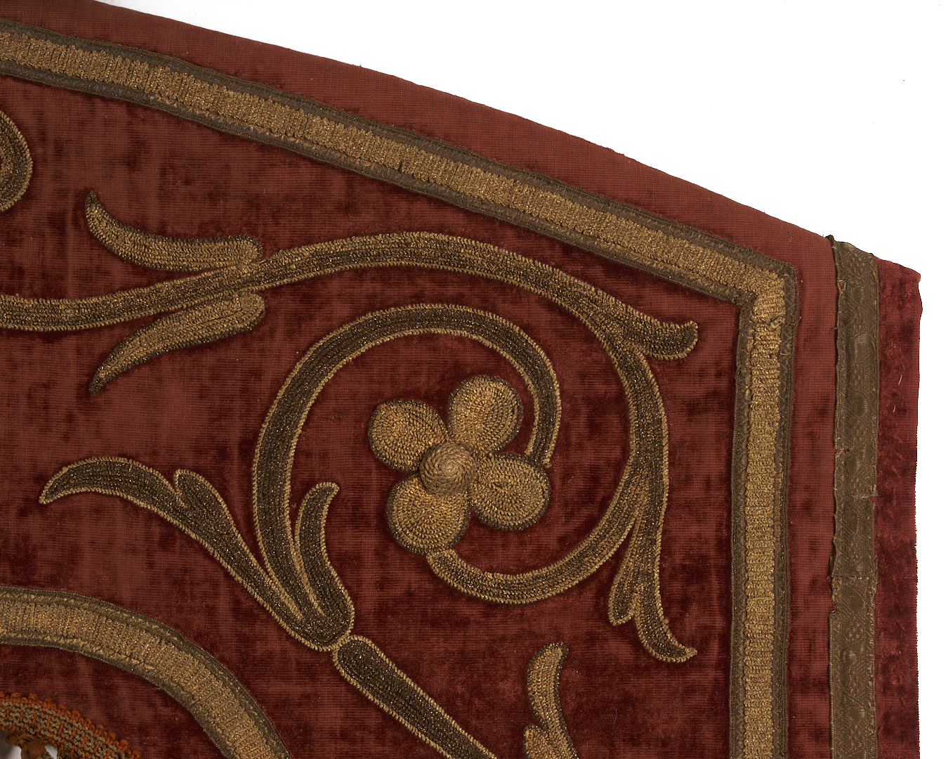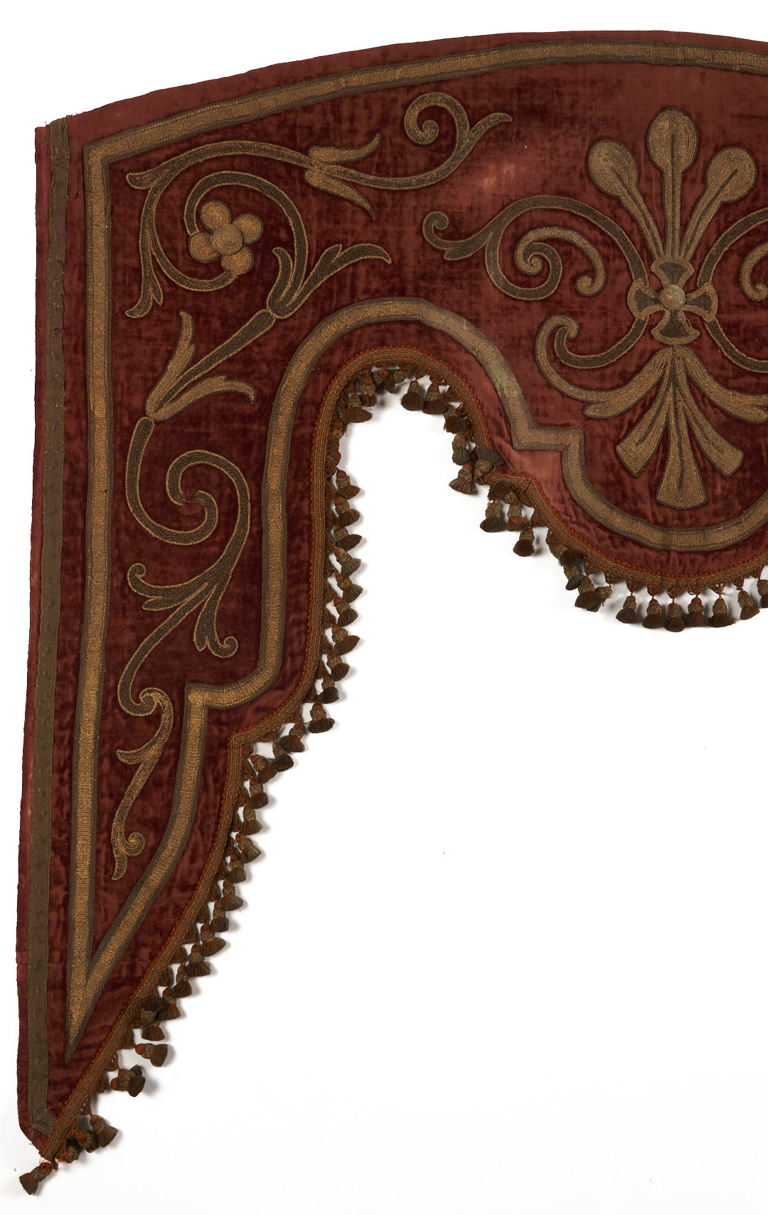Pair of Renaissance style pelmets or drapery valances, burgundy silk velvet with appliqué raised floral scroll designs embroidered in metallic threads, and finished with tassel trim. Each with later bindings to backs. Each 59 in. W x 48 in. H. French or Italian, late 18th or early 19th century.