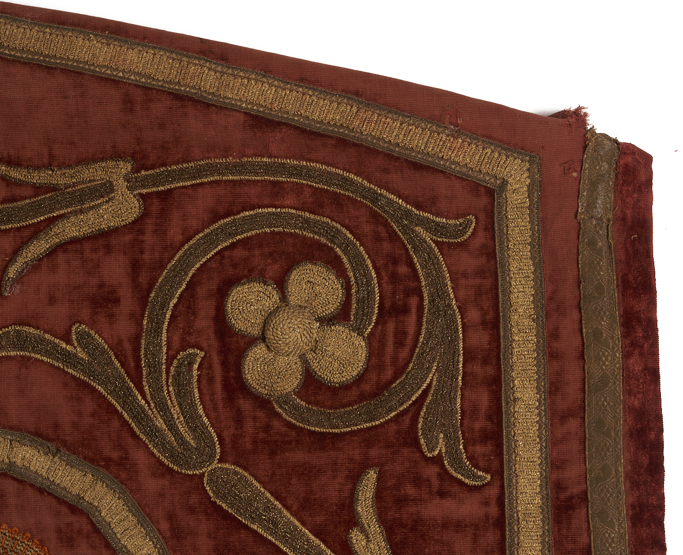 Overall good condition with some fading and wear to velvet pile, a few small losses/breaks to embroidery threads, some losses to applied strip at border, tassels likely added later.