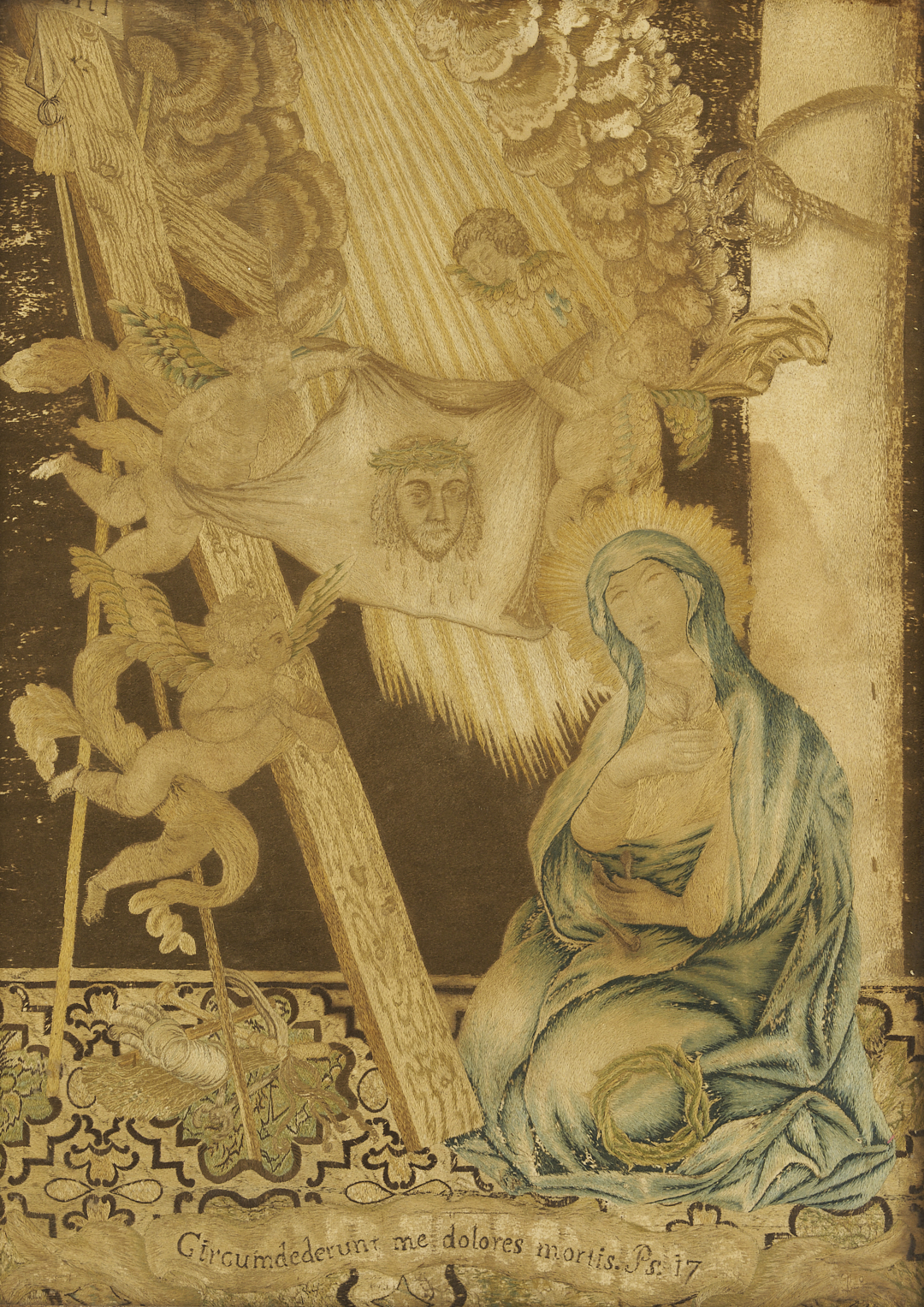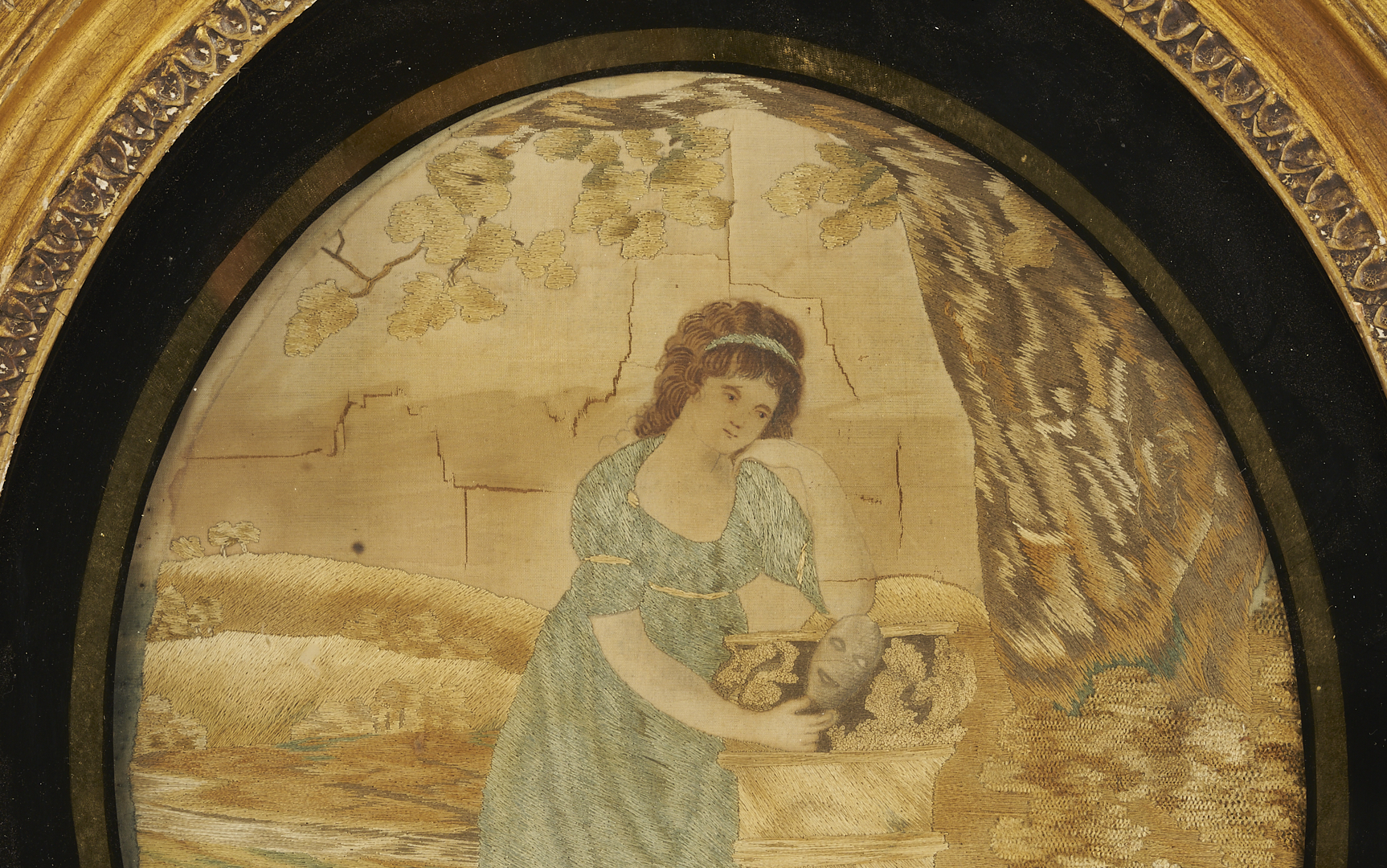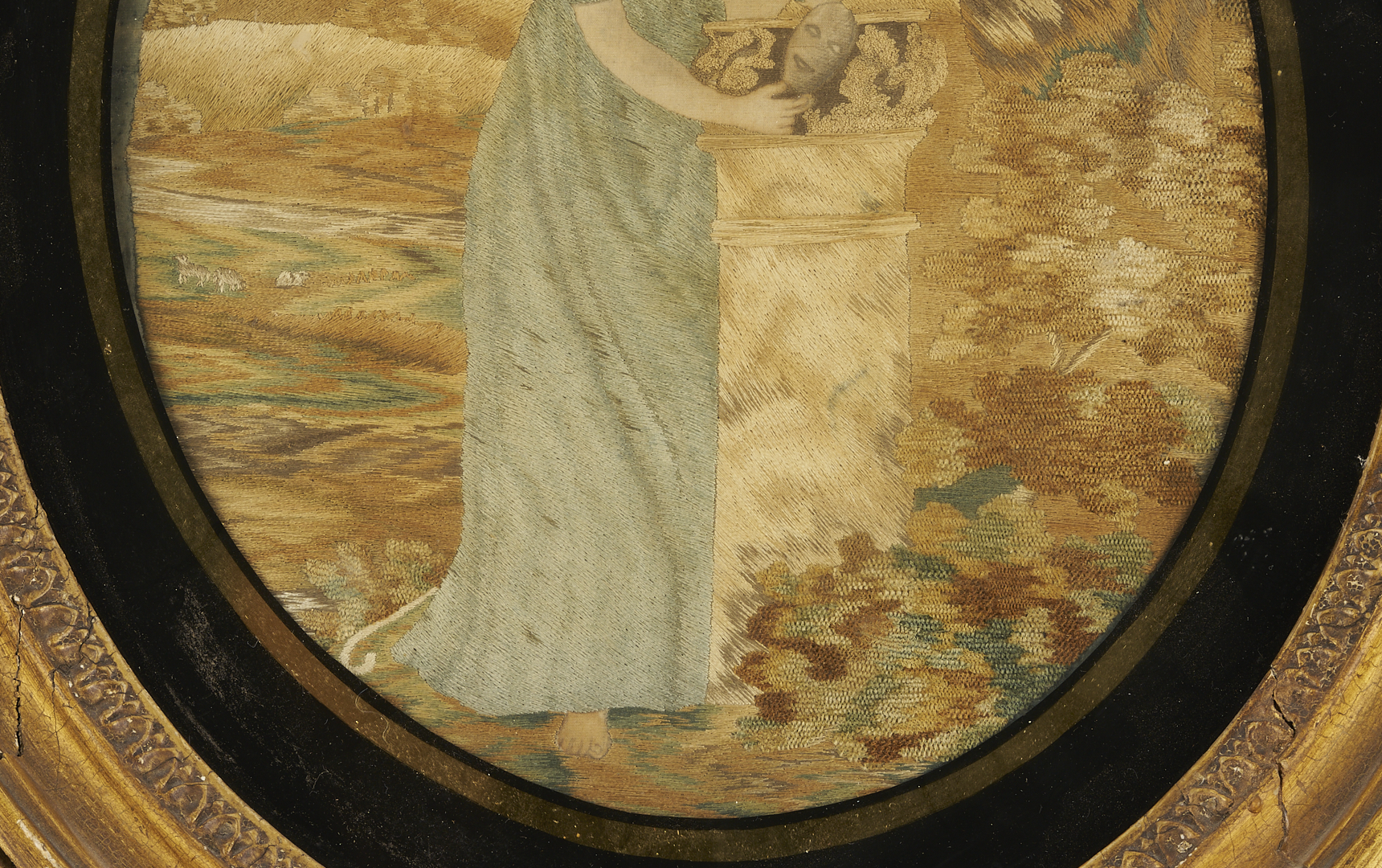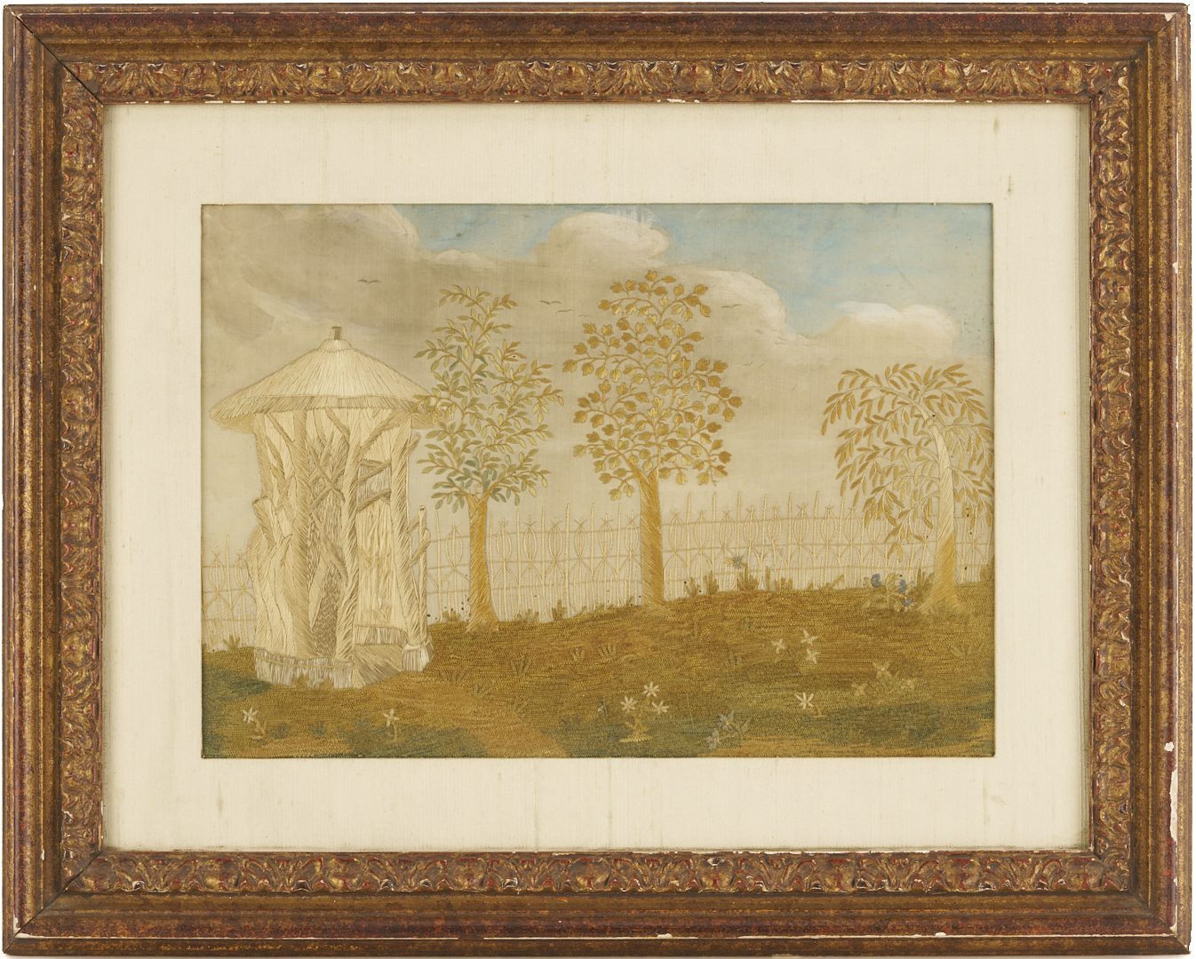 Three (3) late 18th – early 19th century silk embroideries, likely European. 1st item: A silk embroidered religious picture depicting the Virgin Mary at the foot of the cross, with the face of Christ emblazoned on a shroud held aloft by angels. At the bottom of the image is a banner reading “Circumdederunt me dolores mortis” (“The sorrows of death surrounded me,” Psalm 17). Under glass in a molded giltwood period lemon gilt frame. Sight: 20 1/2 in. H x 15 in. W. Frame: 24 in. H x 18 in. W. 2nd item: Watercolor and Silk embroidered picture, likely a mourning textile, depicting a naturalistic pavilion beside two two trees and a young weeping willow, before an intricate fence. Matted and framed under glass in a molded frame with dark gold color gilding. Sight: 13 in. W x 9 in. H. Frame: 19 1/2 in. W x 15 1/2 in. H. 3rd item: Oval watercolor and silk embroidered mourning picture, depicting a woman in blue dress in a landscape; she leans against a column looking sadly at a mask in her hand. Under glass with a reverse glass painted black and gold mat and old, likely original oval giltwood frame. Image: 9 in. H x 7 1/2 in. W. Frame: 14 in. H x 12 in. W.