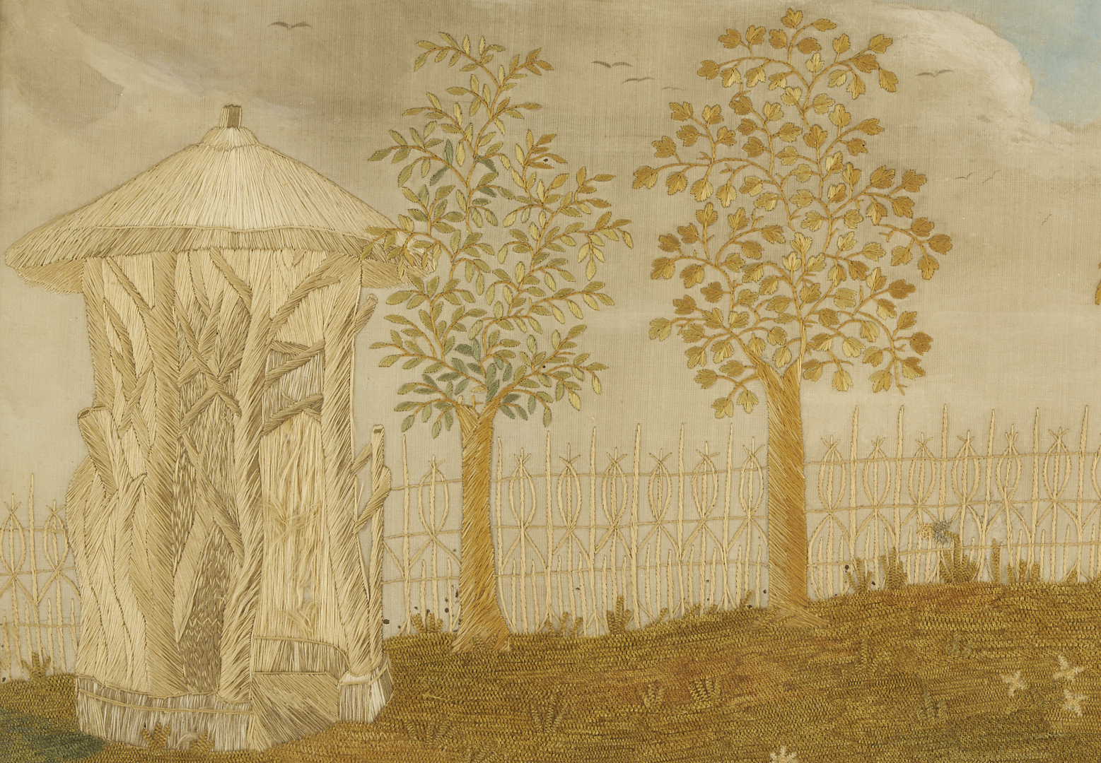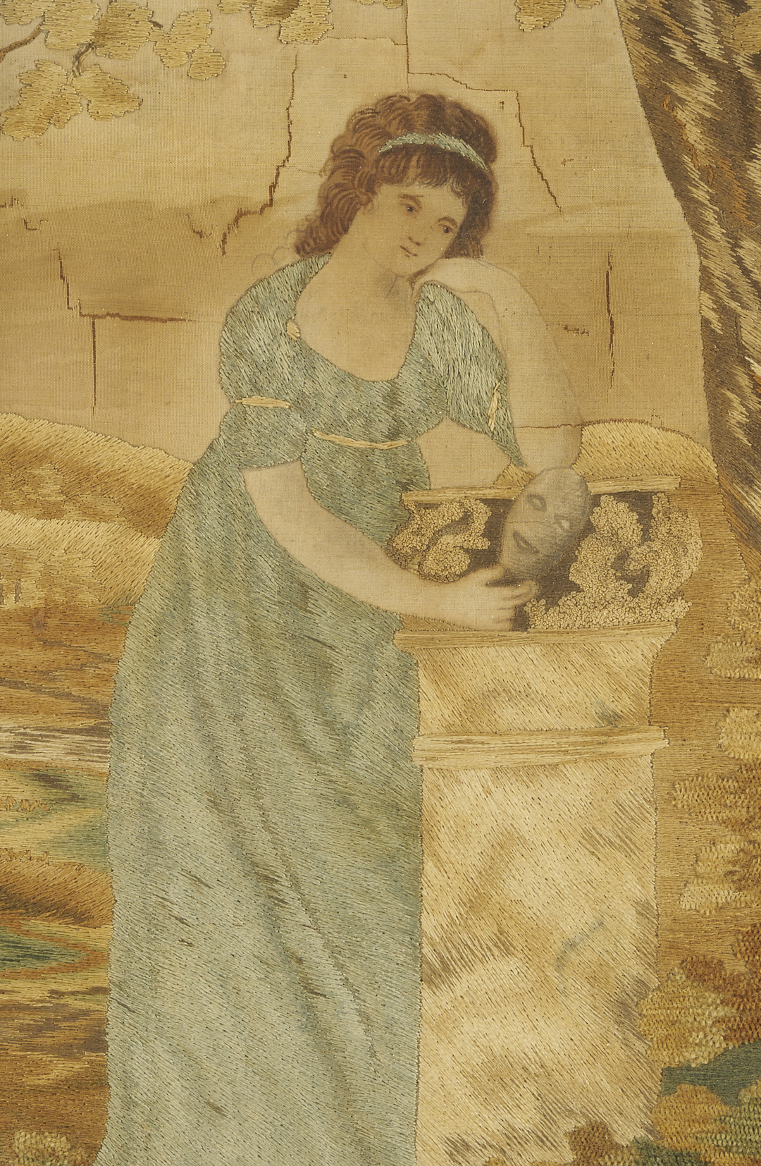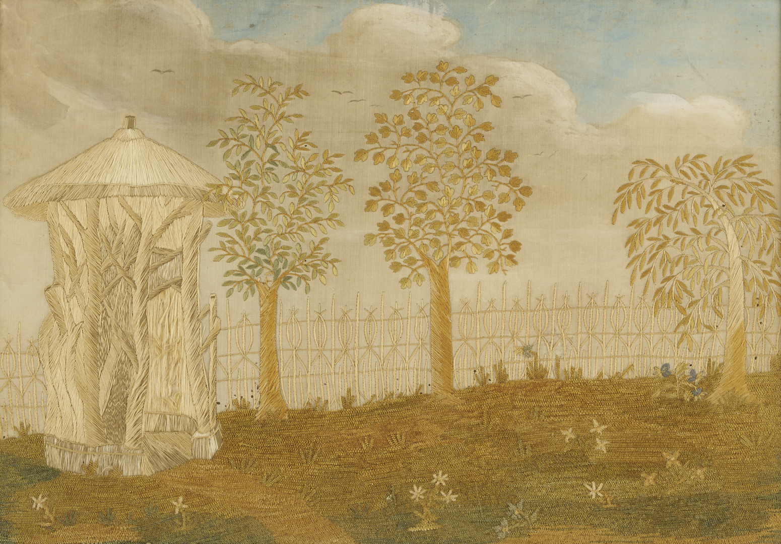 Three (3) late 18th – early 19th century silk embroideries, likely European. 1st item: A silk embroidered religious picture depicting the Virgin Mary at the foot of the cross, with the face of Christ emblazoned on a shroud held aloft by angels. At the bottom of the image is a banner reading “Circumdederunt me dolores mortis” (“The sorrows of death surrounded me,” Psalm 17). Under glass in a molded giltwood period lemon gilt frame. Sight: 20 1/2 in. H x 15 in. W. Frame: 24 in. H x 18 in. W. 2nd item: Watercolor and Silk embroidered picture, likely a mourning textile, depicting a naturalistic pavilion beside two two trees and a young weeping willow, before an intricate fence. Matted and framed under glass in a molded frame with dark gold color gilding. Sight: 13 in. W x 9 in. H. Frame: 19 1/2 in. W x 15 1/2 in. H. 3rd item: Oval watercolor and silk embroidered mourning picture, depicting a woman in blue dress in a landscape; she leans against a column looking sadly at a mask in her hand. Under glass with a reverse glass painted black and gold mat and old, likely original oval giltwood frame. Image: 9 in. H x 7 1/2 in. W. Frame: 14 in. H x 12 in. W.