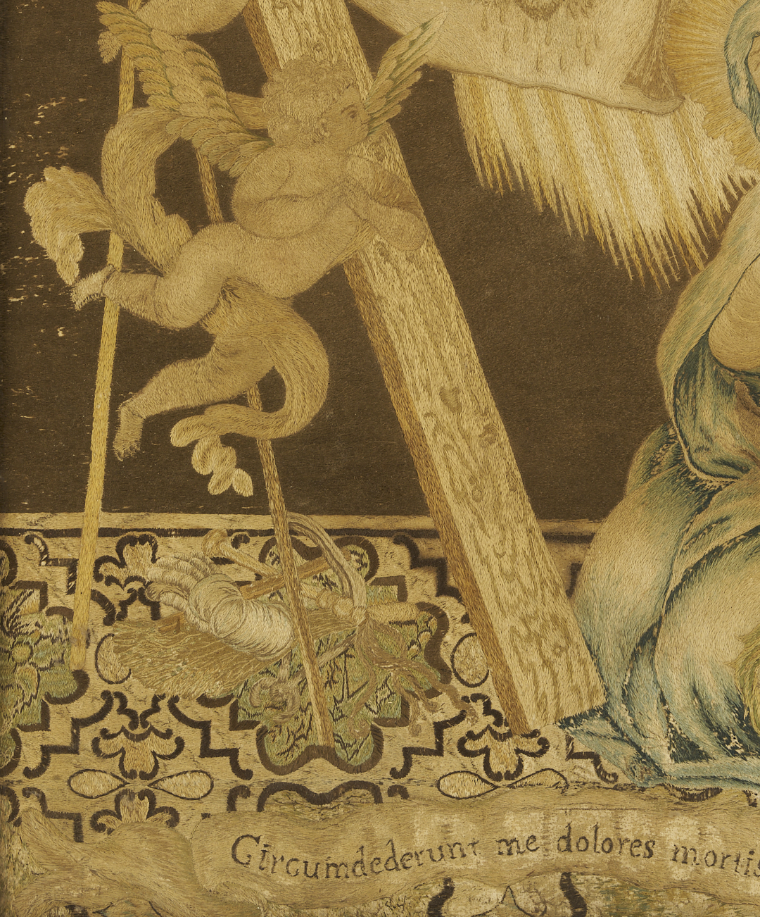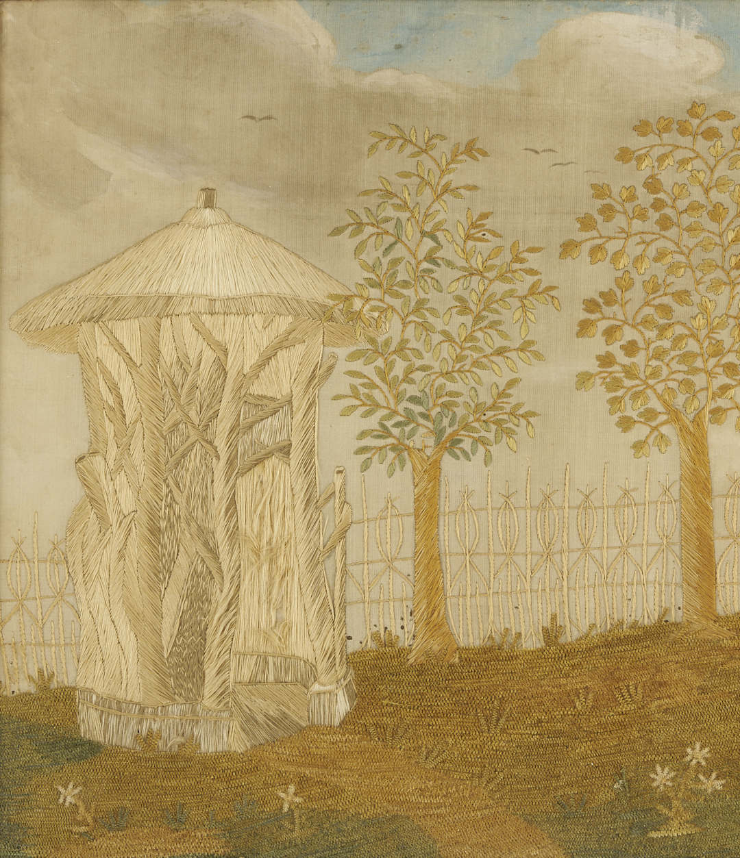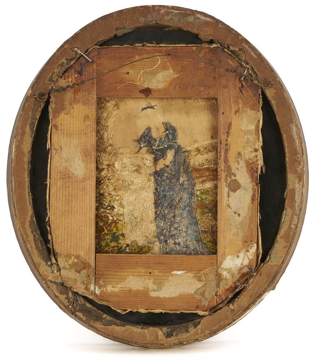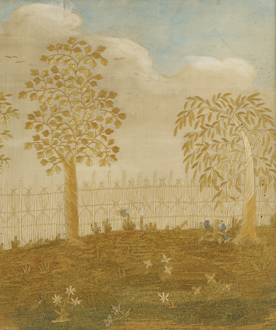 Three (3) late 18th – early 19th century silk embroideries, likely European. 1st item: A silk embroidered religious picture depicting the Virgin Mary at the foot of the cross, with the face of Christ emblazoned on a shroud held aloft by angels. At the bottom of the image is a banner reading “Circumdederunt me dolores mortis” (“The sorrows of death surrounded me,” Psalm 17). Under glass in a molded giltwood period lemon gilt frame. Sight: 20 1/2 in. H x 15 in. W. Frame: 24 in. H x 18 in. W. 2nd item: Watercolor and Silk embroidered picture, likely a mourning textile, depicting a naturalistic pavilion beside two two trees and a young weeping willow, before an intricate fence. Matted and framed under glass in a molded frame with dark gold color gilding. Sight: 13 in. W x 9 in. H. Frame: 19 1/2 in. W x 15 1/2 in. H. 3rd item: Oval watercolor and silk embroidered mourning picture, depicting a woman in blue dress in a landscape; she leans against a column looking sadly at a mask in her hand. Under glass with a reverse glass painted black and gold mat and old, likely original oval giltwood frame. Image: 9 in. H x 7 1/2 in. W. Frame: 14 in. H x 12 in. W.