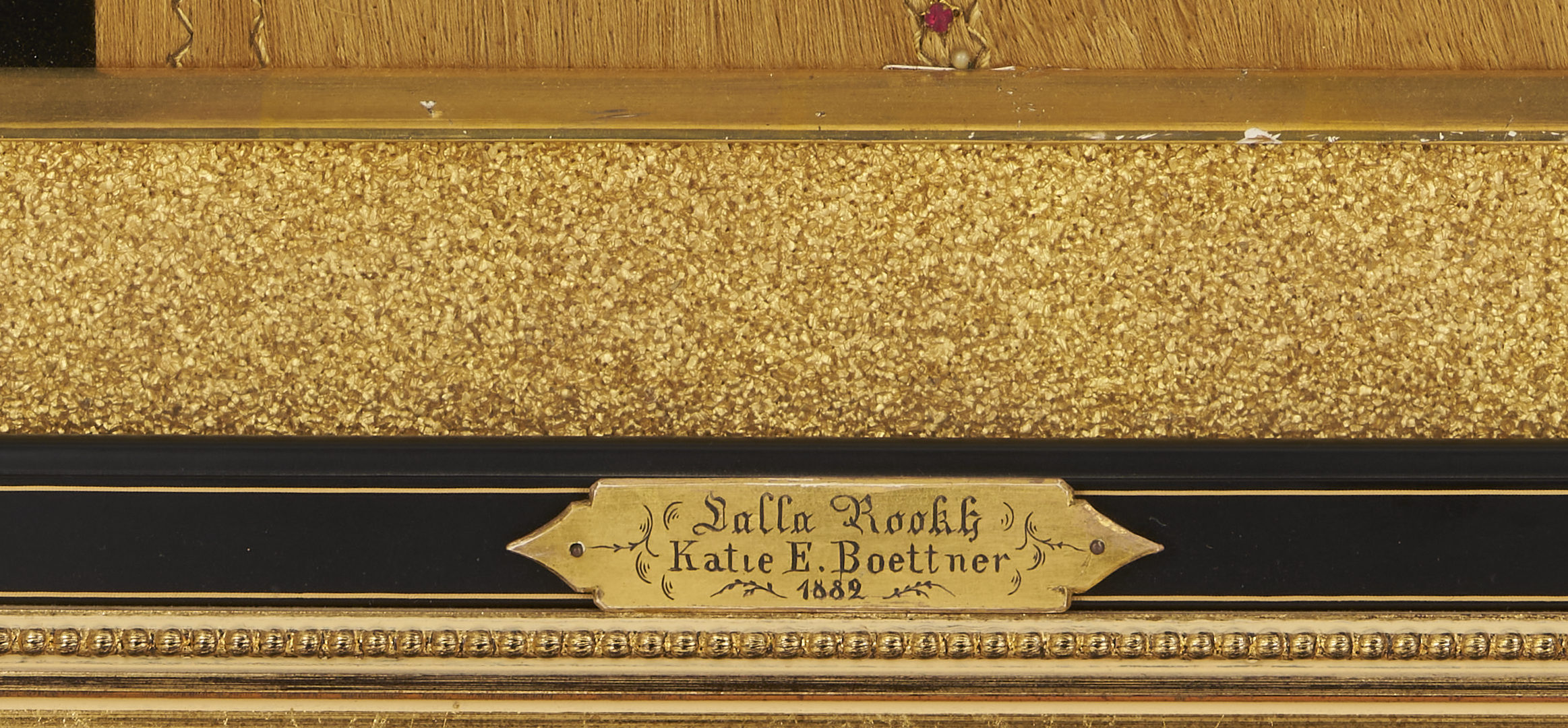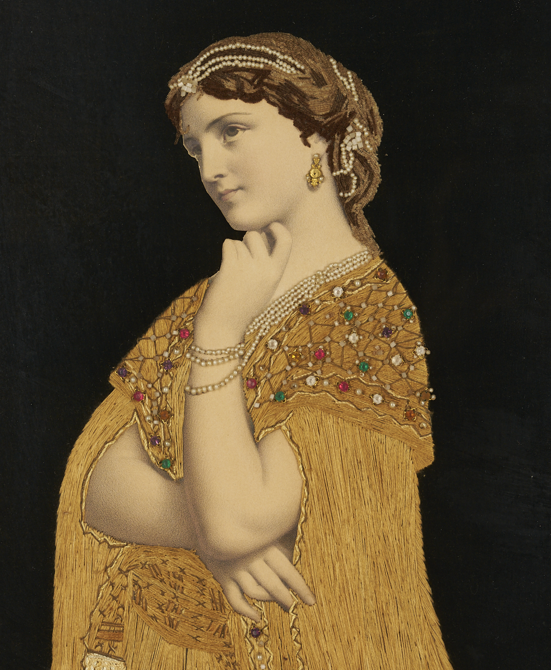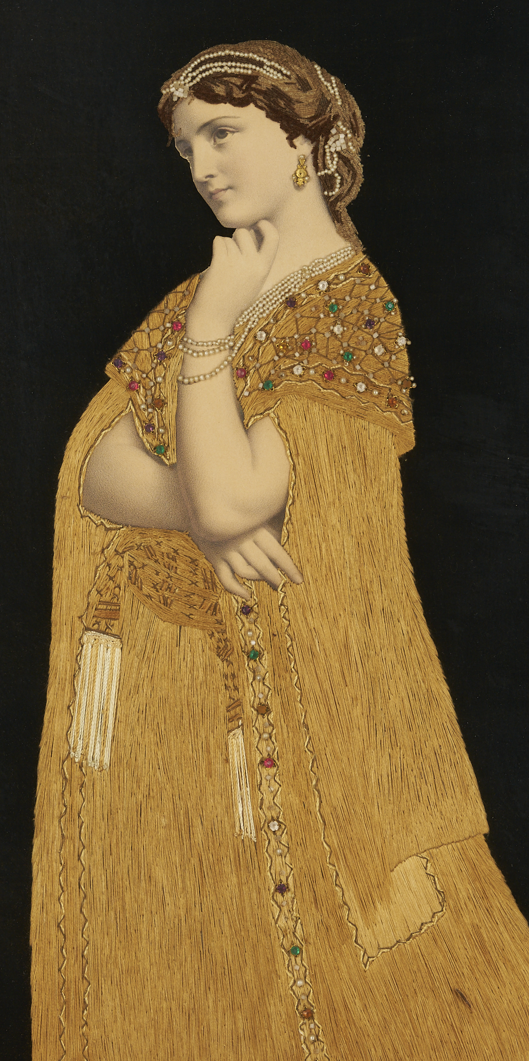 Late 19th Century Art Nouveau silk embroidered print depicting “Lalla Rookh” in an ornate gown, hand embellished with metallic gold threads, pearls, and faux jewels, on a black background. Engraved tag on the frame attributes the handiwork to Katie E. Boettner, with the date of 1882. Note: Lalla Rookh was the titular, fictional character of a romantic Orientalist poem by Thomas Moore, published in 1817. Housed under glass in a parcel gilt and ebonized frame with gold gold-encrusted mat. Sight: 23 in. H x 14 in. W. Frame: 33 in. H x 24 in. W.