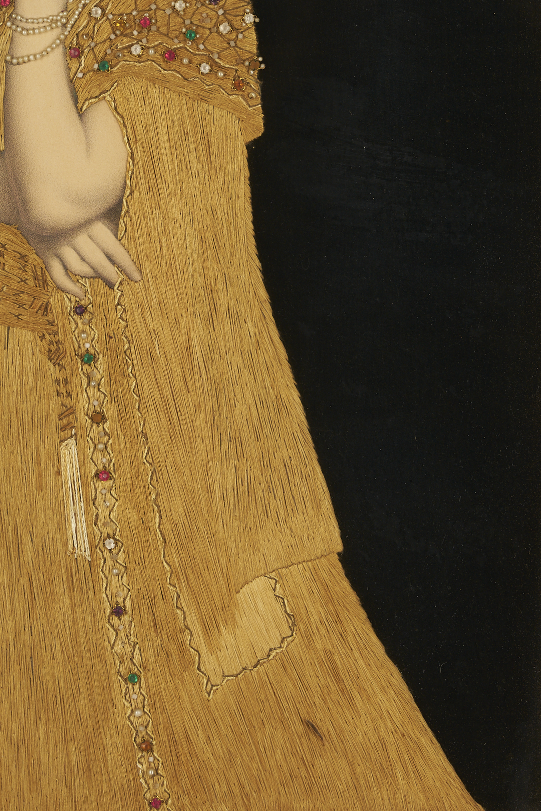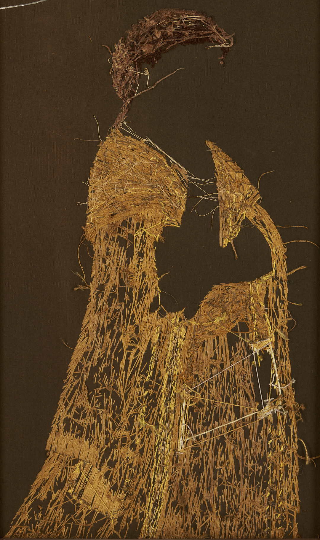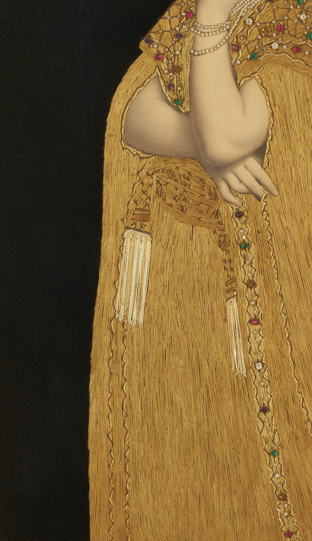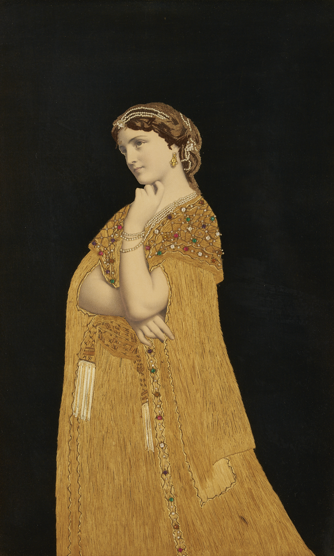 Late 19th Century Art Nouveau silk embroidered print depicting “Lalla Rookh” in an ornate gown, hand embellished with metallic gold threads, pearls, and faux jewels, on a black background. Engraved tag on the frame attributes the handiwork to Katie E. Boettner, with the date of 1882. Note: Lalla Rookh was the titular, fictional character of a romantic Orientalist poem by Thomas Moore, published in 1817. Housed under glass in a parcel gilt and ebonized frame with gold gold-encrusted mat. Sight: 23 in. H x 14 in. W. Frame: 33 in. H x 24 in. W.