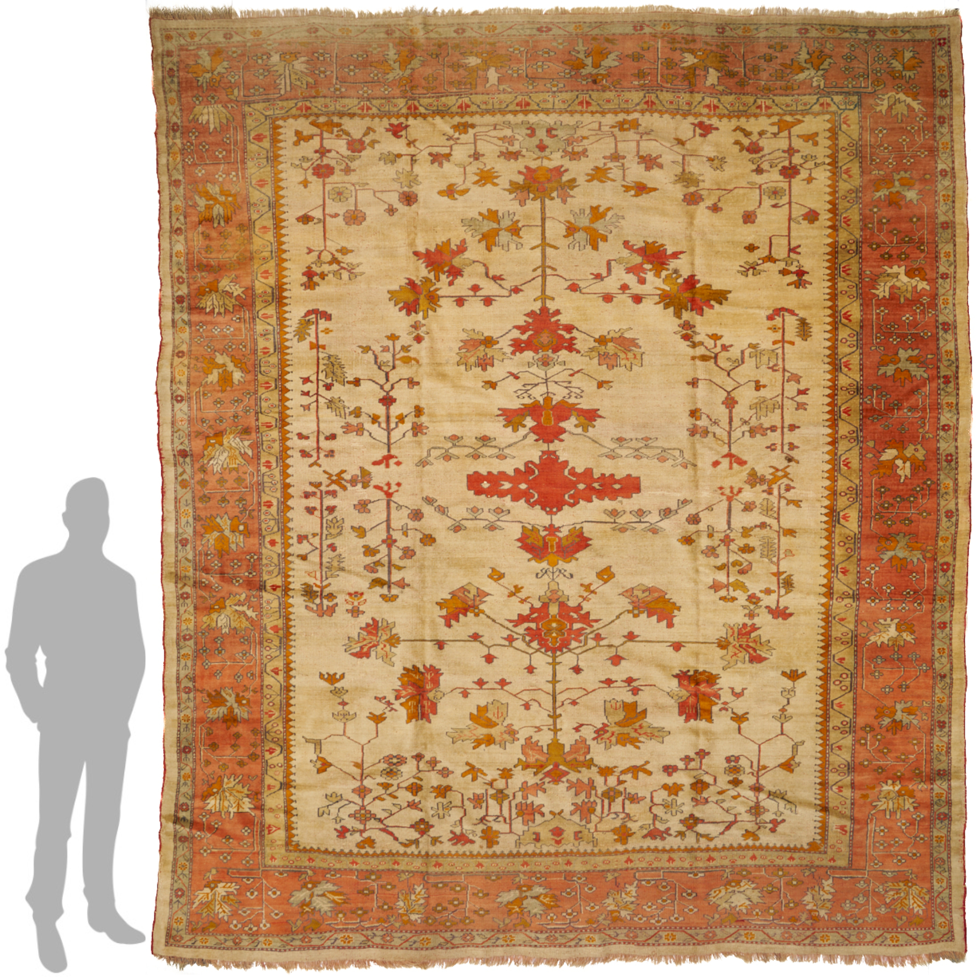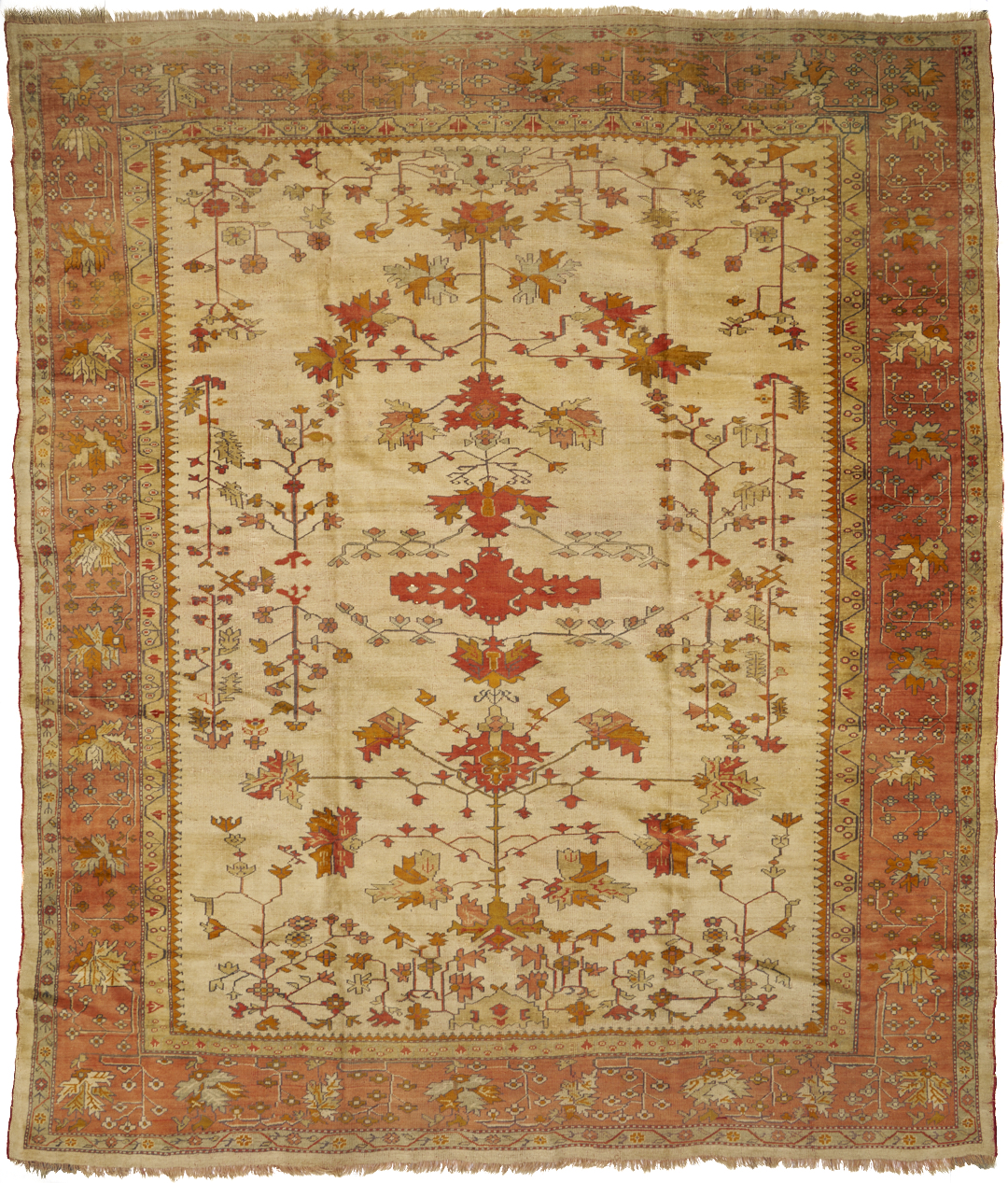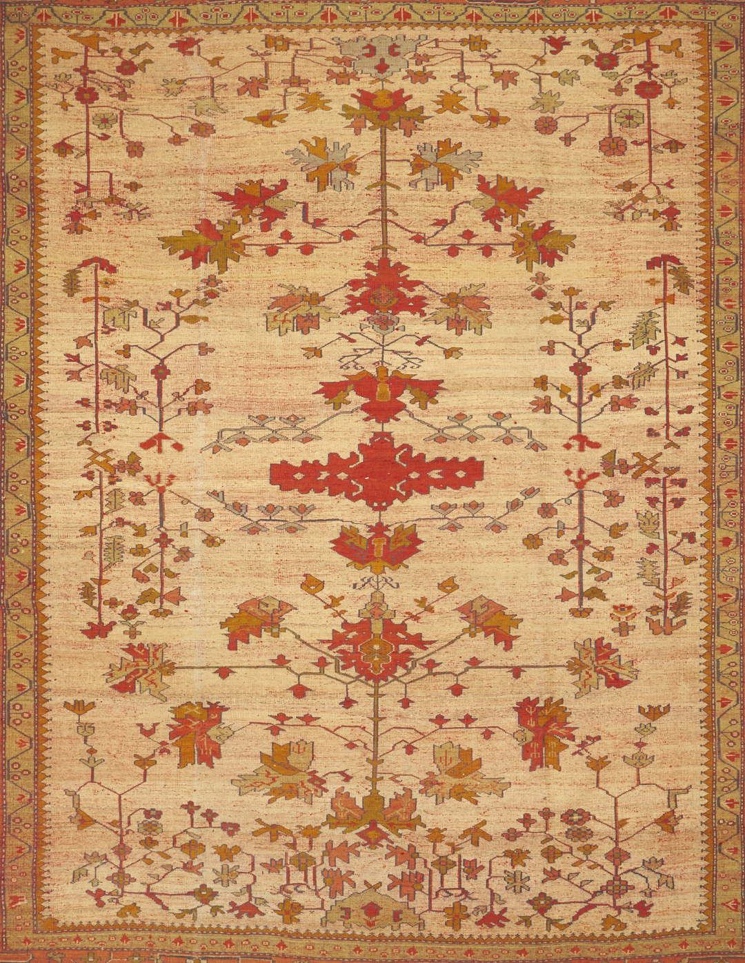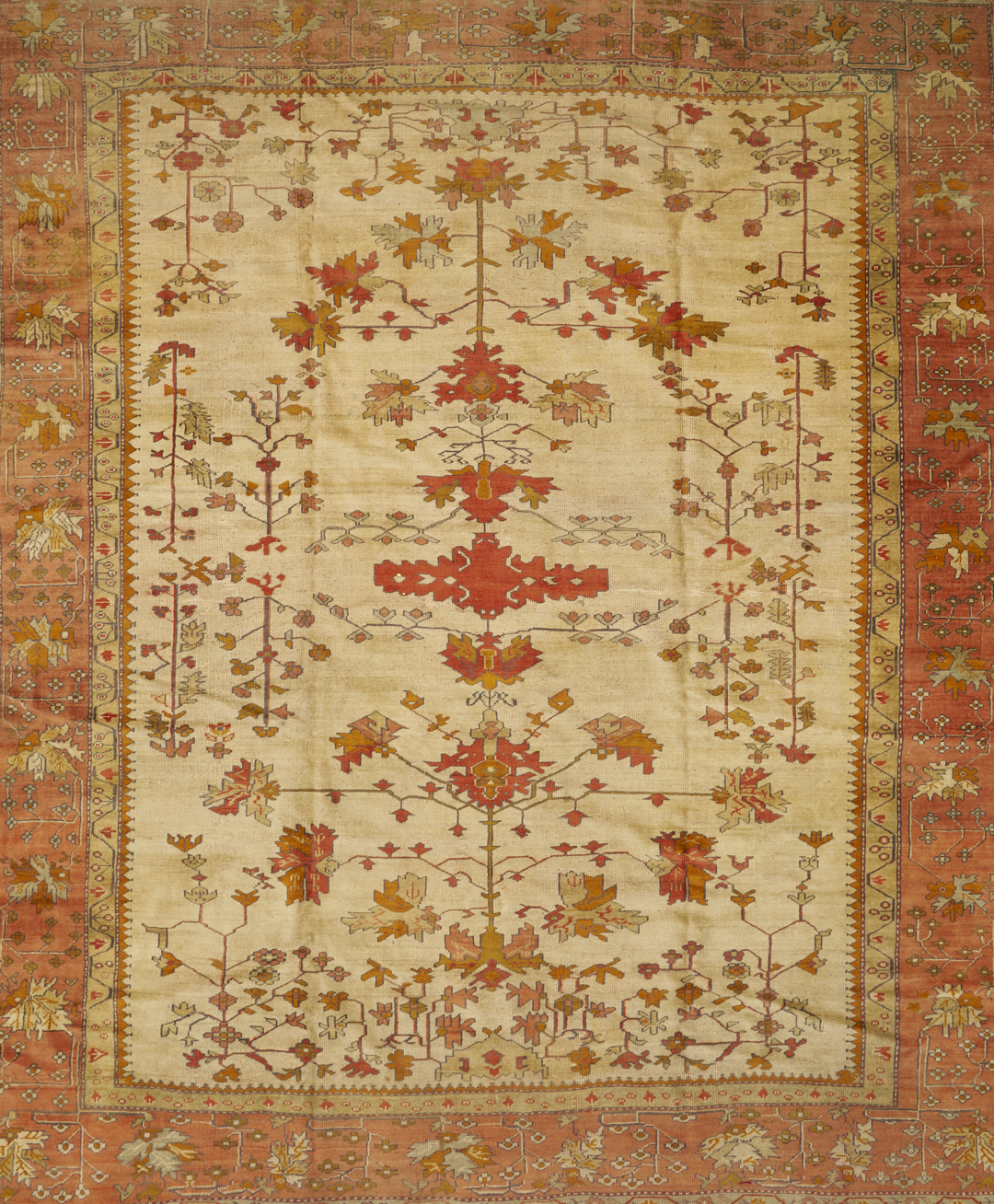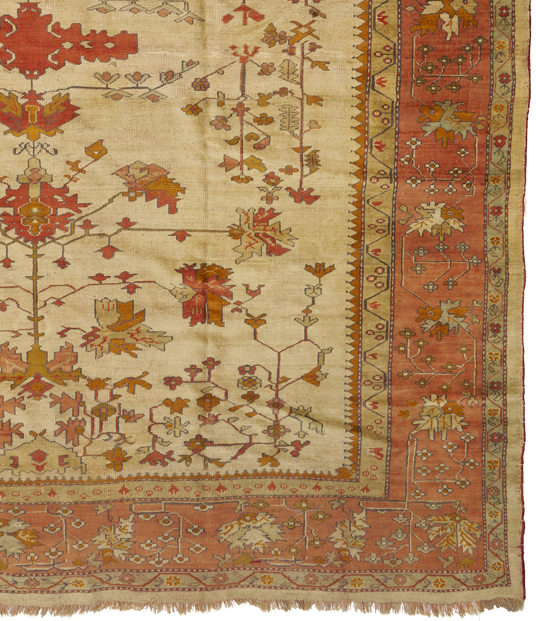 Turkish Oushak carpet, wool on wool. Overall central ivory field, the center with stylized foliate designs and three primary borders, including one wide border with stylized foliate designs. Woven in ivory, red, salmon, pale green, pale blue, and gold colors, 10 ft. 4 in. x 12 ft. 1 in. Early 20th century.