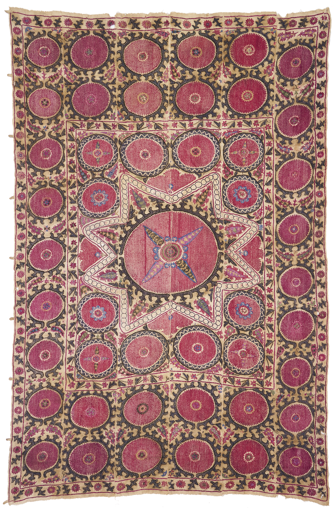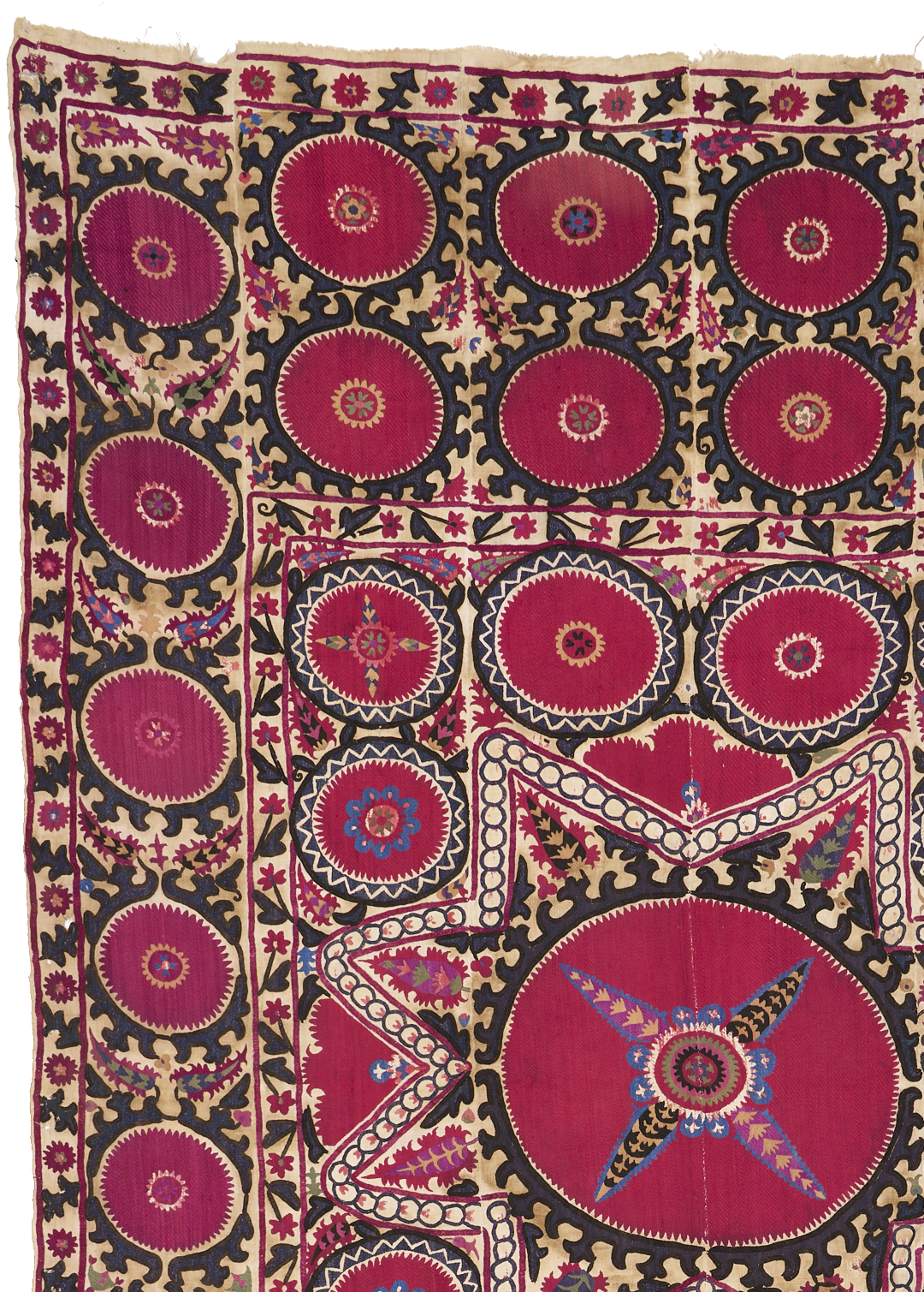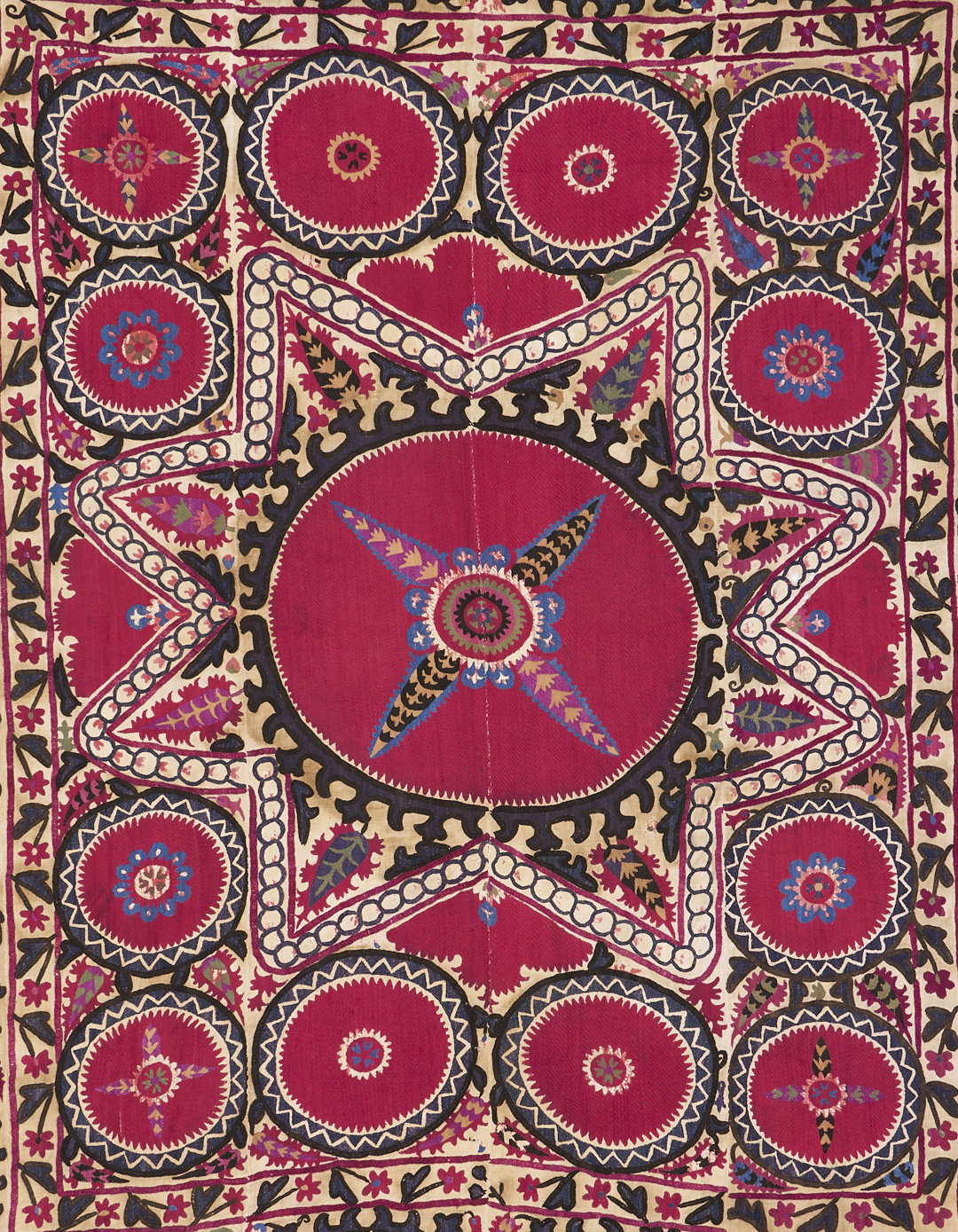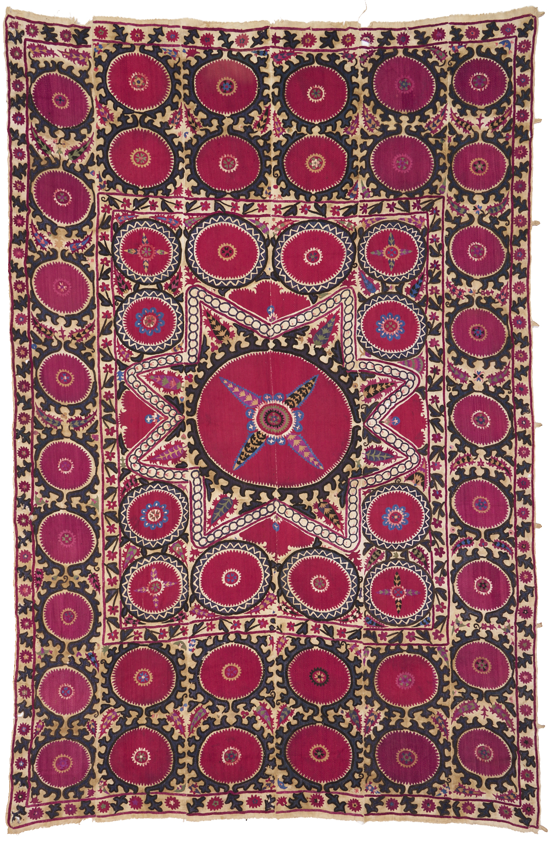 Uzbekistan Suzani hand-embroidered textile, central medallion surrounded by a field of poppies interspersed with scrolling foliate designs. Wrought in bright colors of pink, blue, green, black, and gold, all on a cream cotton foundation. 7 ft. x 10 ft. 7 in. 19th century.