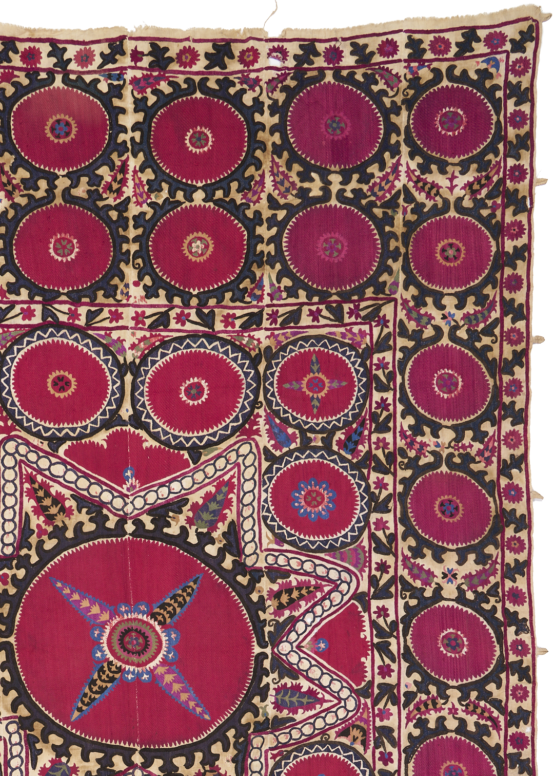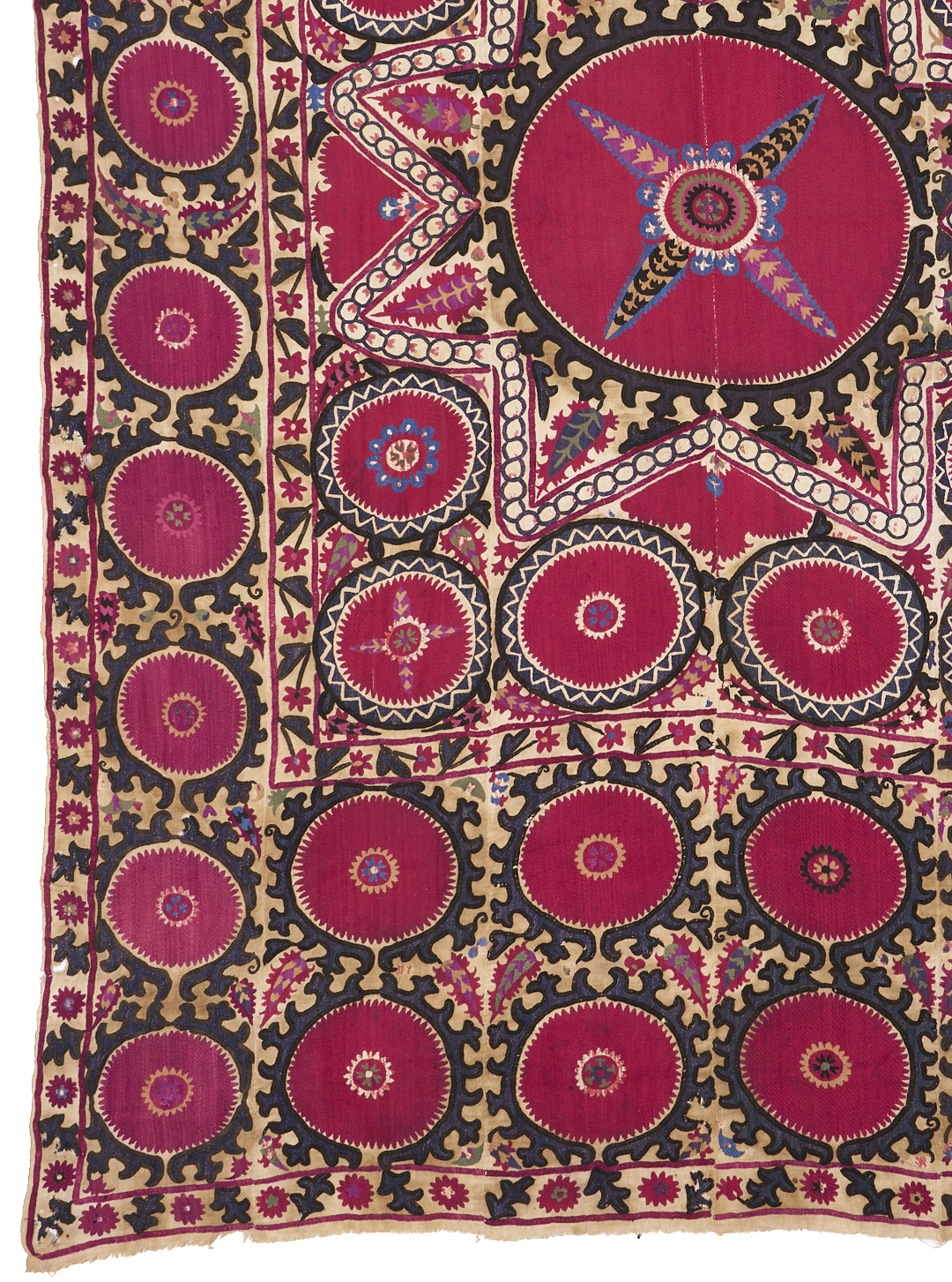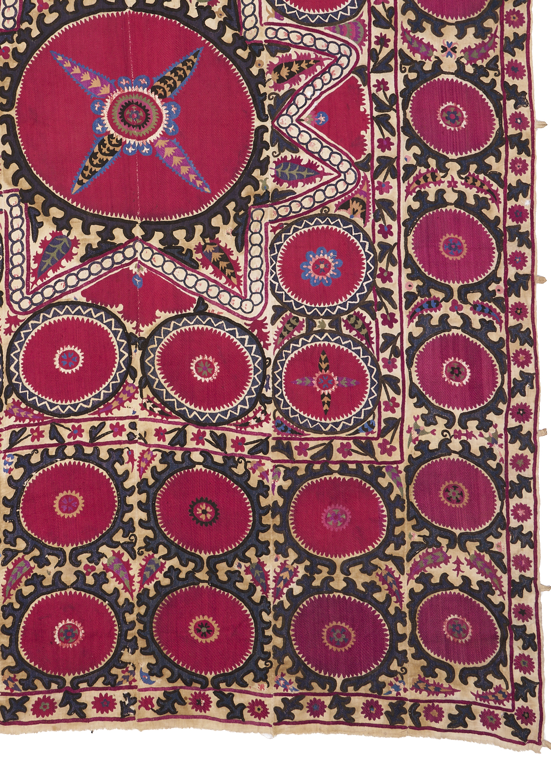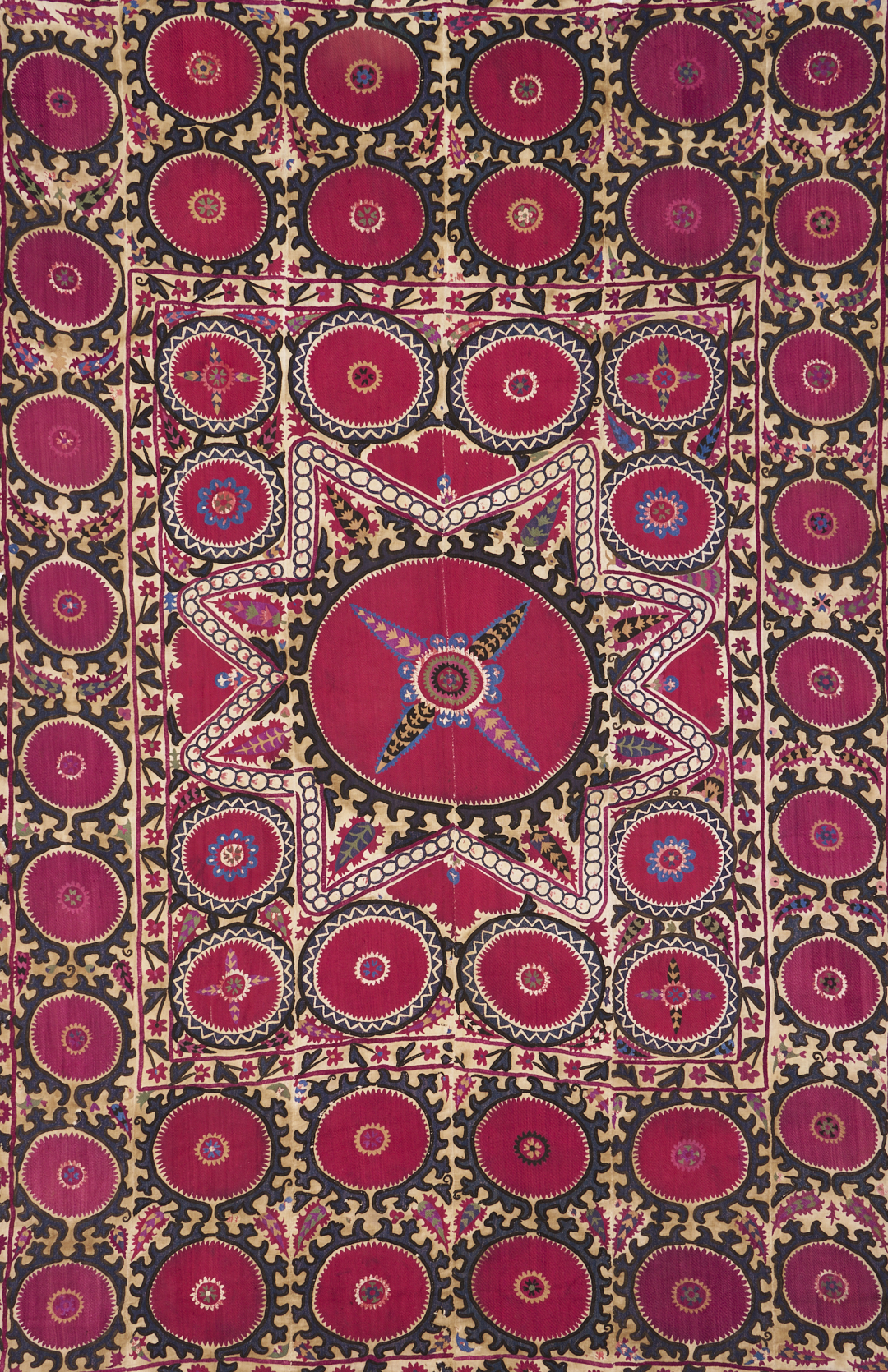Uzbekistan Suzani hand-embroidered textile, central medallion surrounded by a field of poppies interspersed with scrolling foliate designs. Wrought in bright colors of pink, blue, green, black, and gold, all on a cream cotton foundation. 7 ft. x 10 ft. 7 in. 19th century.