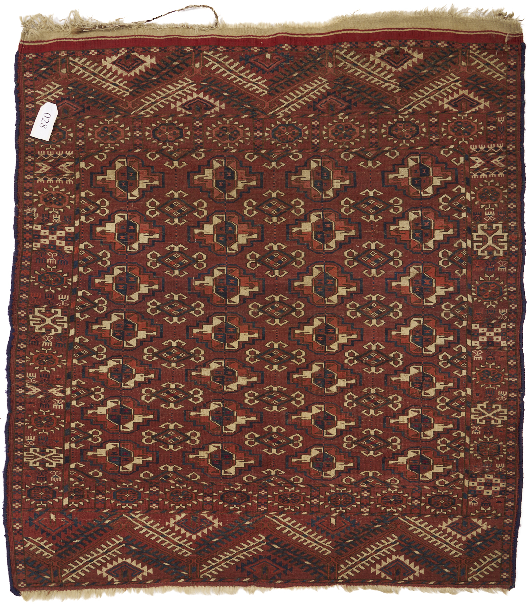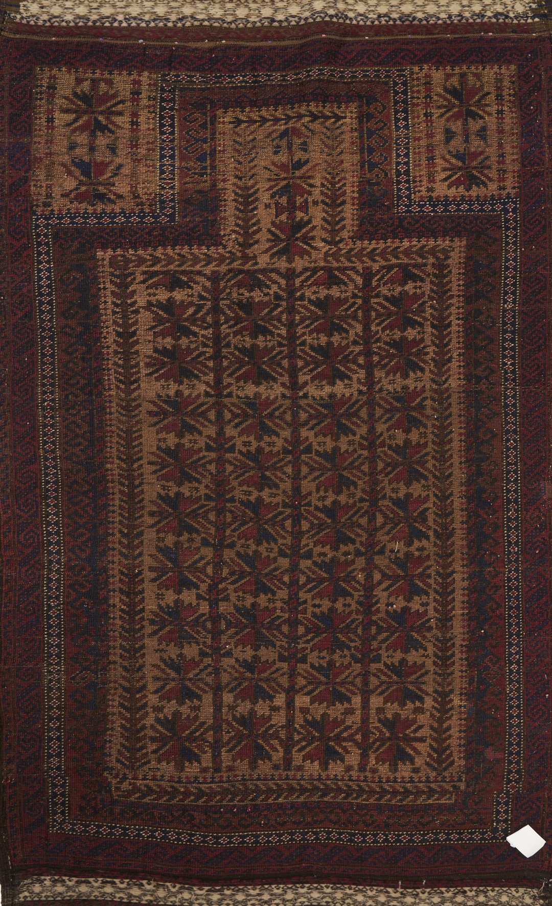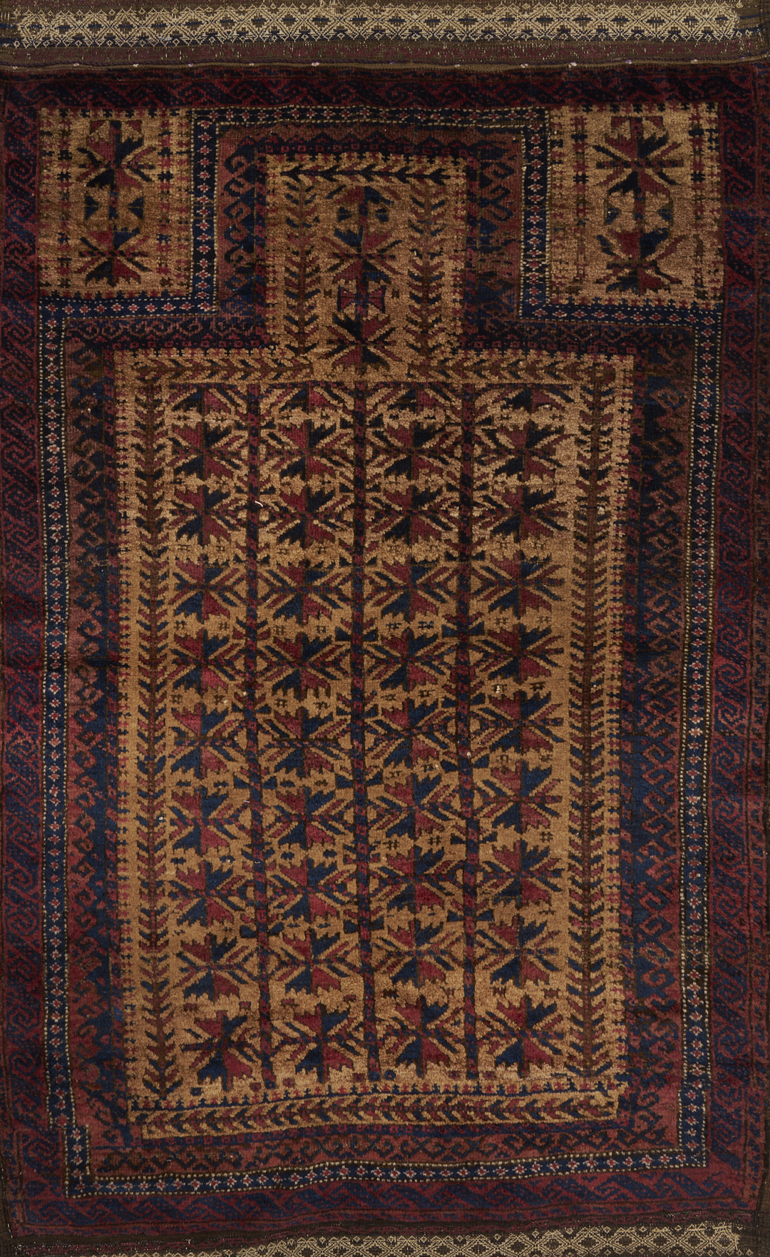 1st item: Antique Tekke Turkman floor rug, wool on wool, central rust field with four rows of seven guls each, with two elem panels at each end with stylized feather and diamond designs. Woven in red, blue, and cream colors. 3 ft. 6 in. x 3 ft. 2 in. Circa 1890s. 2nd item: Antique Baluch Afghan tribal prayer rug, wool on wool, with geometric and foliate-decorated cream ground mihrab within multiple traditional design borders. Woven in rust, blue, brown, and cream colors. 4 ft. 6 in. x 2 ft. 10 in. Circa 1875.