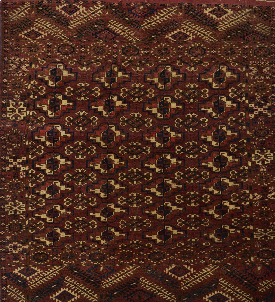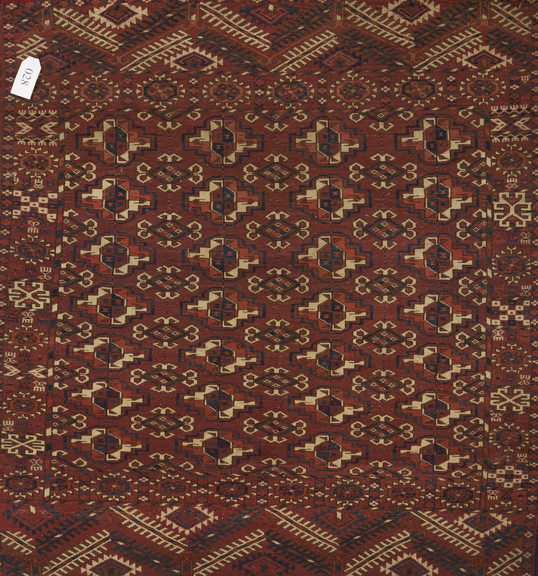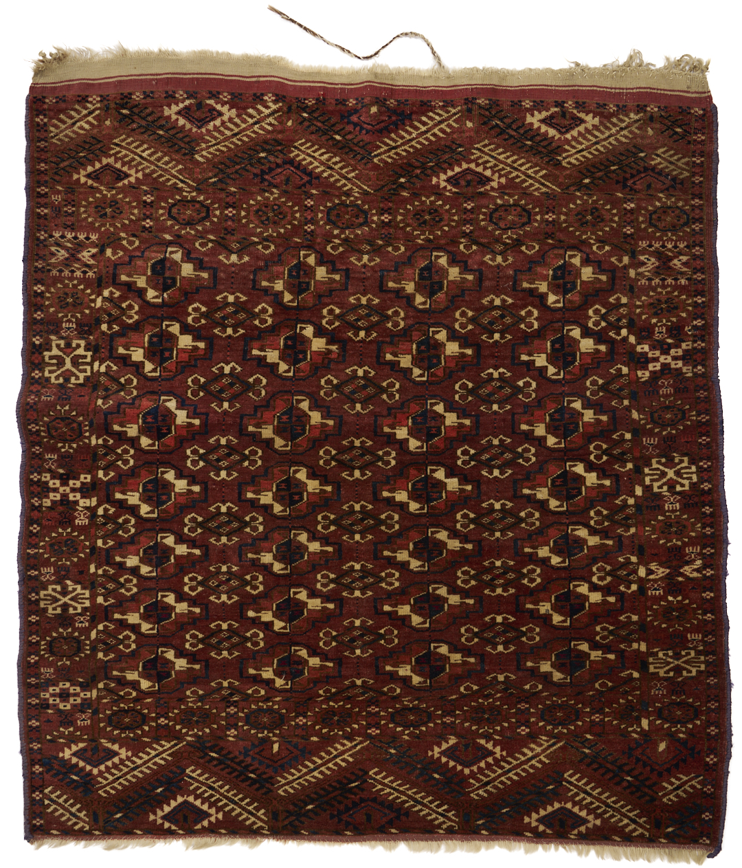 1st item: Antique Tekke Turkman floor rug, wool on wool, central rust field with four rows of seven guls each, with two elem panels at each end with stylized feather and diamond designs. Woven in red, blue, and cream colors. 3 ft. 6 in. x 3 ft. 2 in. Circa 1890s. 2nd item: Antique Baluch Afghan tribal prayer rug, wool on wool, with geometric and foliate-decorated cream ground mihrab within multiple traditional design borders. Woven in rust, blue, brown, and cream colors. 4 ft. 6 in. x 2 ft. 10 in. Circa 1875.