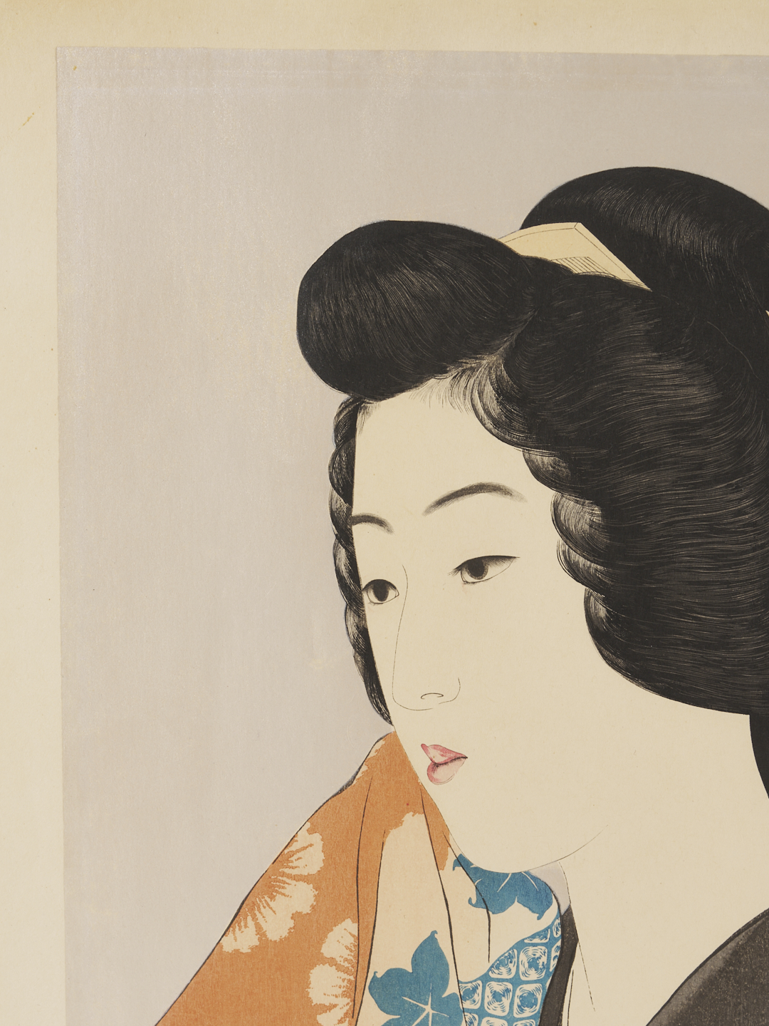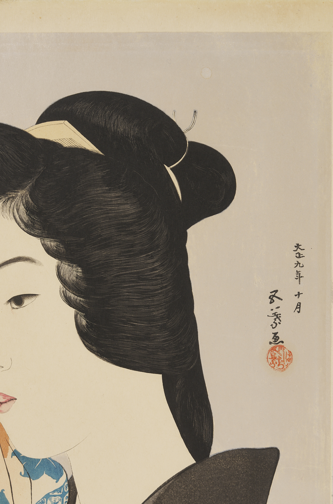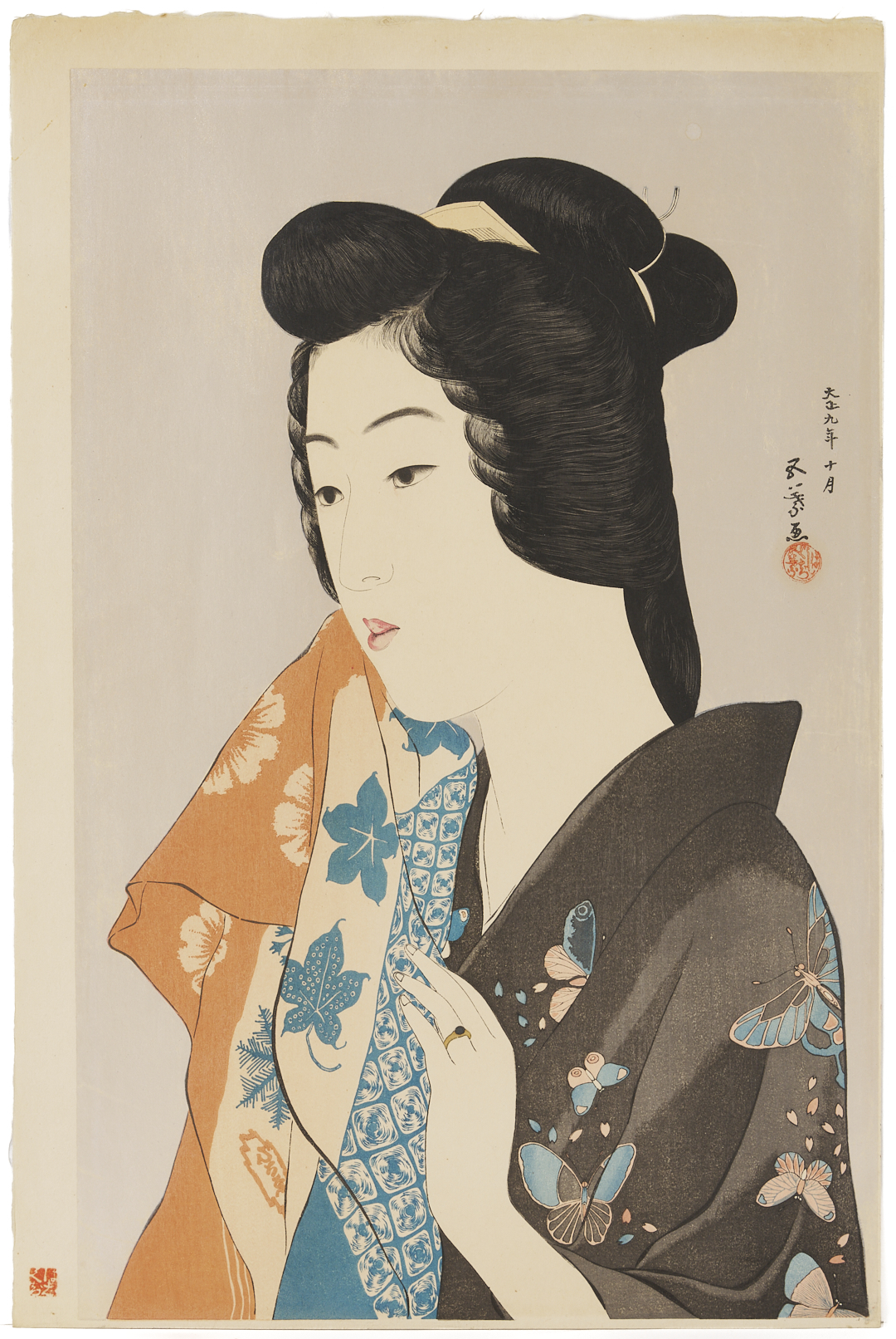 Hashiguchi Goyo (Japan, 1881-1921) shin-hanga bijinga woodblock print in colors with silver mica and metallic ink embellishment to robe and ring. The Shinbashi geisha Hisae, shown in bust-length, wears a black kimono with butterfly decoration and holds a floral and leaf print towel to her cheek. Signed and dated October 1920 in the block, upper right, with artist’s seal. Hashiguchi family seal to lower left margin. Posthumously published by the artist’s nephew Hashiguchi Yasuo, c. 1950. Unframed. 18 in. H x 12 in. W. Biographical note: “…In 1911 [Goyo] became interested in “Ukiyo-e” prints after winning a poster competition with a study of a beautiful woman, and began to publish articles and studies on early artists of that school. As a consequence of these activities he met the publisher Watanabe Shozaburo, for whom he designed a print (“Bath,” 1915) which was virtually the first of the “Shin Hanga” movement, but wishing to have complete control over all the processes, he published his subsequent prints himself… A small group of print designs unfinished at his early death were later published by his family.” (Source: British Museum)