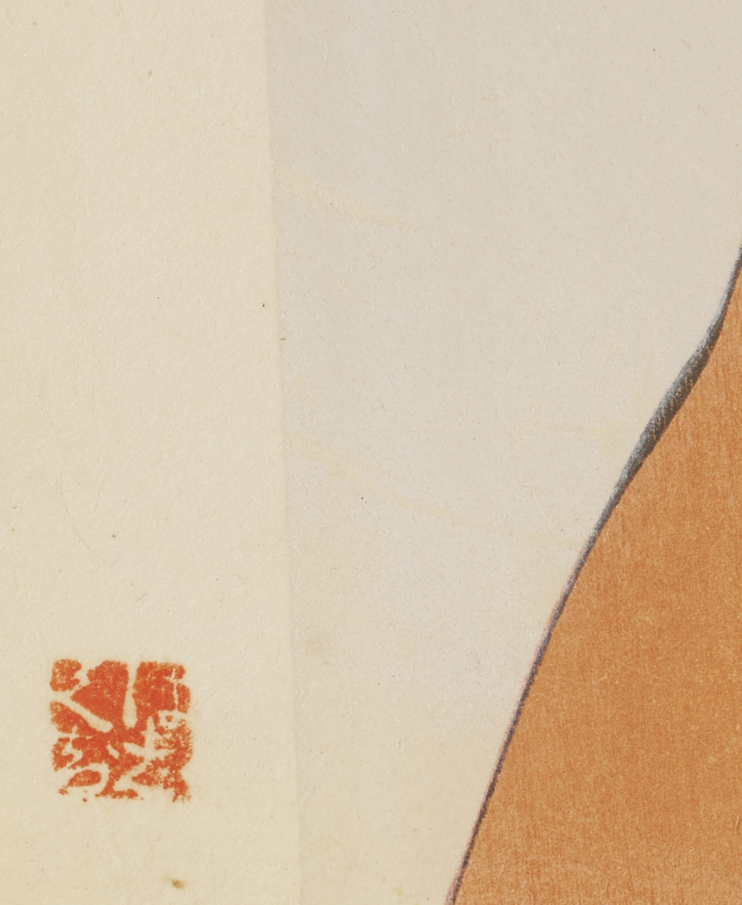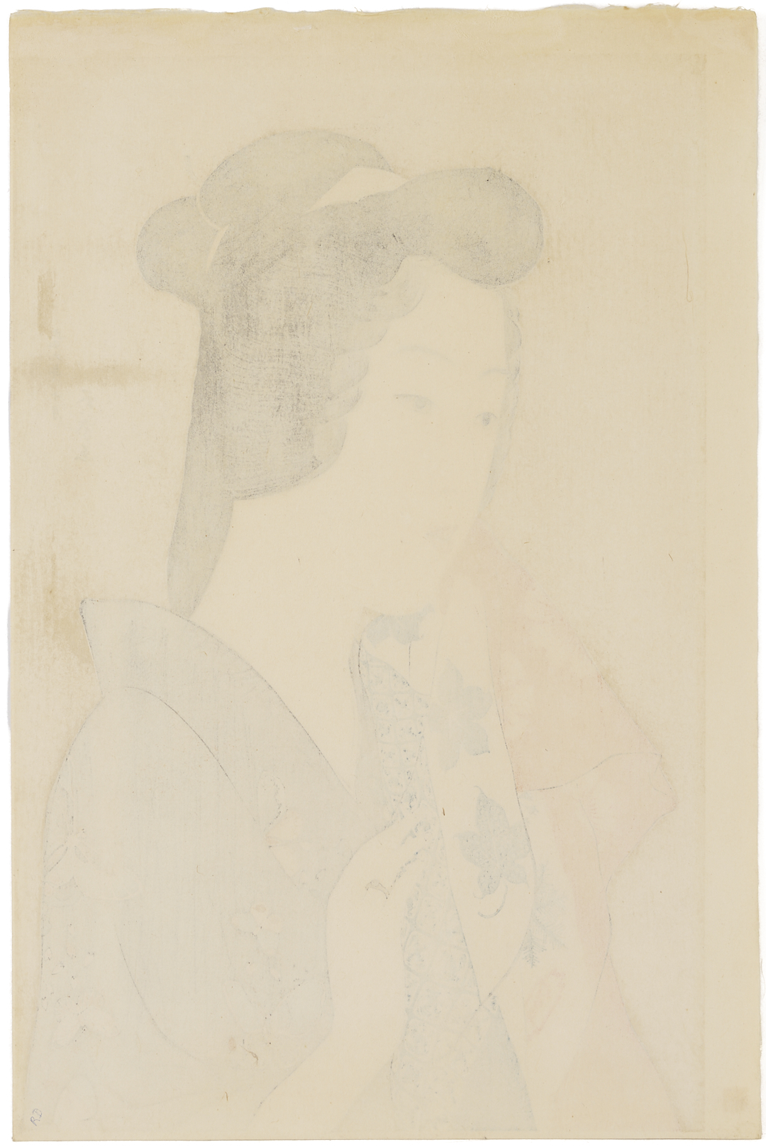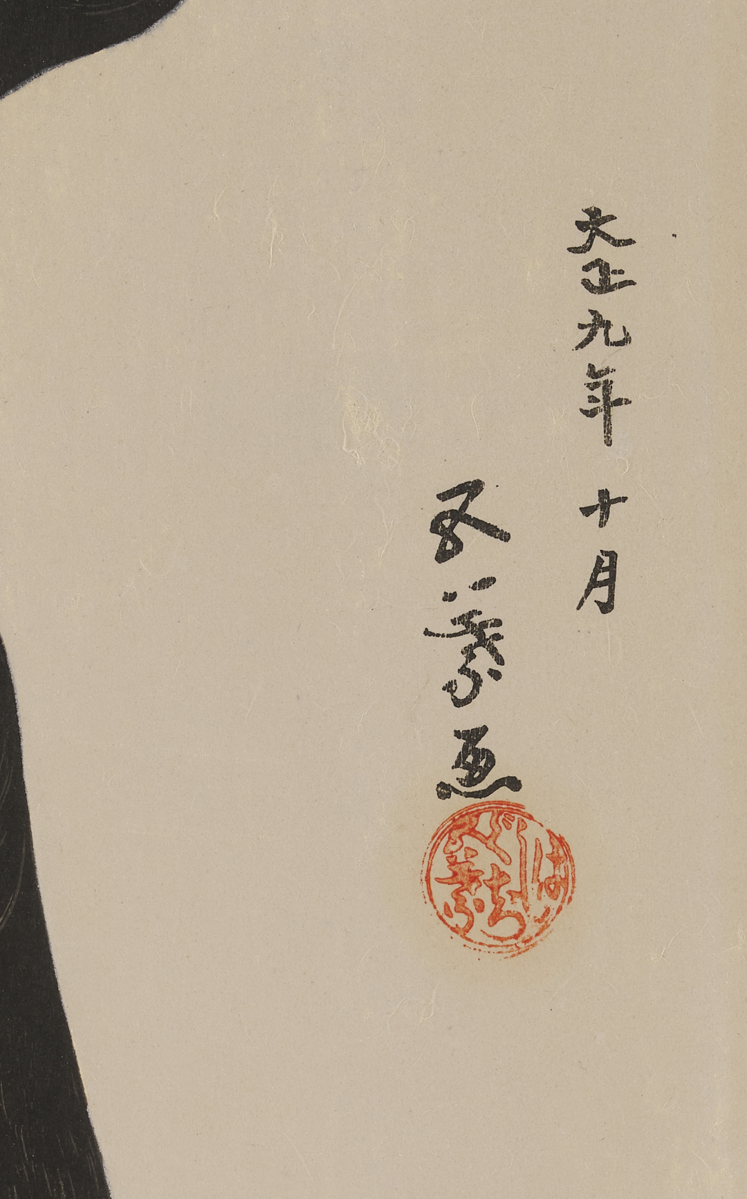 Hashiguchi Goyo (Japan, 1881-1921) shin-hanga bijinga woodblock print in colors with silver mica and metallic ink embellishment to robe and ring. The Shinbashi geisha Hisae, shown in bust-length, wears a black kimono with butterfly decoration and holds a floral and leaf print towel to her cheek. Signed and dated October 1920 in the block, upper right, with artist’s seal. Hashiguchi family seal to lower left margin. Posthumously published by the artist’s nephew Hashiguchi Yasuo, c. 1950. Unframed. 18 in. H x 12 in. W. Biographical note: “…In 1911 [Goyo] became interested in “Ukiyo-e” prints after winning a poster competition with a study of a beautiful woman, and began to publish articles and studies on early artists of that school. As a consequence of these activities he met the publisher Watanabe Shozaburo, for whom he designed a print (“Bath,” 1915) which was virtually the first of the “Shin Hanga” movement, but wishing to have complete control over all the processes, he published his subsequent prints himself… A small group of print designs unfinished at his early death were later published by his family.” (Source: British Museum)