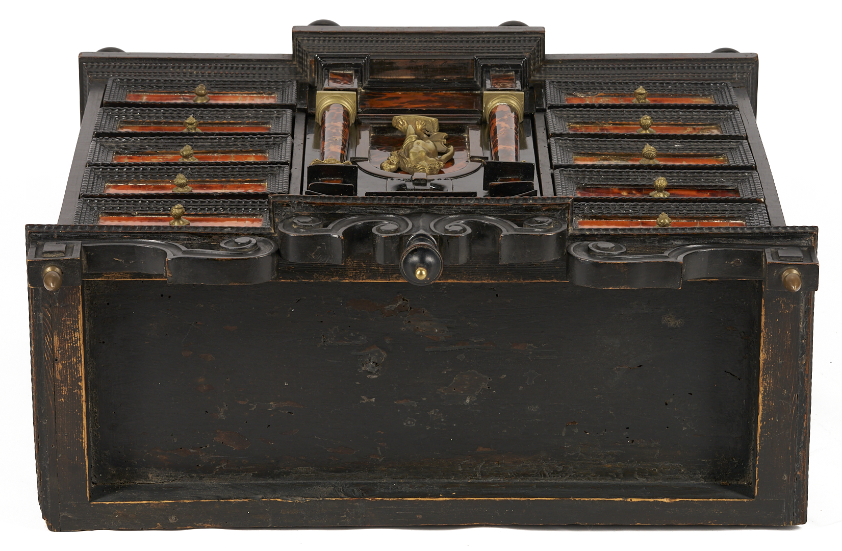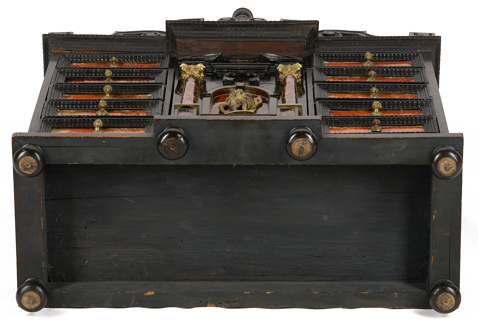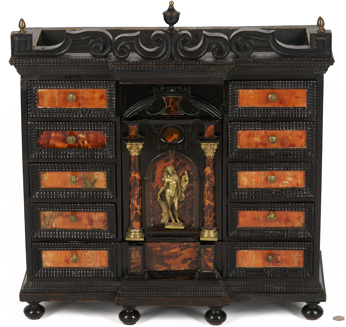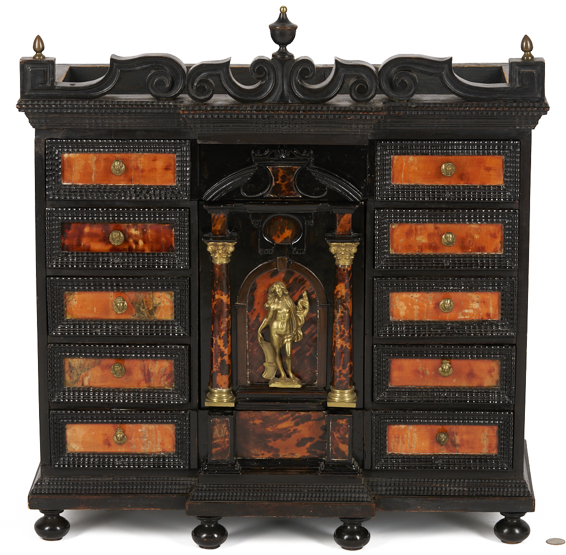 Baroque style faux tortoise shell veneered and bronze mounted ebonized bargueno or collector’s cabinet. The top features a carved openwork pediment topped by urn and teardrop finials, over a ripple-carved cornice with projecting center section. Long top and bottom drawers with ripple molded edges and faux molded fronts, simulating the top and base of a central arched portico, enshrining a gilt bronze goddess figure flanked by two tortoise veneered columns. The portico section pulls out to reveal a deep prospect drawer with hidden compartment in the lower section. The center section is flanked by three short drawers on each side. All drawers are dovetailed, veneered in tortoiseshell and edged in ripple moldings, with ormolu figural heads for knobs. The cabinet has plain ebonized sides and is supported on a molded base atop ball feet. Pine secondary wood. 26 3/4 in. H x 25 in. W x 11 1/4 in. D. Spanish/Iberian or Italian, 19th century.