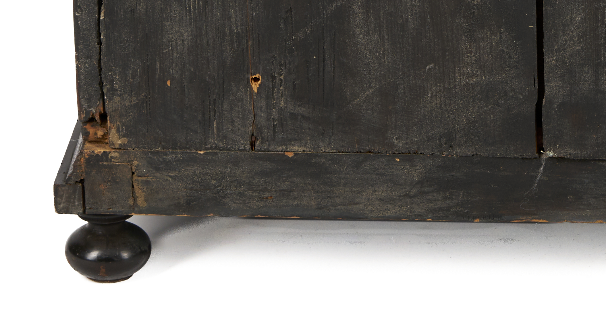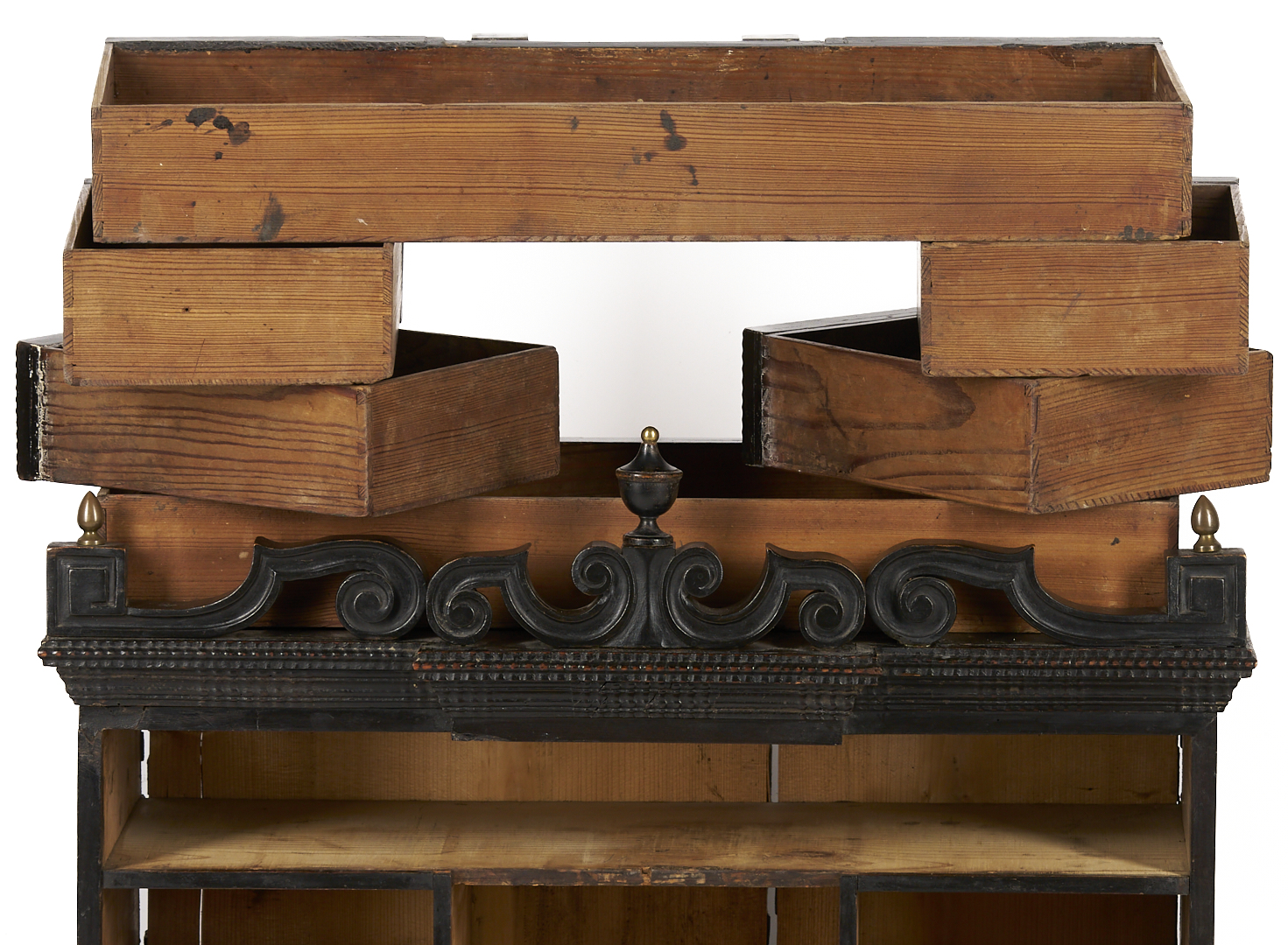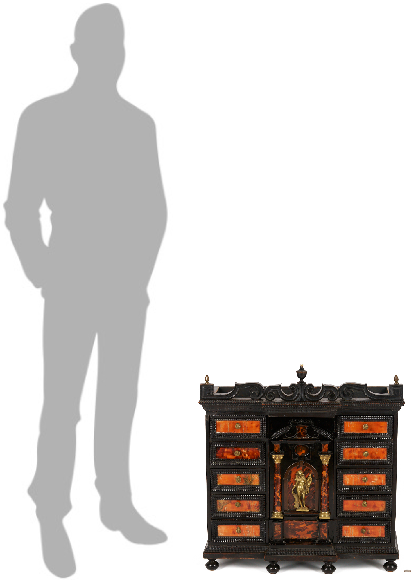 Baroque style faux tortoise shell veneered and bronze mounted ebonized bargueno or collector’s cabinet. The top features a carved openwork pediment topped by urn and teardrop finials, over a ripple-carved cornice with projecting center section. Long top and bottom drawers with ripple molded edges and faux molded fronts, simulating the top and base of a central arched portico, enshrining a gilt bronze goddess figure flanked by two tortoise veneered columns. The portico section pulls out to reveal a deep prospect drawer with hidden compartment in the lower section. The center section is flanked by three short drawers on each side. All drawers are dovetailed, veneered in tortoiseshell and edged in ripple moldings, with ormolu figural heads for knobs. The cabinet has plain ebonized sides and is supported on a molded base atop ball feet. Pine secondary wood. 26 3/4 in. H x 25 in. W x 11 1/4 in. D. Spanish/Iberian or Italian, 19th century.
