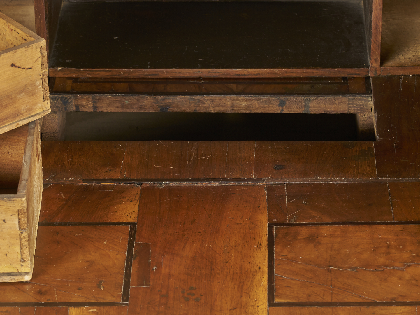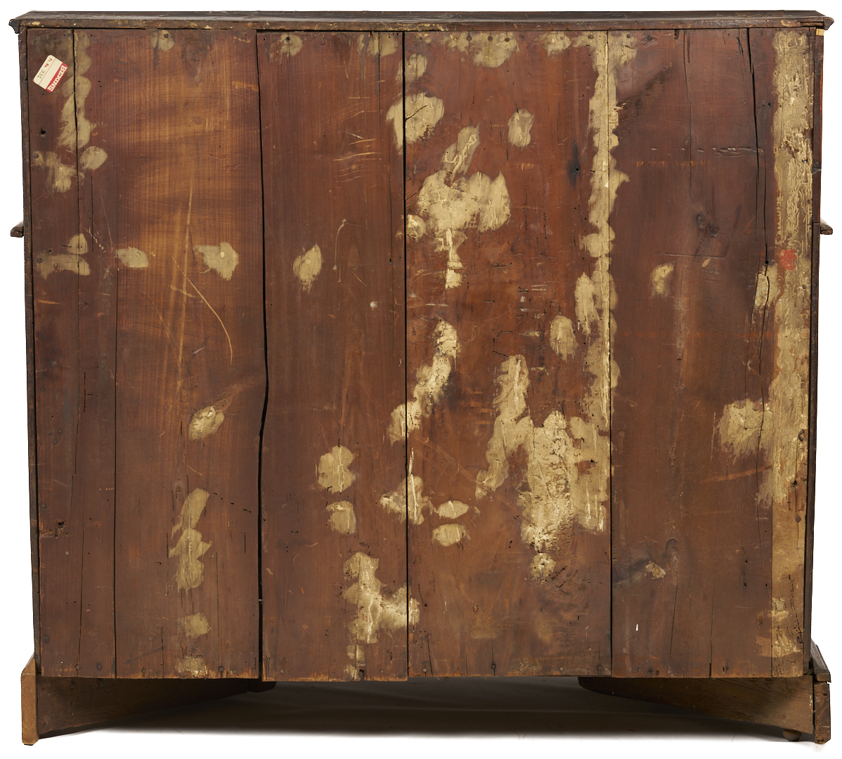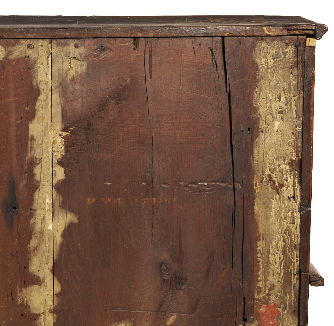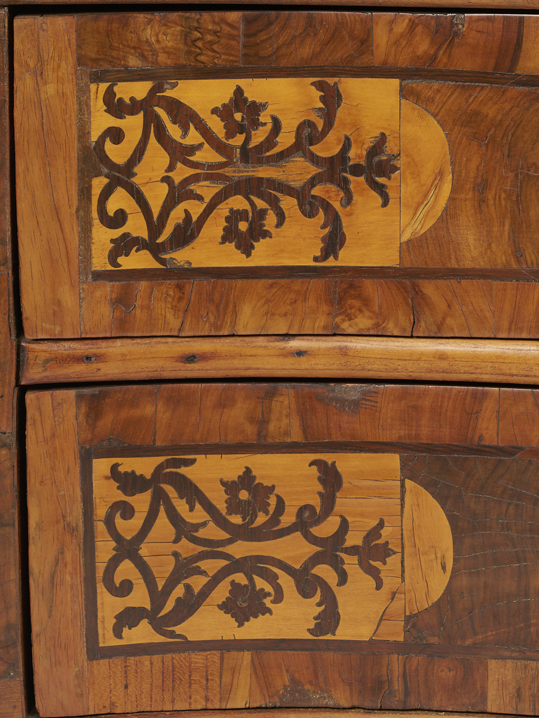 Scattered wood shrinkage to the surface with scattered losses and repairs to the veneer, especially around the lid edges, drawer edges, and escutcheons. Keys are not present. Two feet are fitted with later castors.