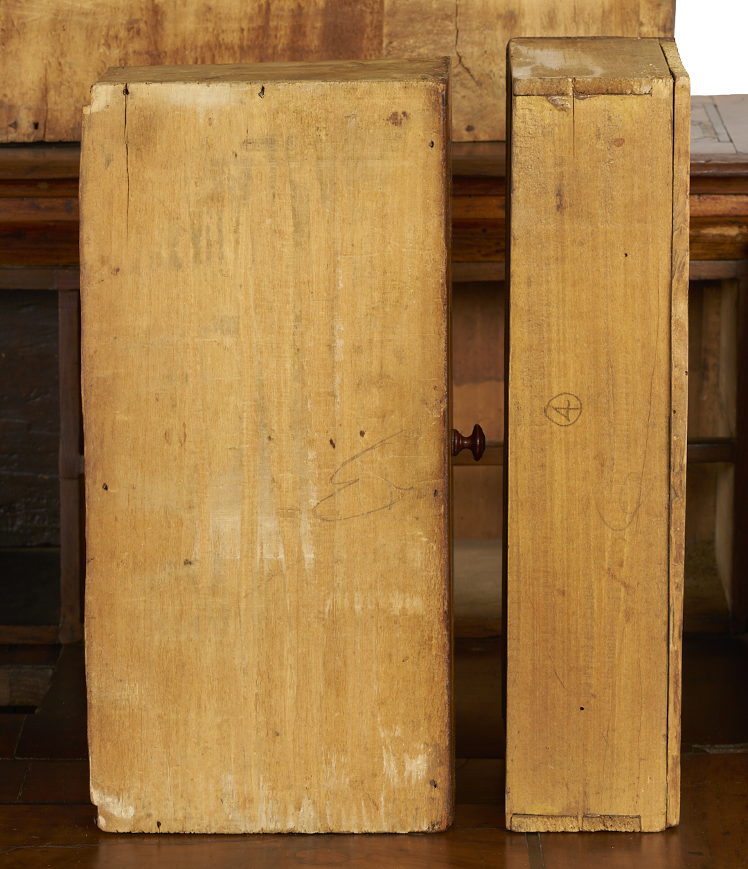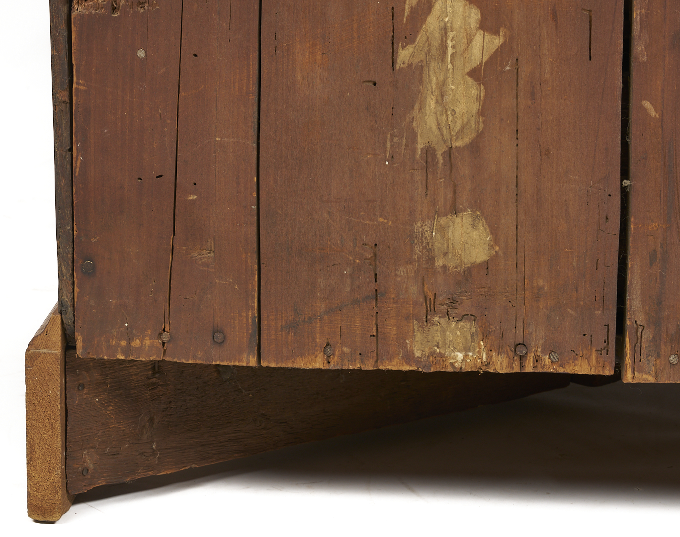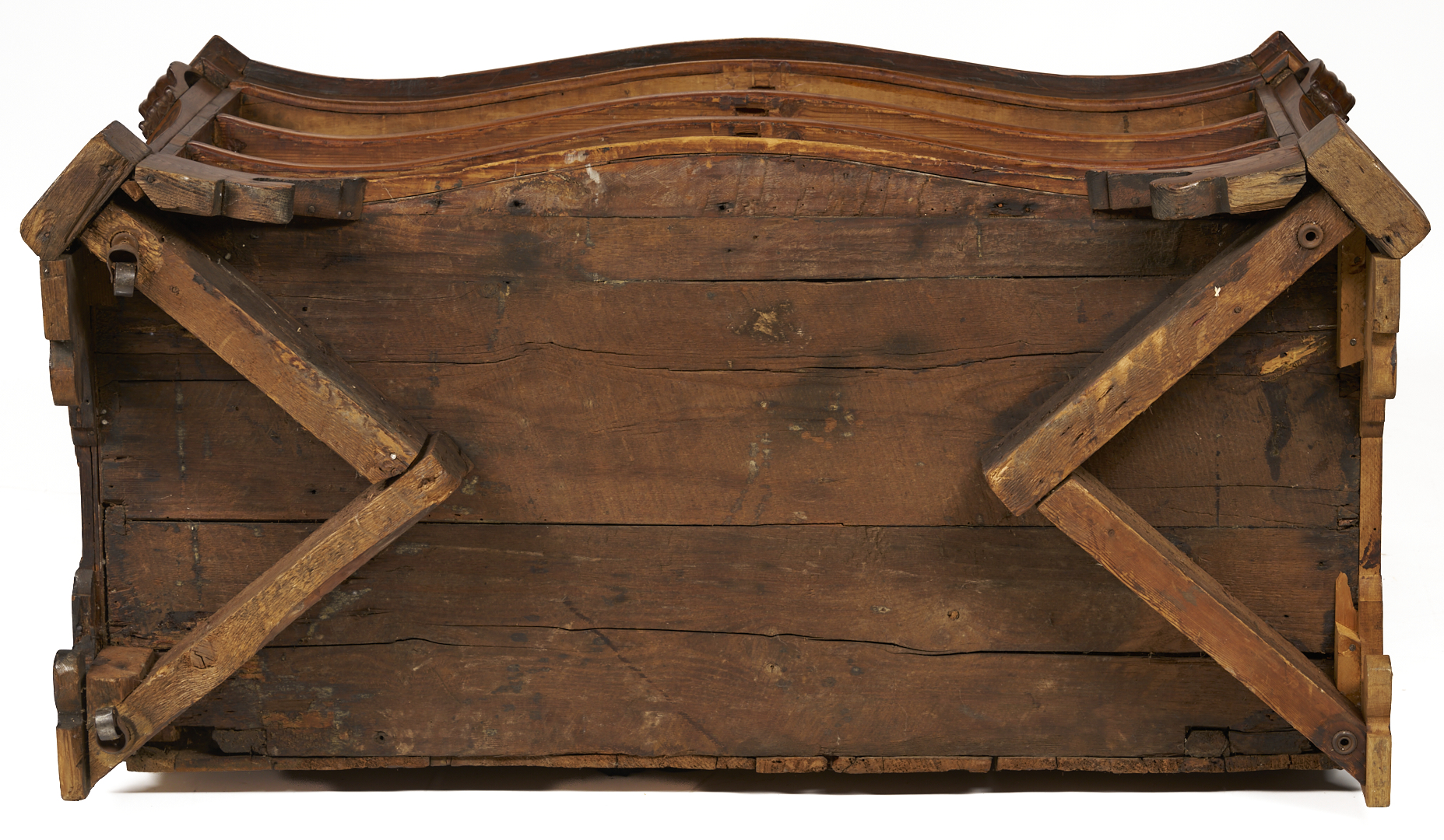 Scattered wood shrinkage to the surface with scattered losses and repairs to the veneer, especially around the lid edges, drawer edges, and escutcheons. Keys are not present. Two feet are fitted with later castors.
