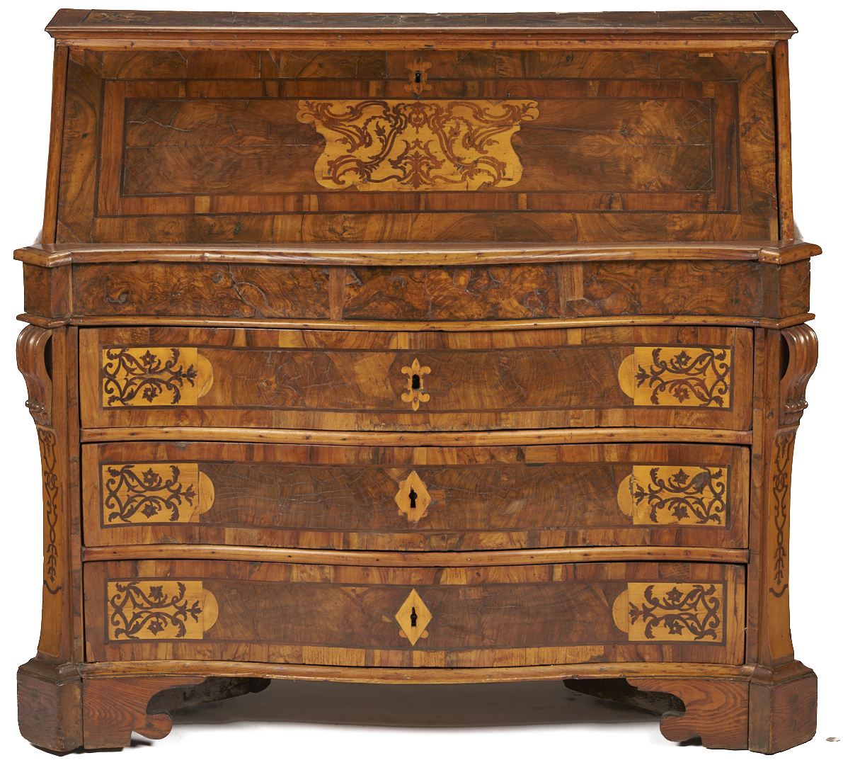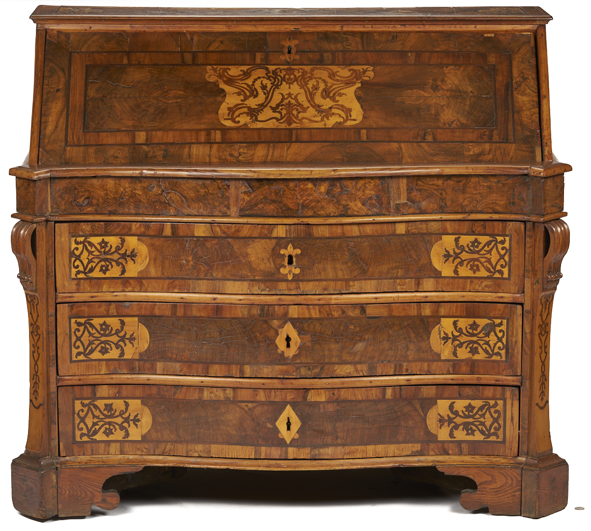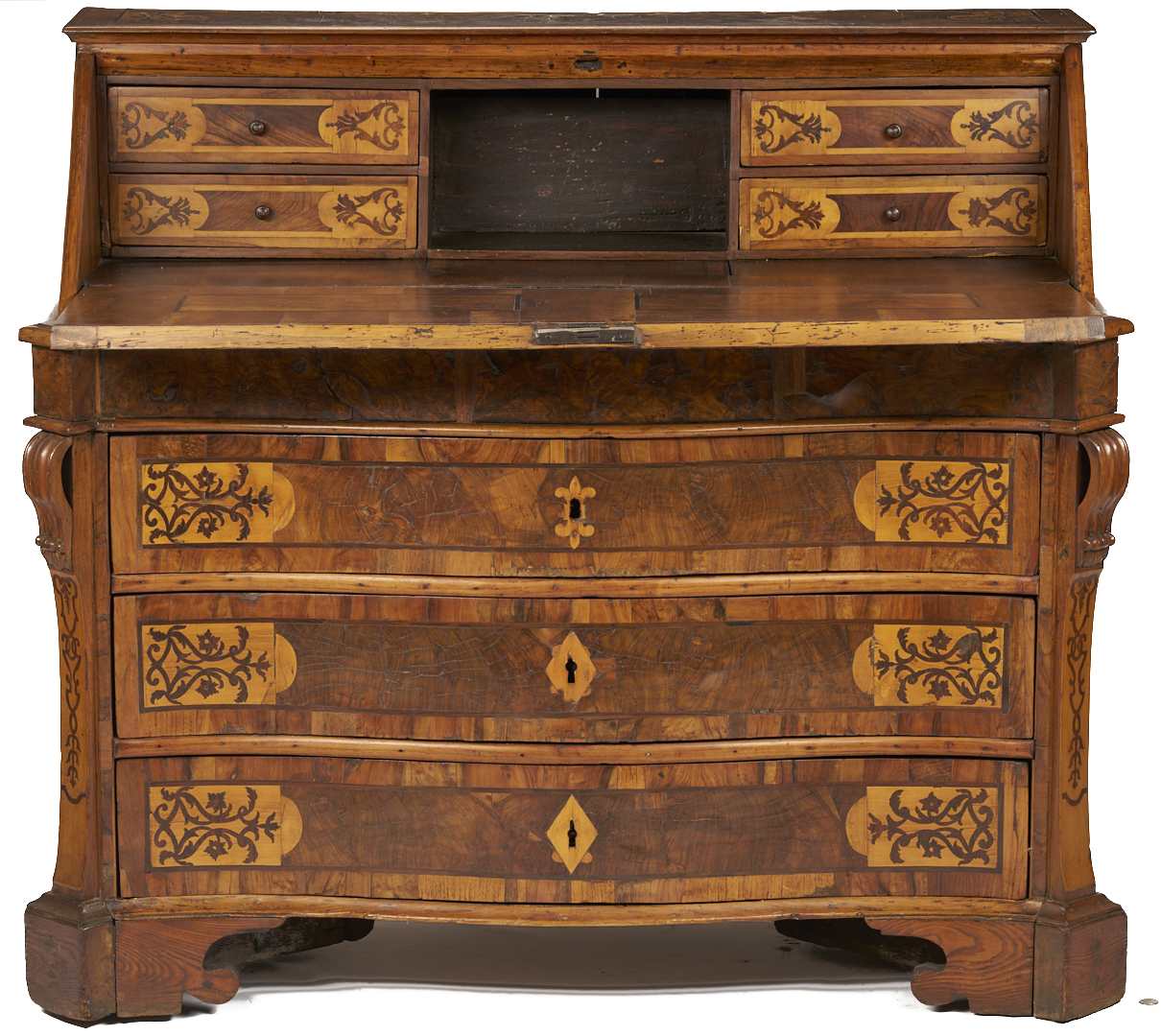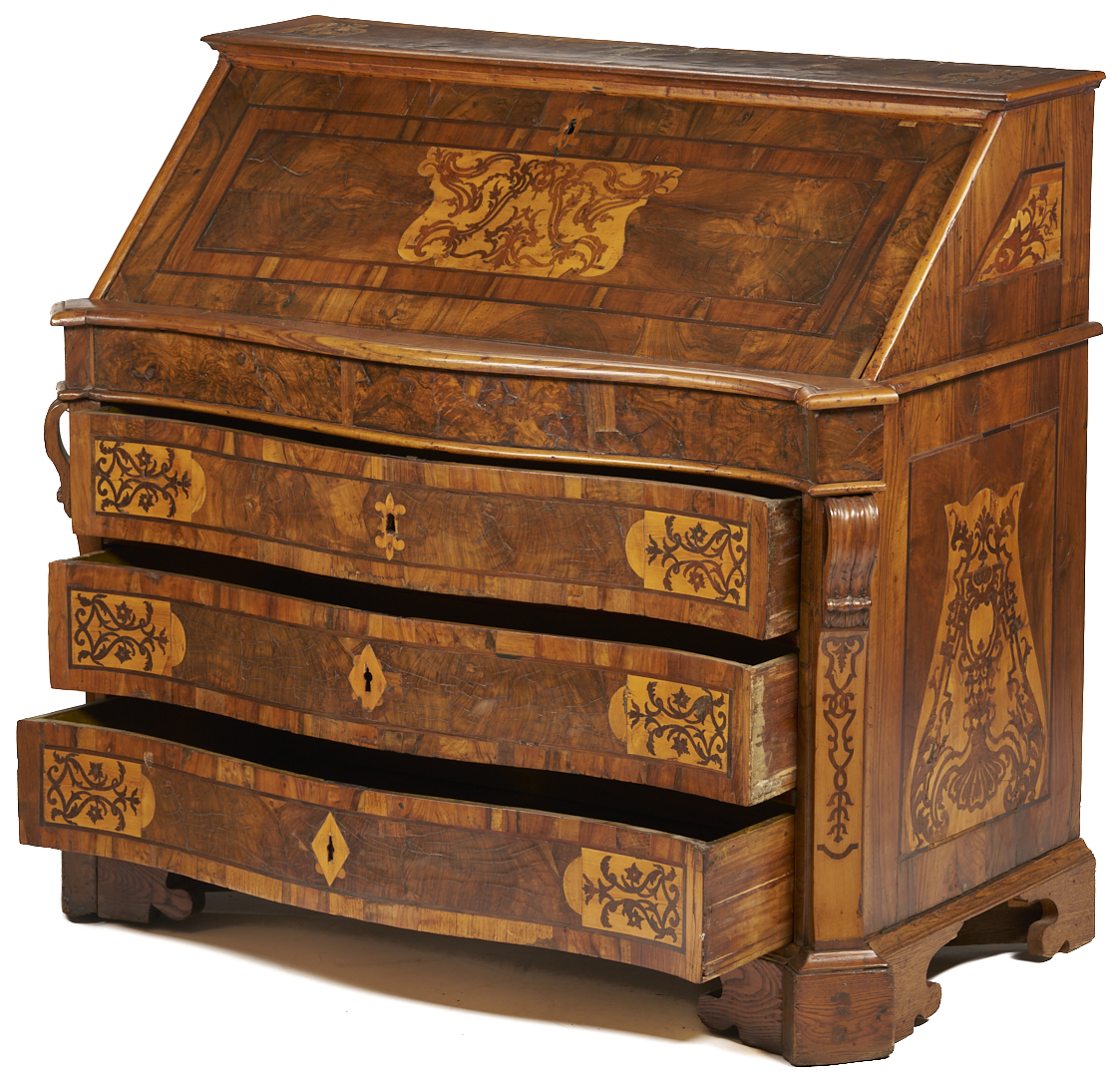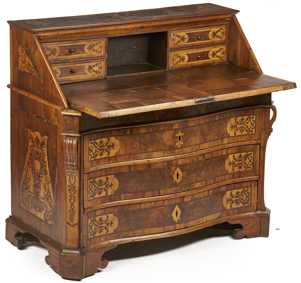 An Italian inlaid writing bureau or slant front desk, consisting of walnut and other European mixed woods, with scrolling foliate inlaid panels throughout the surface. The hinged lid opens to reveal a center well flanked by four inlaid drawers and one secret slide compartment, above three serpentine drawers flanked by canted, carved, and inlaid stiles, the whole resting on bracket feet. 45 3/4 in. H x 50 in. W x 25 in. D. Northern Italy/Lombardy region, late 18th century/early 19th century.
