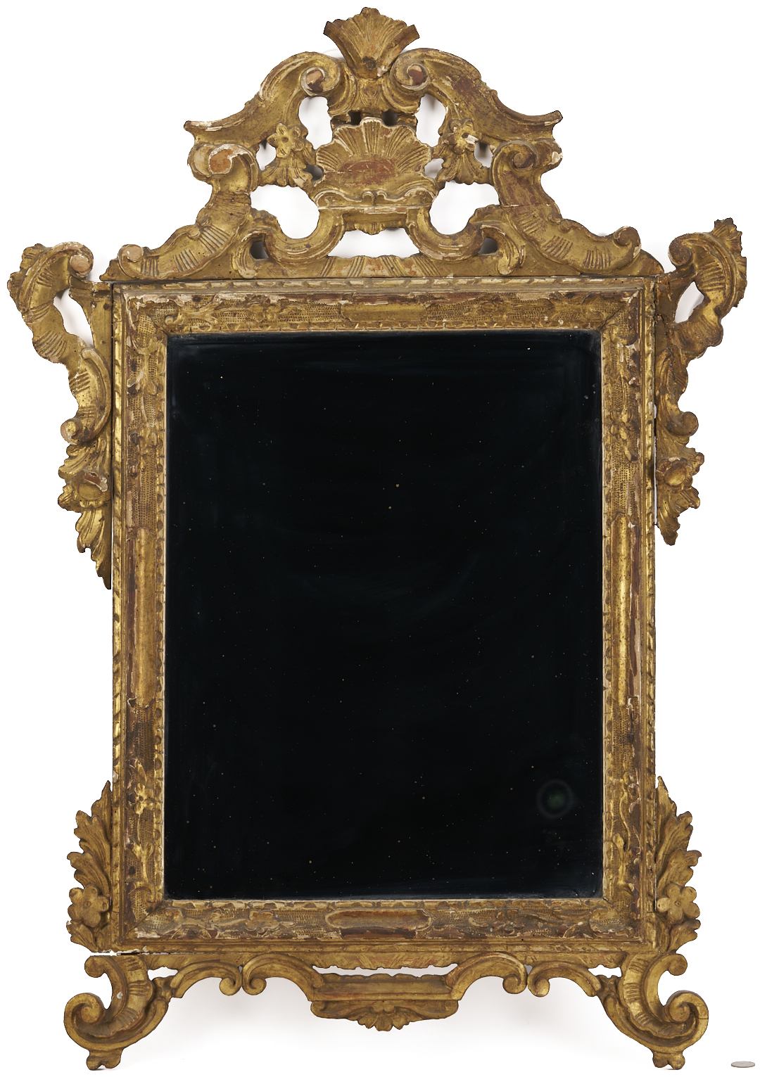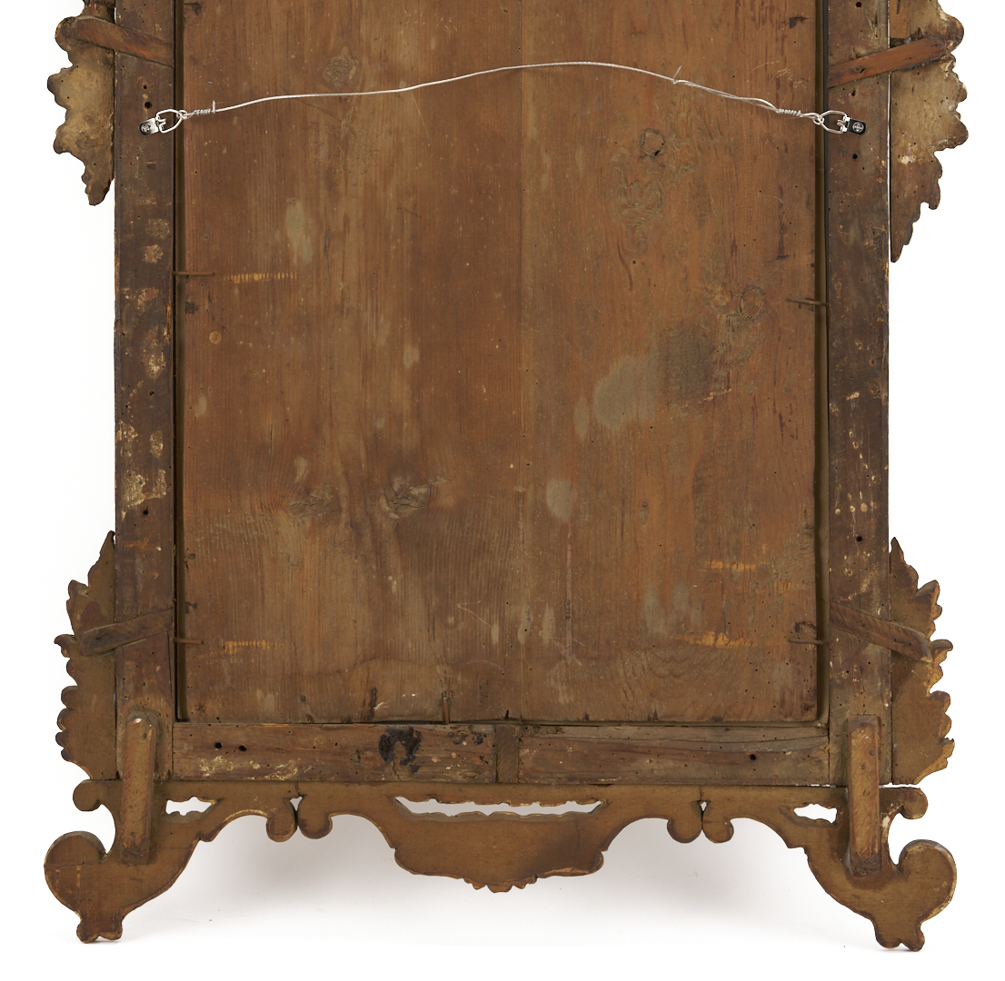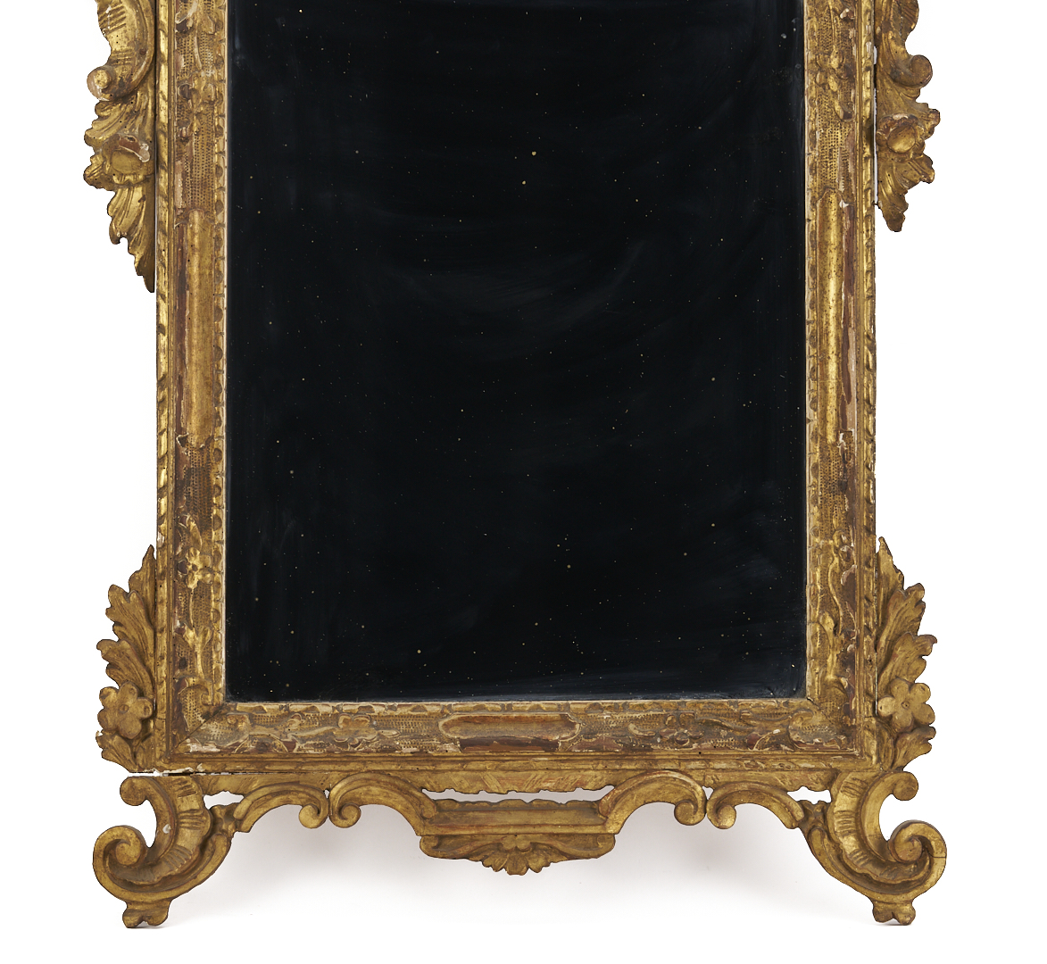 Mirror plate appears to be a modern replacement. Repaired breaks to both ears, lower corners, and other scattered areas; scattered areas of small losses to carving and gilding.