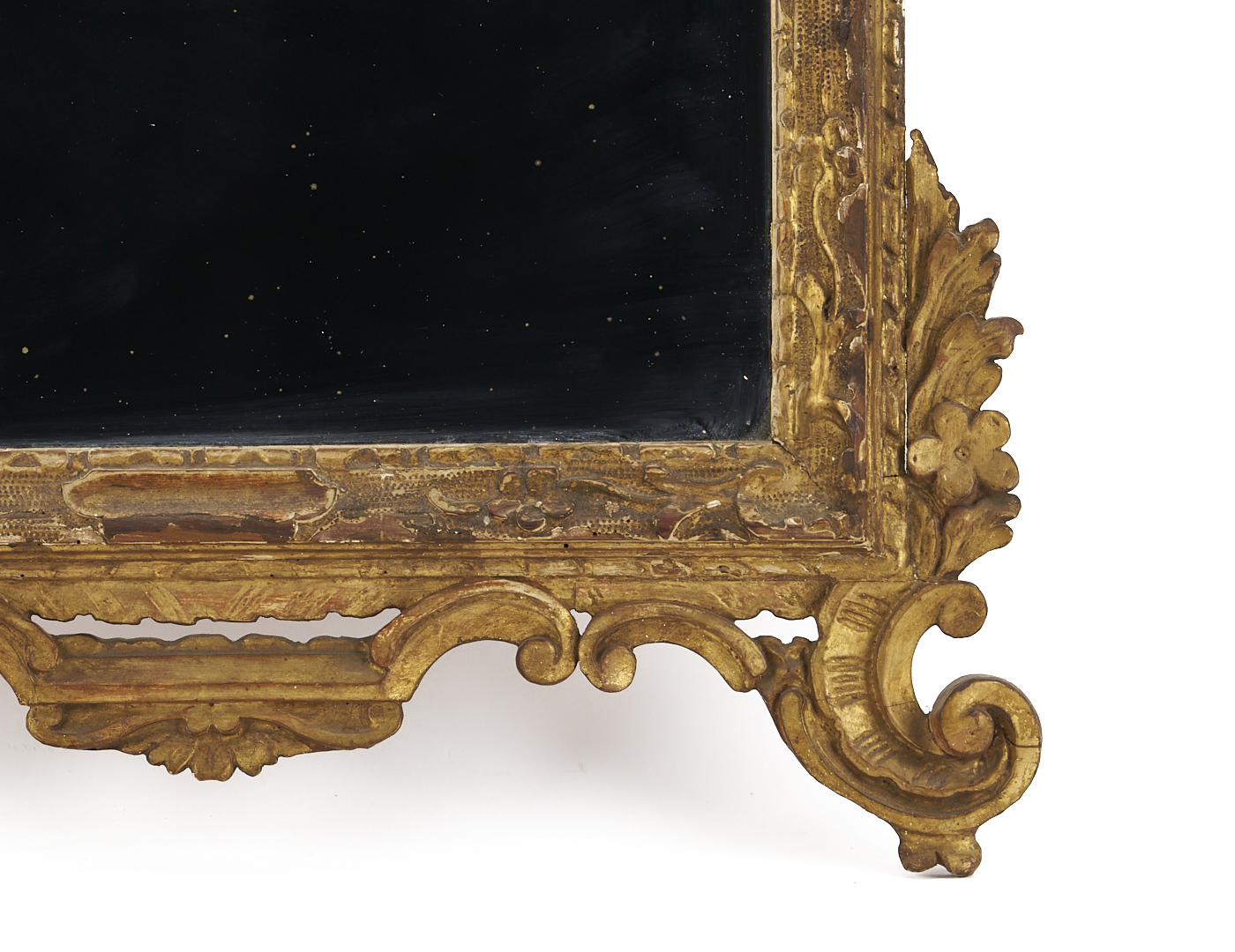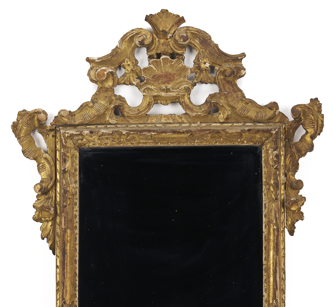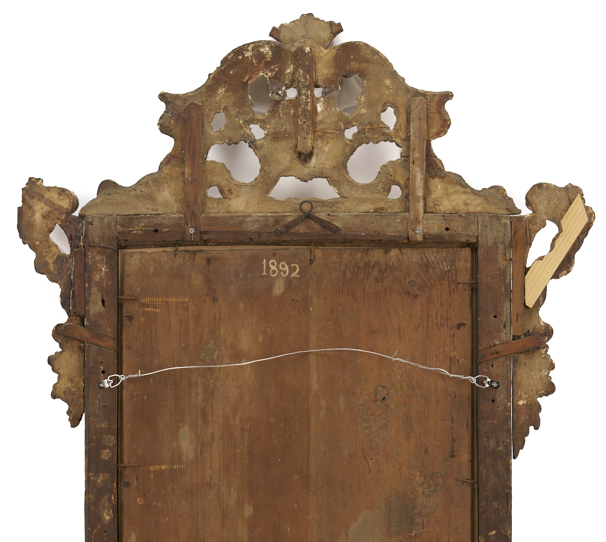 Mirror plate appears to be a modern replacement. Repaired breaks to both ears, lower corners, and other scattered areas; scattered areas of small losses to carving and gilding.